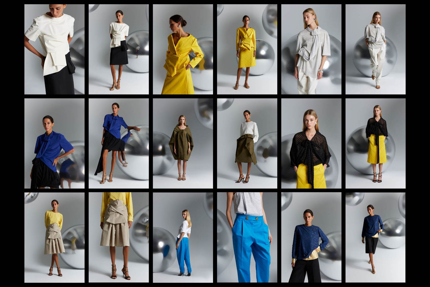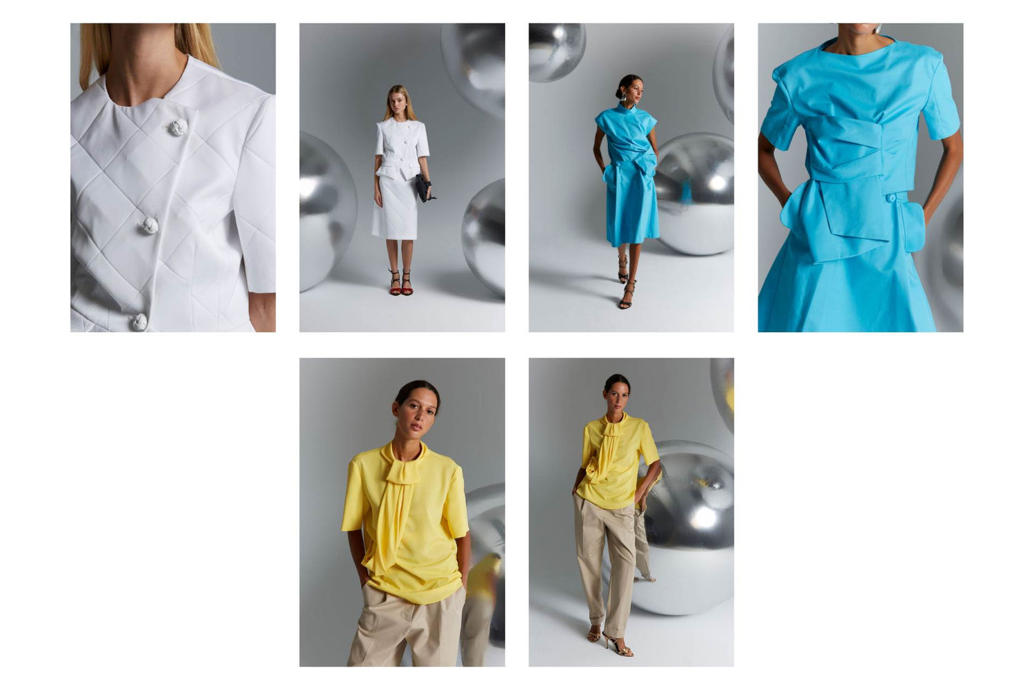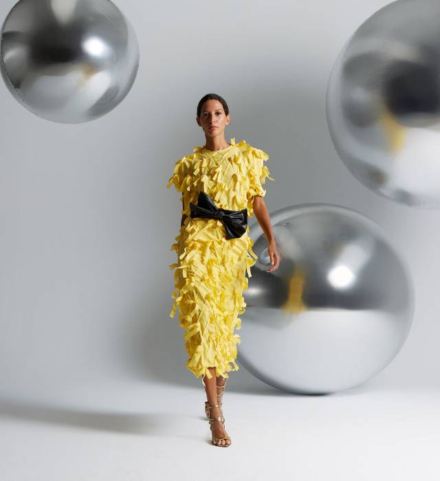 Strong, saturated, and striking colors like electric blue or yellow predominate, combined with neutral tones; thus obtaining a series of versatile garments for different occasions. Textures and prints are also major protagonists, with quilted garments, metallic tops, and fringed sets in the form of bows.