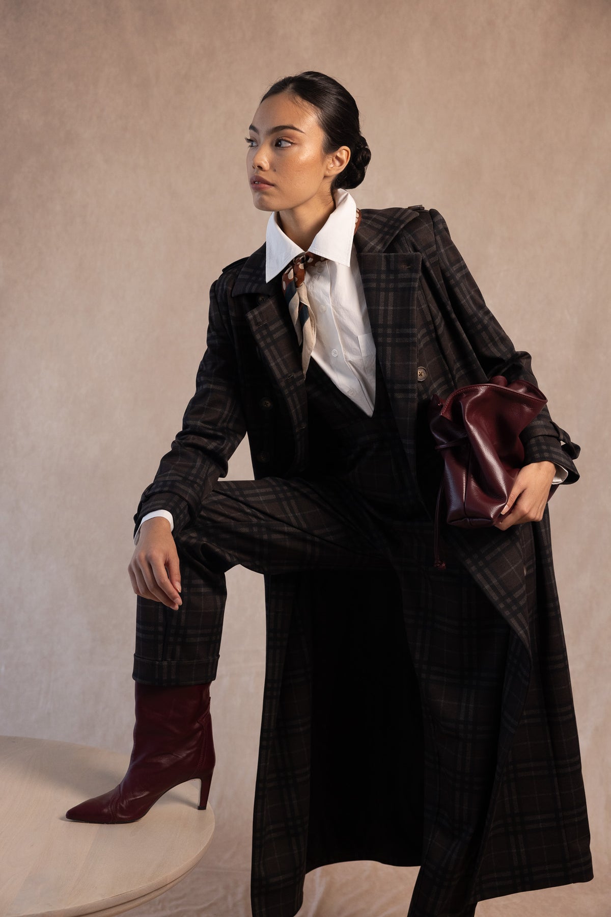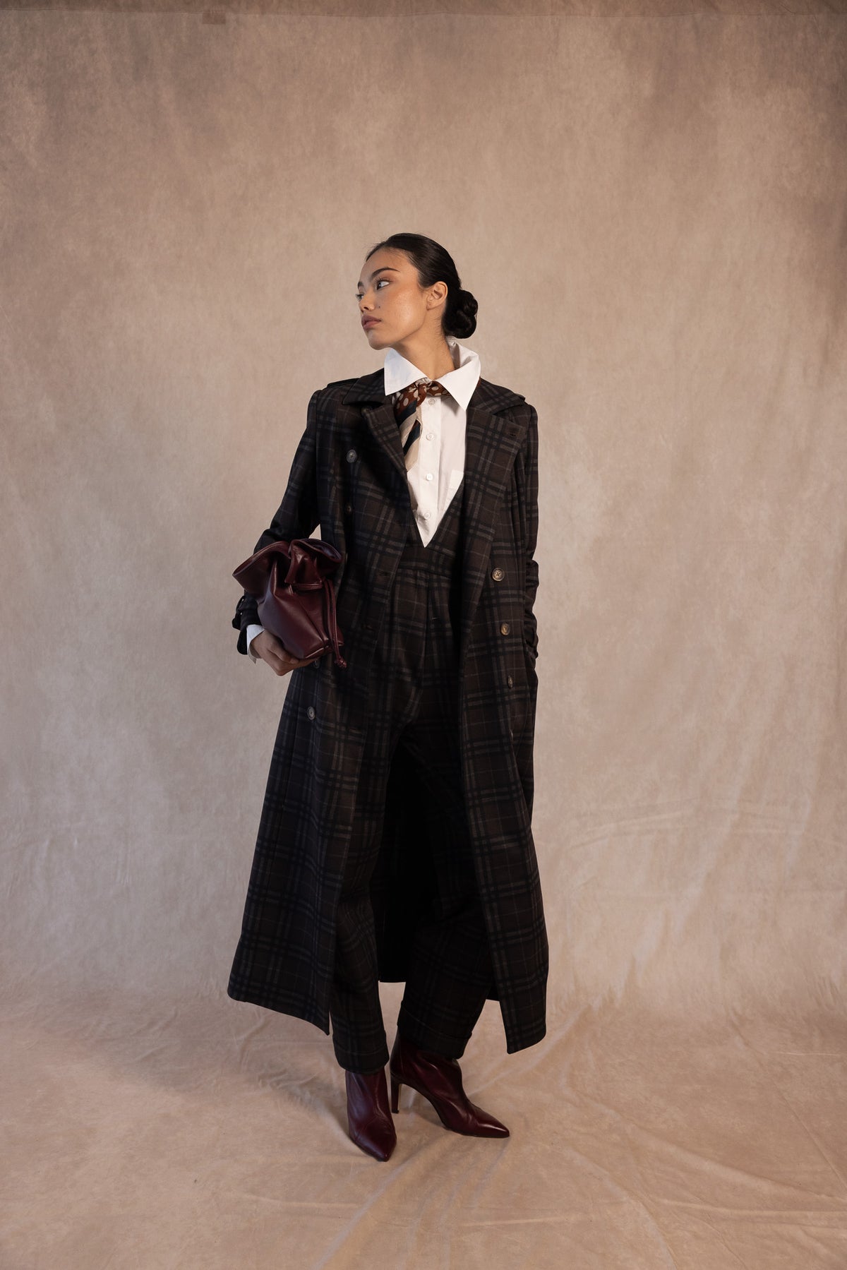The Coosy long plaid coat embodies the essence of refined, contemporary style. Crafted from a tailored fabric with a dark plaid pattern, this garment combines the precision of a classic cut with a fluid and powerful silhouette.