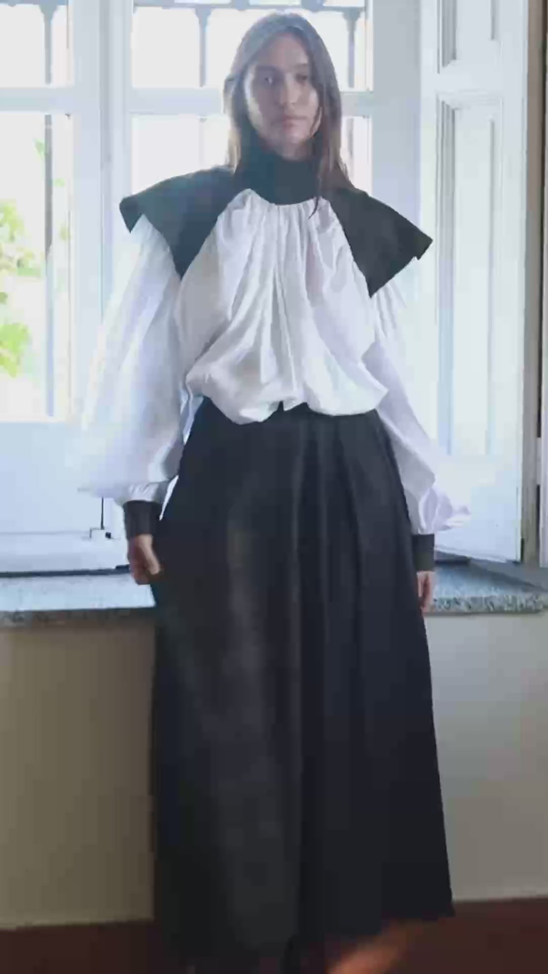 Crafted from high-quality cotton, this garment stands out for its structured sleeves, high neck with contrasting details, and a wide, plaid yoke that adds balance and visual impact. An exclusive piece that elevates any look, it's ideal for pairing with midi skirts or high-waisted trousers.