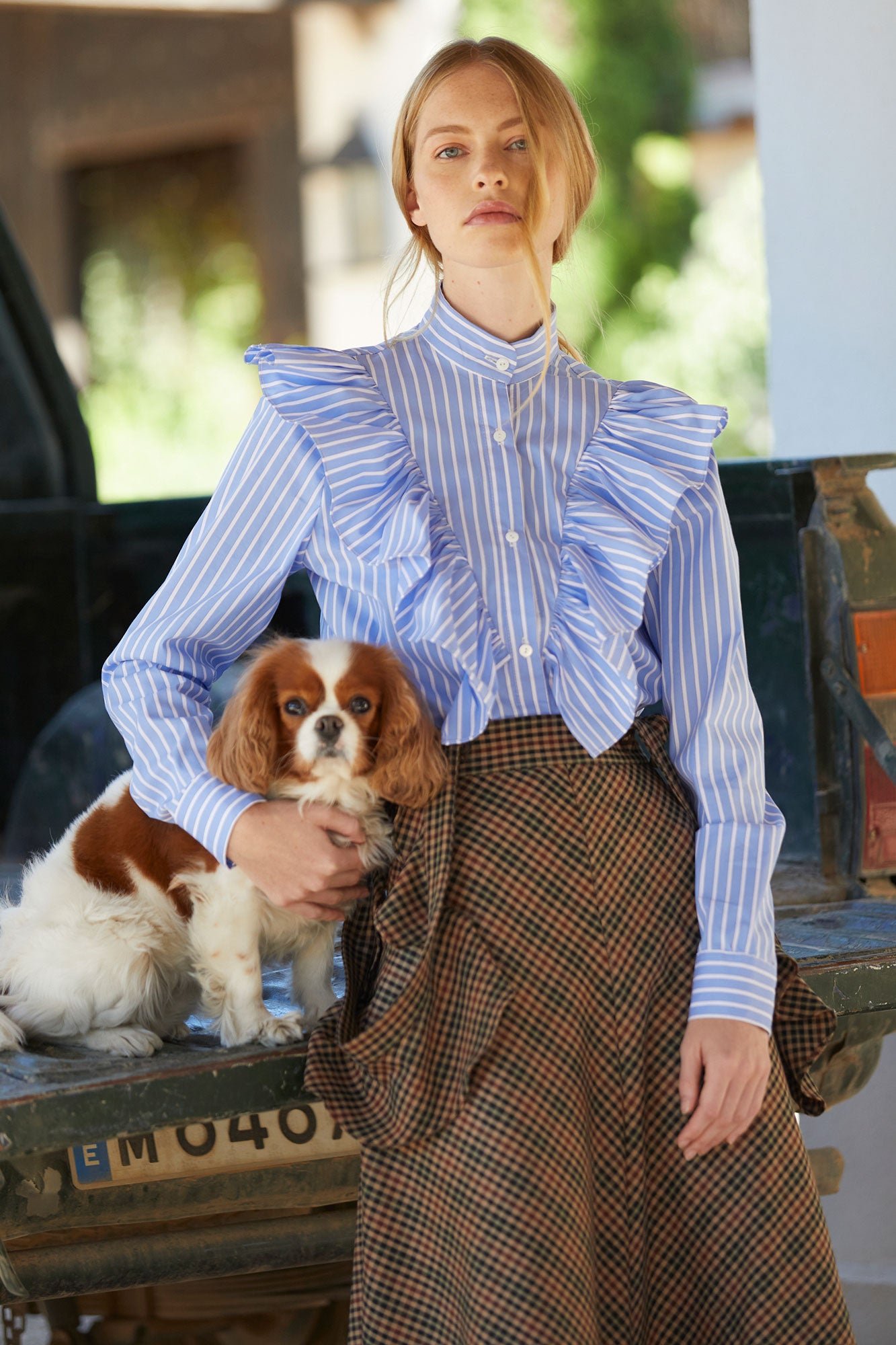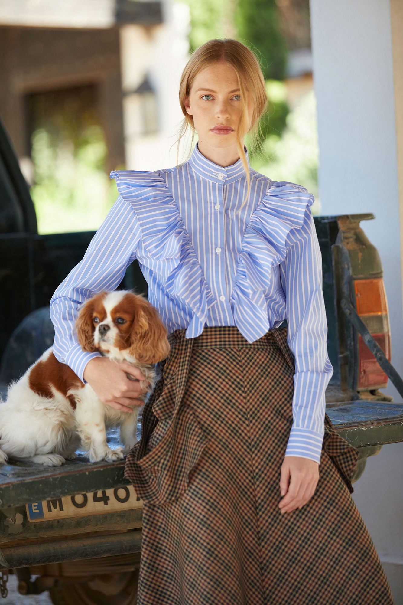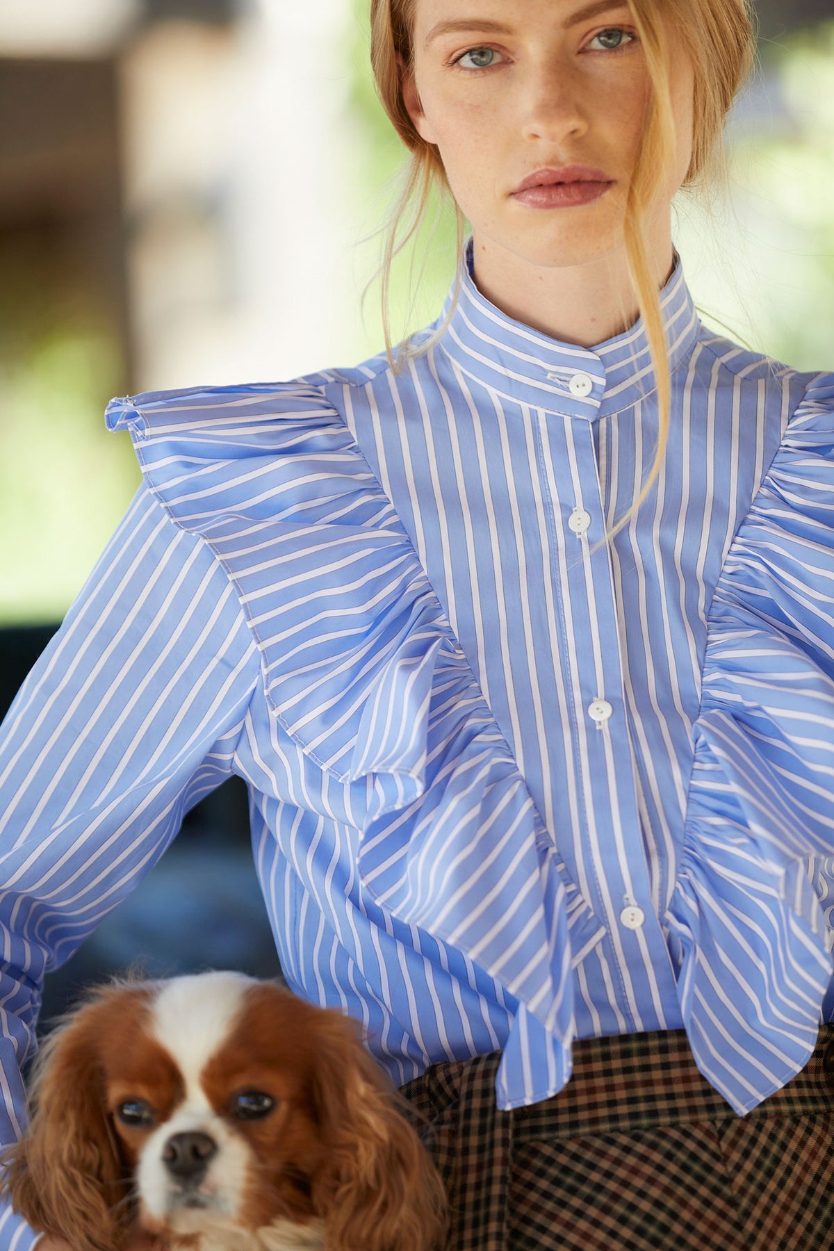 La Camisa Ares de Coosy es una prenda que combina la elegancia clásica con un aire contemporáneo. Confeccionada en tejido de rayas azules y blancas, destaca por sus volantes frontales y en los hombros, que aportan movimiento y un estilo femenino muy favorecedor. Su cuello mao y cierre con botones ocultos le dan un acabado pulido y sofisticado.