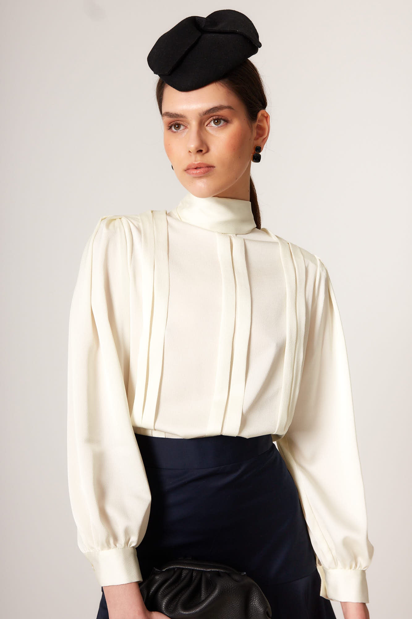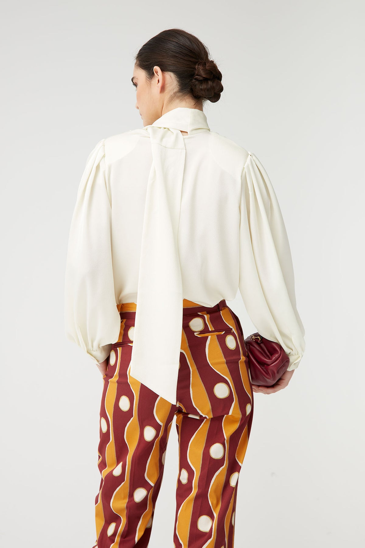 The Coosy Bow Shirt is a sophisticated garment that reinvents a classic wardrobe staple with a romantic and contemporary feel. Made from a light and airy fabric, its bow collar adds movement and delicacy, while the long, puffed sleeves create an elegant and feminine silhouette.