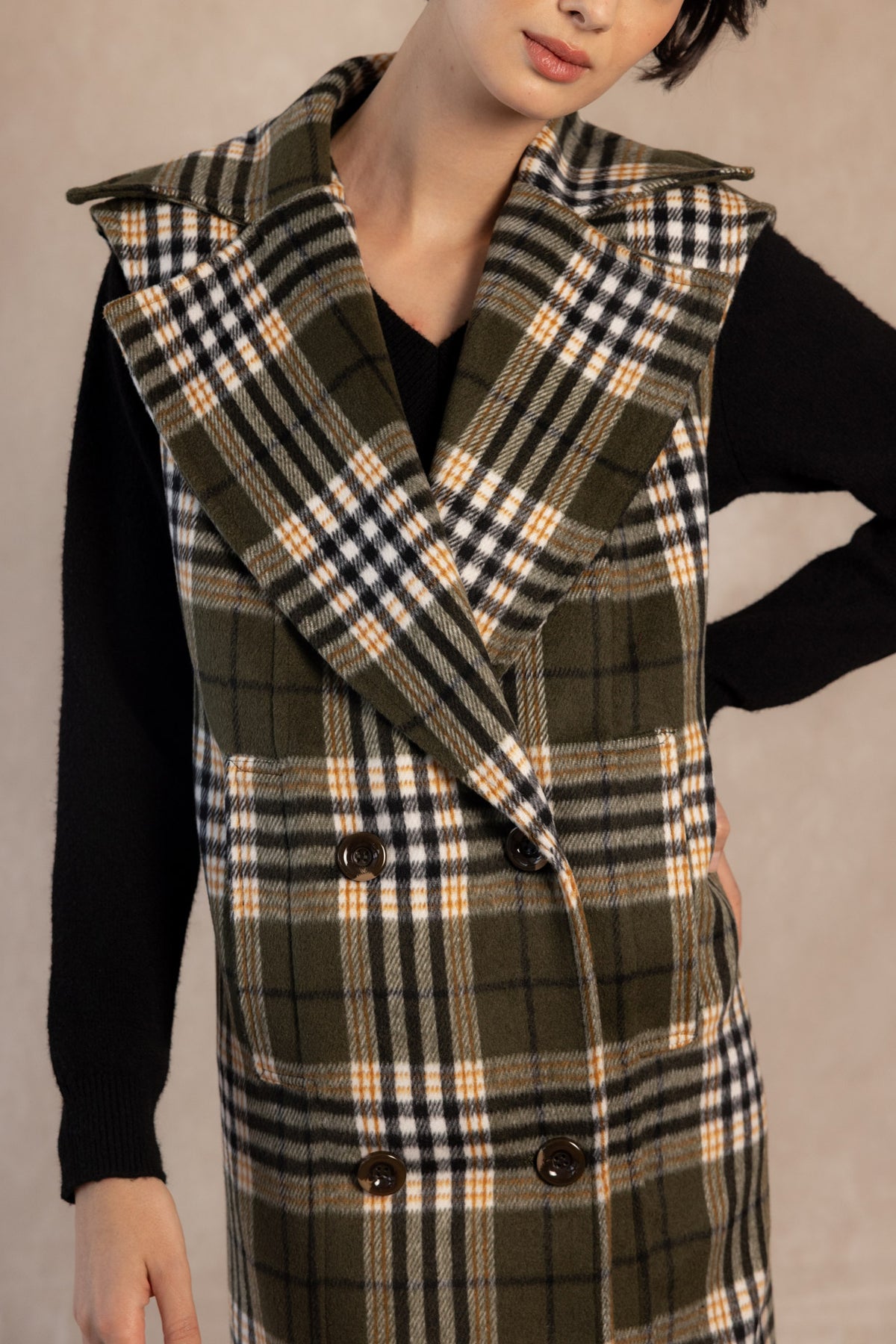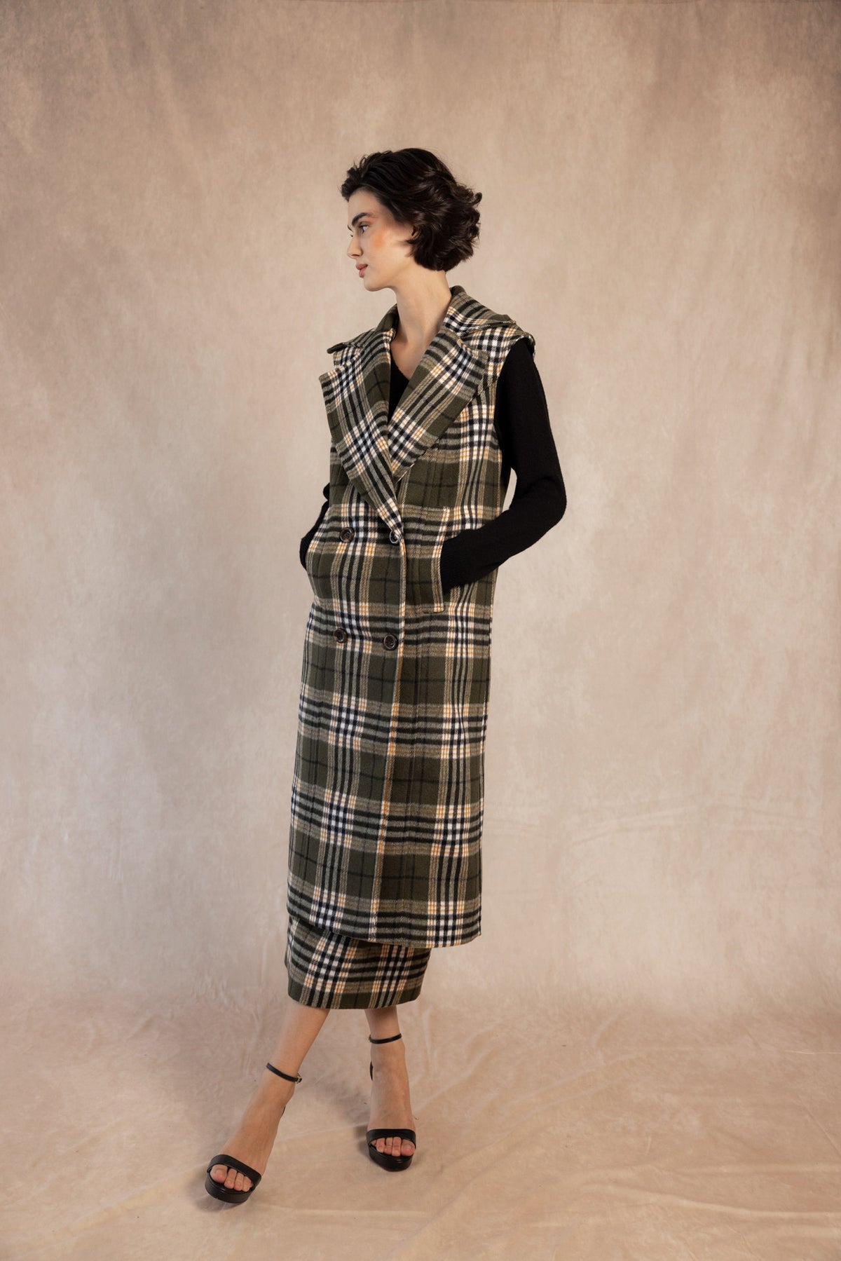 Con cuello solapa, doble botonadura y bolsillos laterales, este chaleco largo de cuadros combina funcionalidad y tendencia. Puedes llevarlo solo, con jersey debajo o junto a su falda Piero a juego, creando un total look sofisticado y lleno de carácter.