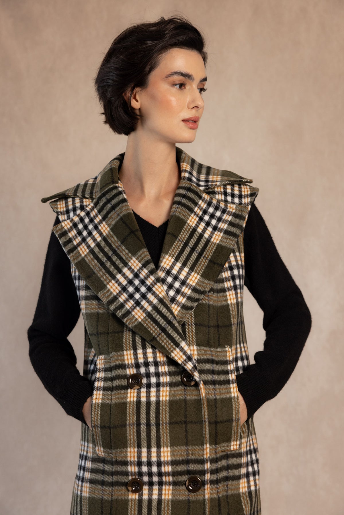 El Chaleco Piero Verde es la prenda perfecta para elevar tus looks de otoño-invierno con un toque de estilo británico y contemporáneo. Su diseño largo y estructurado, confeccionado en tejido de cuadros verdes y beige, aporta elegancia y personalidad a cualquier conjunto.