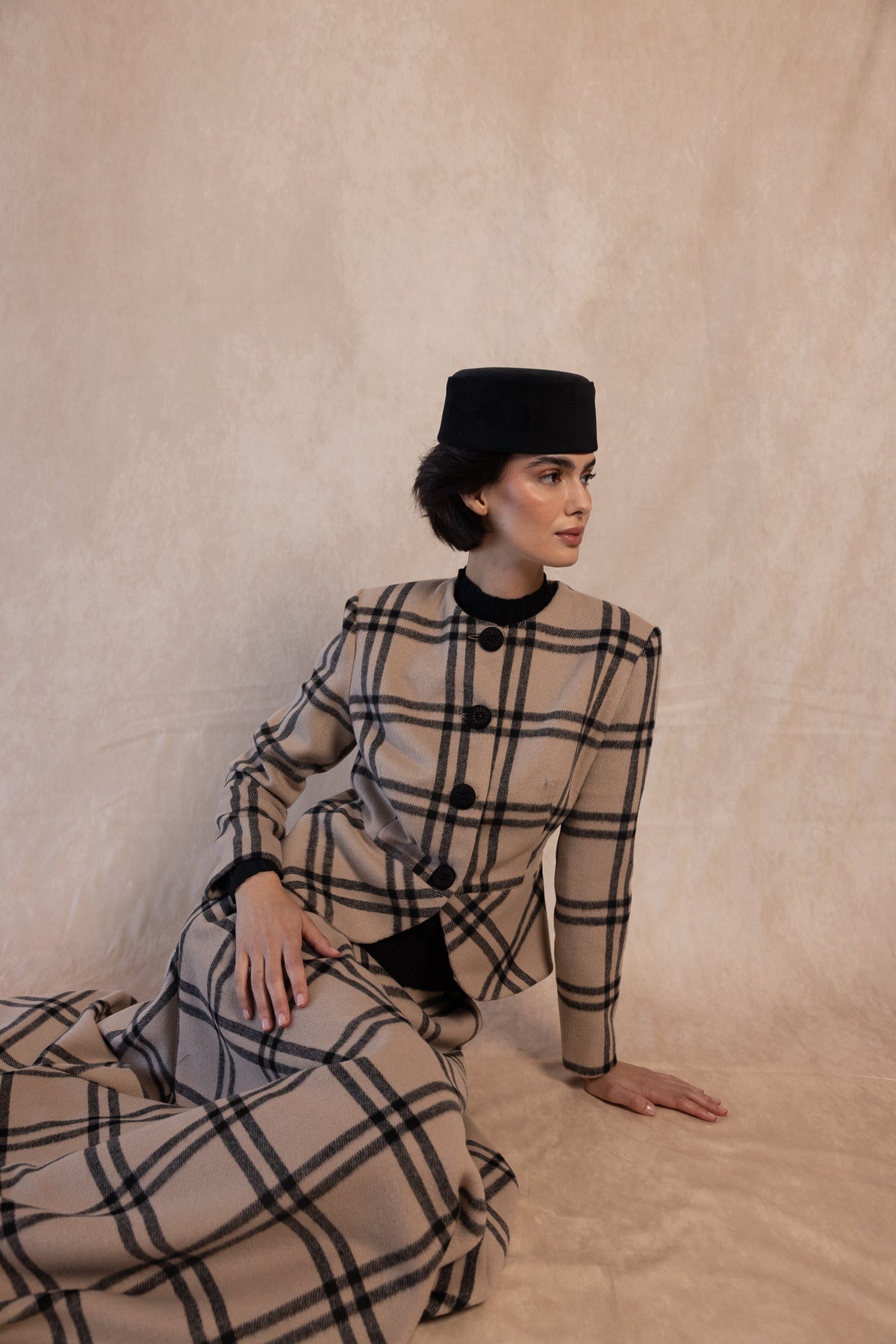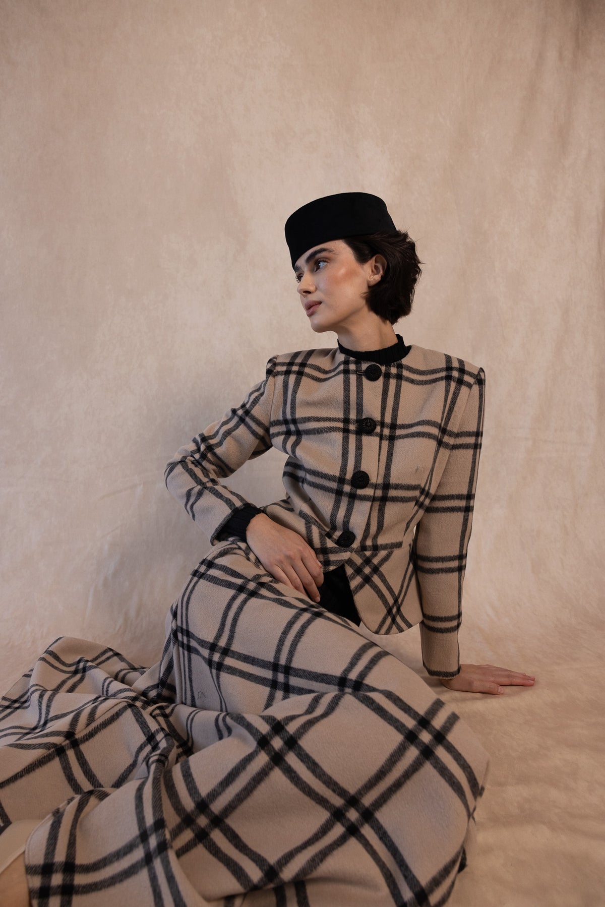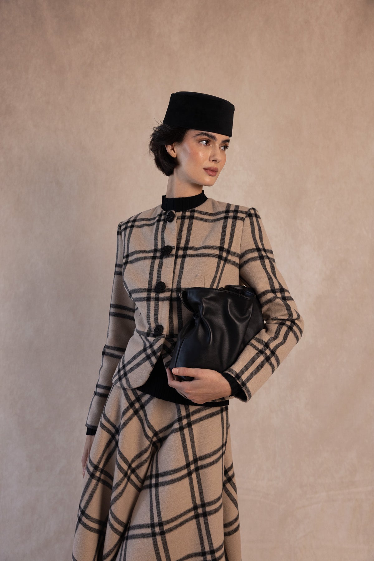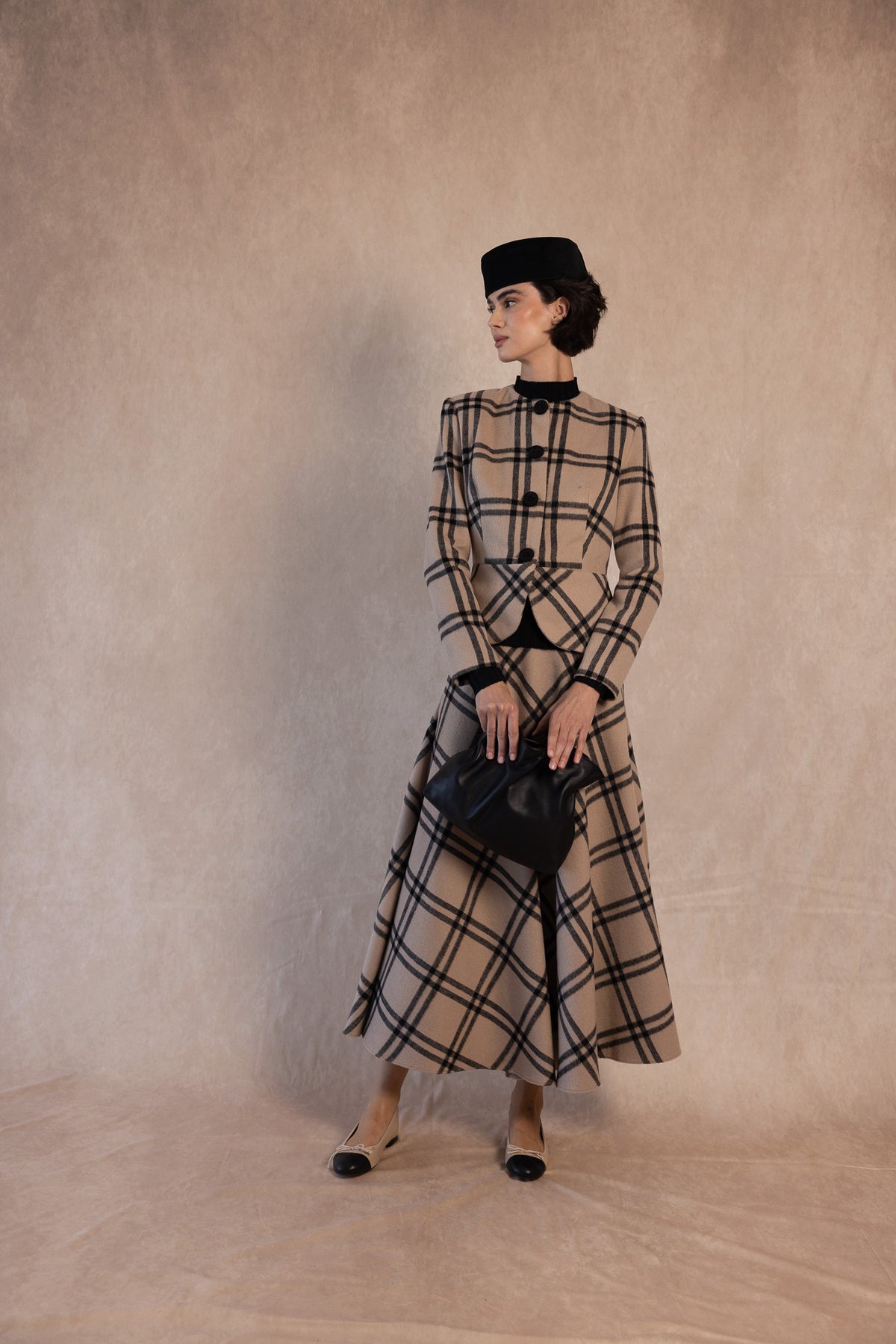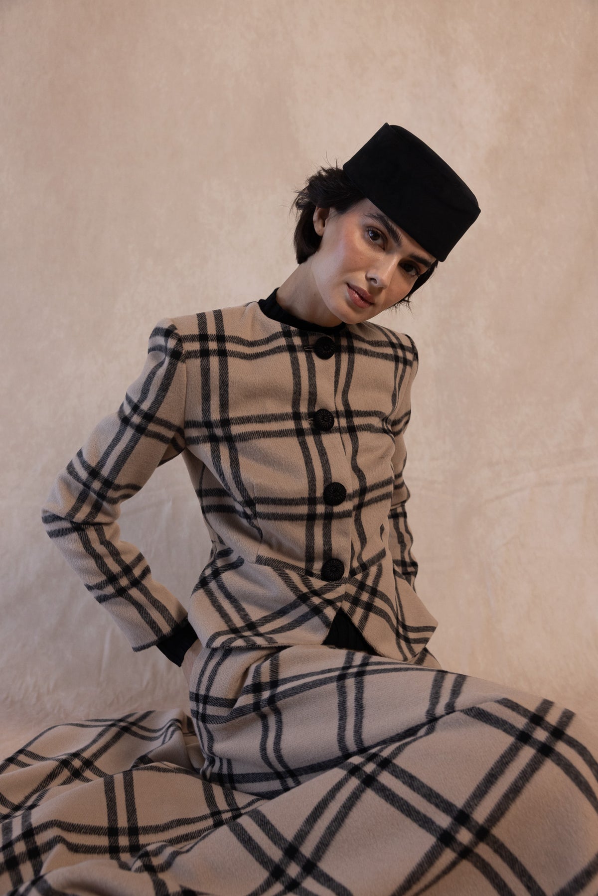 The Russell Jacket is an iconic garment that combines classic style with modern sophistication. Crafted from high-quality fabric with a neutral-toned plaid pattern, this structured jacket features a tailored fit, a front button closure with large buttons, and a subtle peplum design that flatters the feminine silhouette.