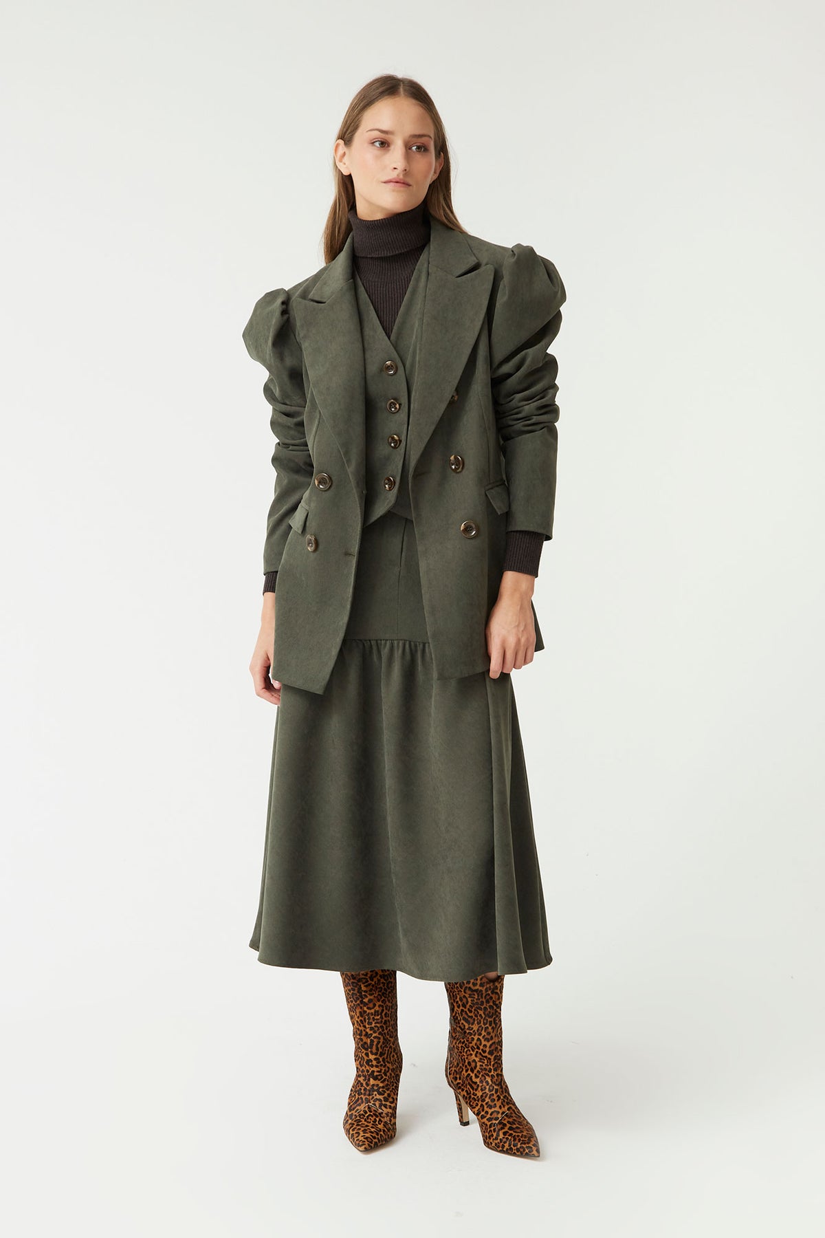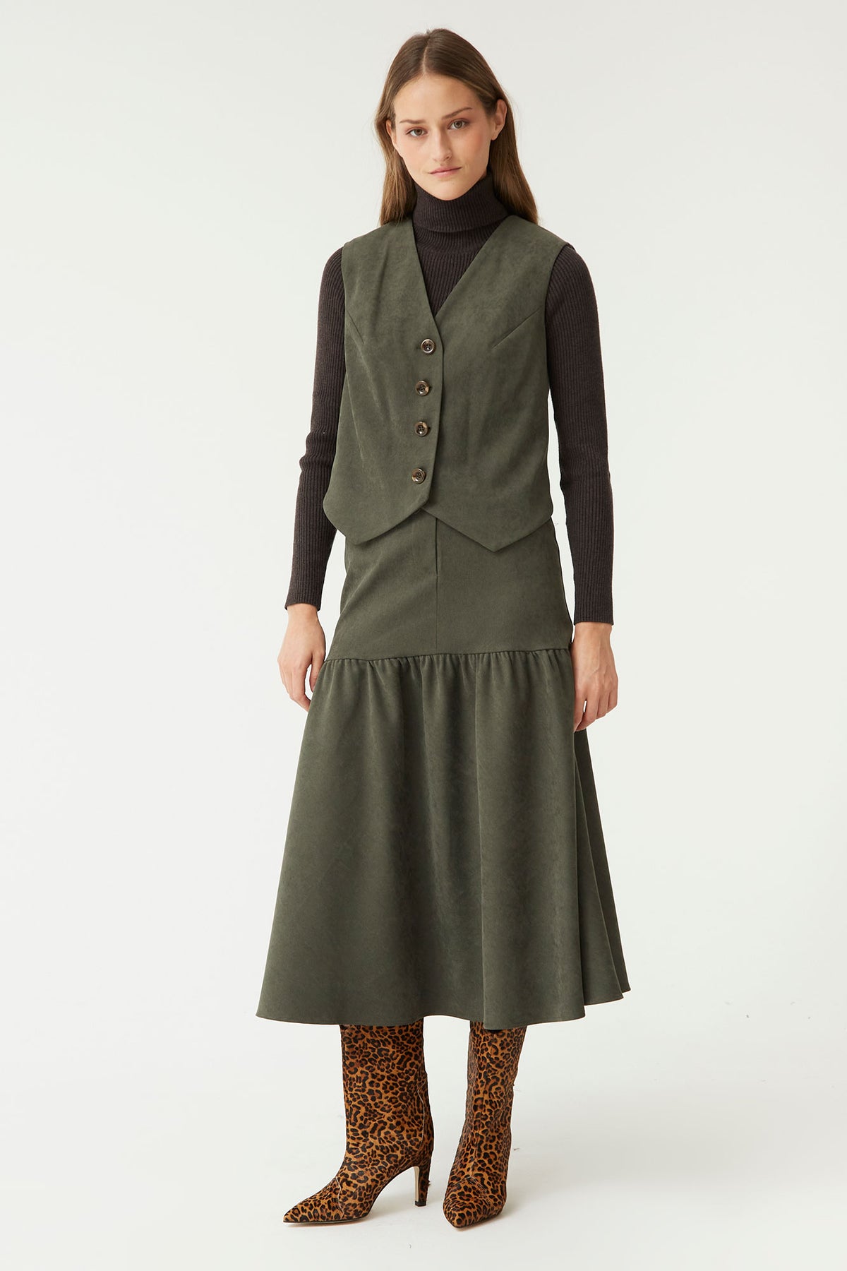 Elevate your style with our green Besso Skirt, perfect for any occasion. Made from a soft, structured fabric, this skirt stands out for its flared design and a high waist that enhances the figure. Its intense khaki green color combines perfectly with any top or jacket, making it a versatile and timeless piece.