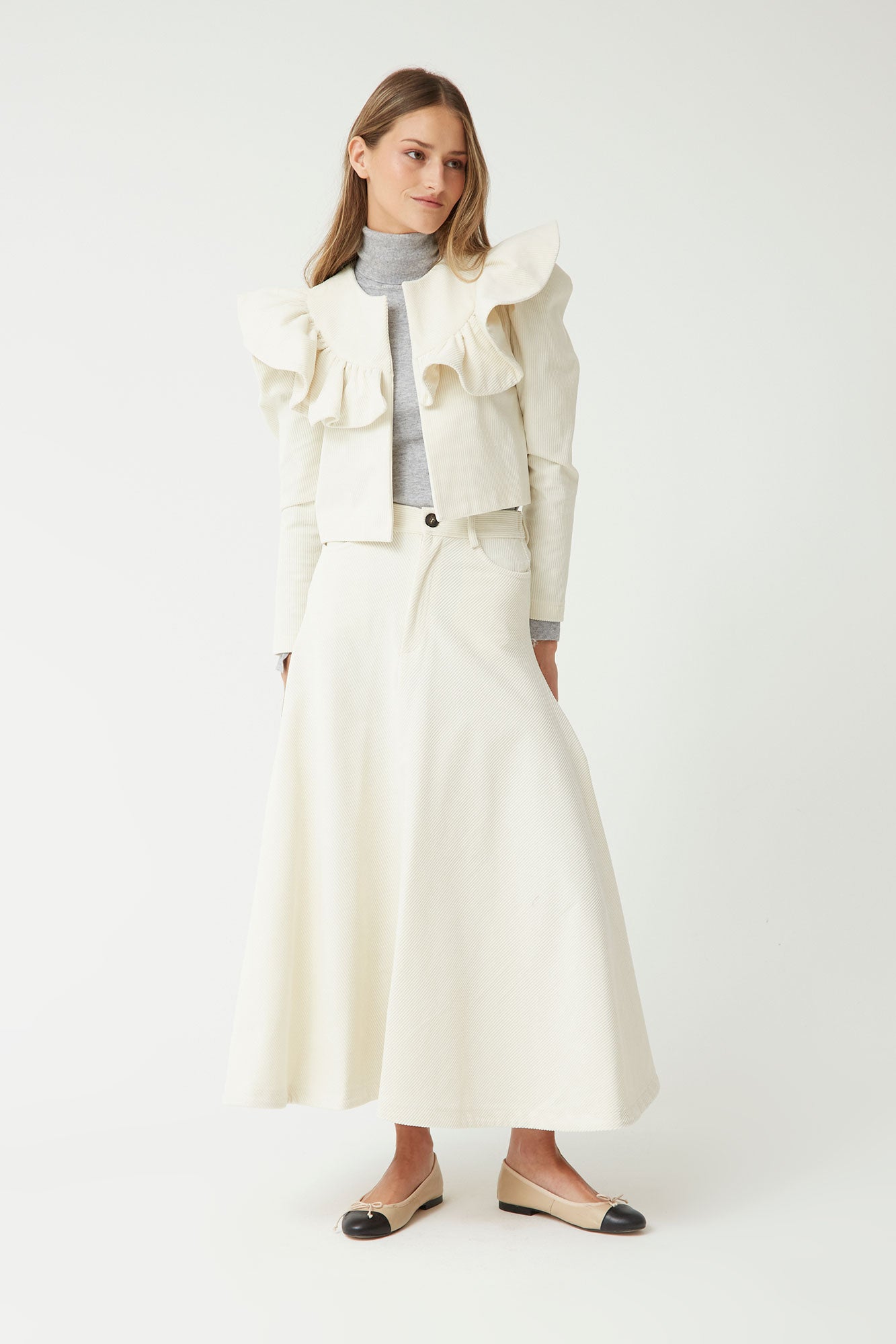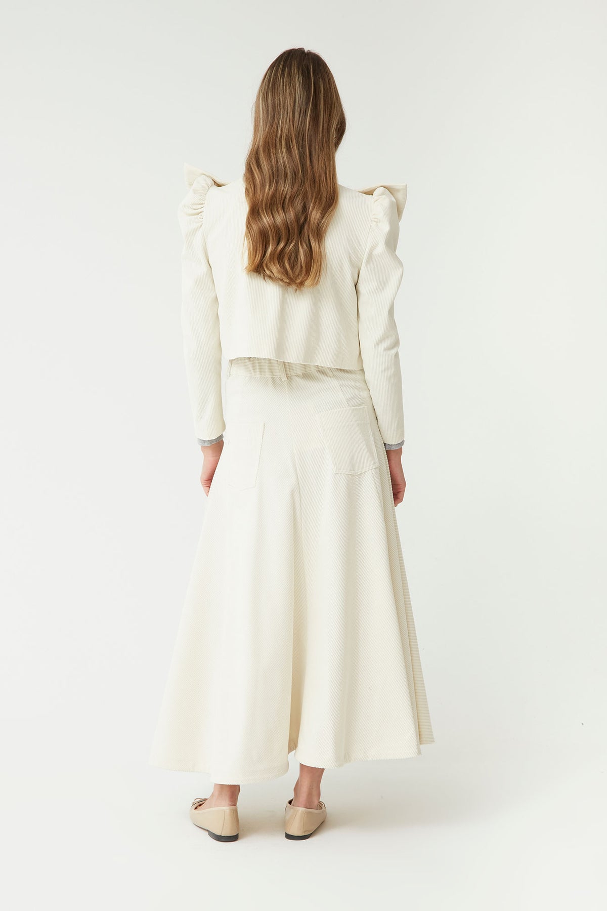 La falda larga de pana blanca de Coosy es una prenda versátil y sofisticada que combina elegancia, comodidad y estilo atemporal. Confeccionada en una pana fina y suave, destaca por su corte largo y ligeramente acampanado, que aporta movimiento y una silueta femenina y favorecedora.