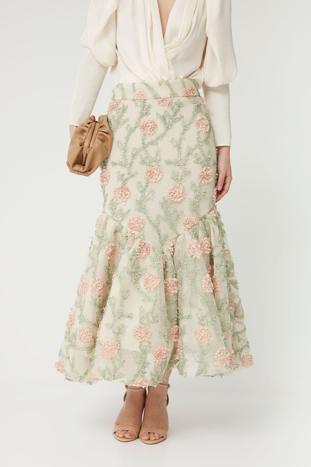 Su corte midi y el volante en el bajo aportan dinamismo y volumen, creando una silueta favorecedora que acompaña el movimiento al caminar. El delicado estampado floral en tonos suaves refuerza su carácter elegante y atemporal, convirtiéndola en una opción ideal tanto para eventos como para looks más arreglados de día.