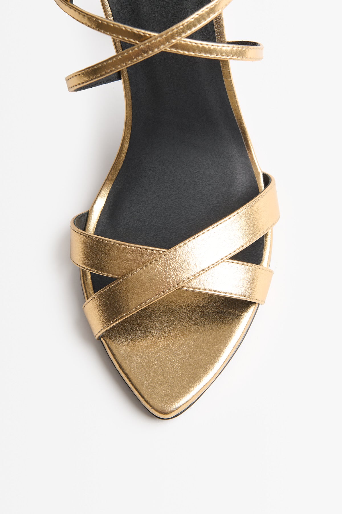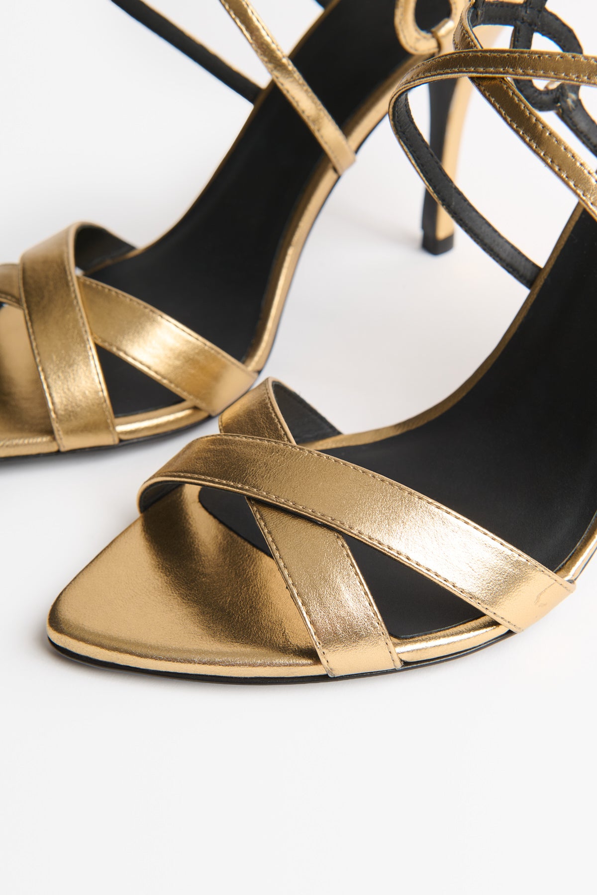 Their high, slender heel visually elongates the silhouette, while the crisscrossing straps with ankle buckle closure ensure a comfortable and elegant fit. The open, minimalist design makes these sandals a versatile piece for weddings, celebrations, or evening looks.