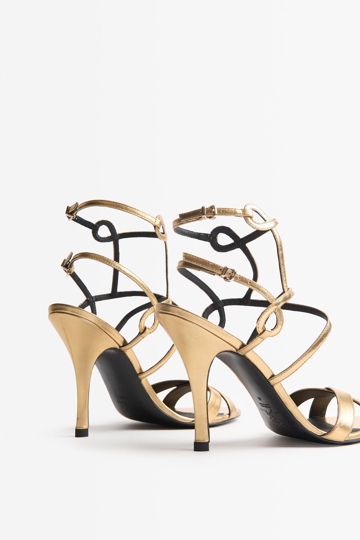 Gold heeled sandals are the perfect accessory to elevate any guest or special event look. With a sophisticated design of delicate, interwoven straps and a metallic gold finish, these sandals elongate the foot and add a touch of sparkle to dresses and party outfits.