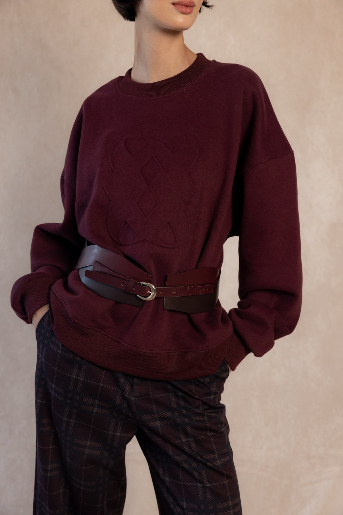 Su corte relajado de inspiración oversize, el cuello redondo y los acabados en canalé crean una silueta moderna y versátil, ideal para tus looks de entretiempo. El tono burdeos profundo añade calidez y estilo, perfecto para combinar con faldas, pantalones de vestir o jeans.