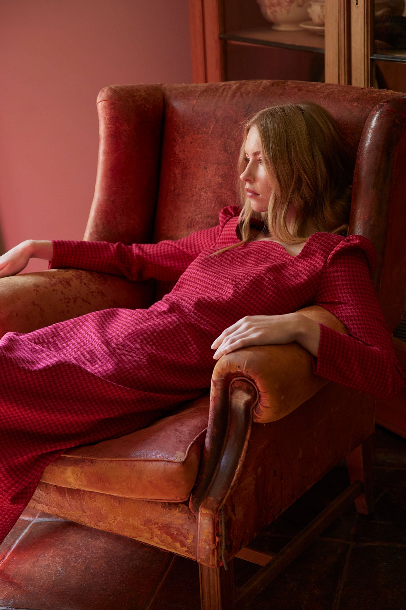 El Vestido Antolina de Coosy encarna la sofisticación más sutil y femenina. Confeccionado en un tejido estructurado con un delicado microcuadro en tono rojo intenso, esta pieza destaca por su escote cuadrado, sus mangas con volumen en los hombros y su silueta larga y entallada que estiliza la figura con elegancia.