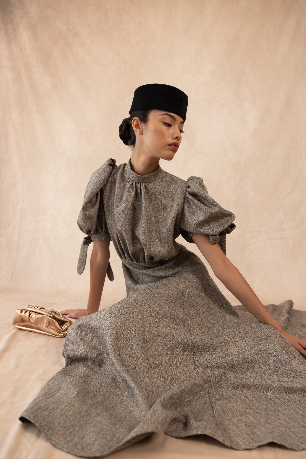 Coosy's grey dress is an ode to modern sophistication. Crafted from a textured fabric with an impeccable drape, it stands out for its midi length and high, gathered neckline, which lend a refined and timeless air.