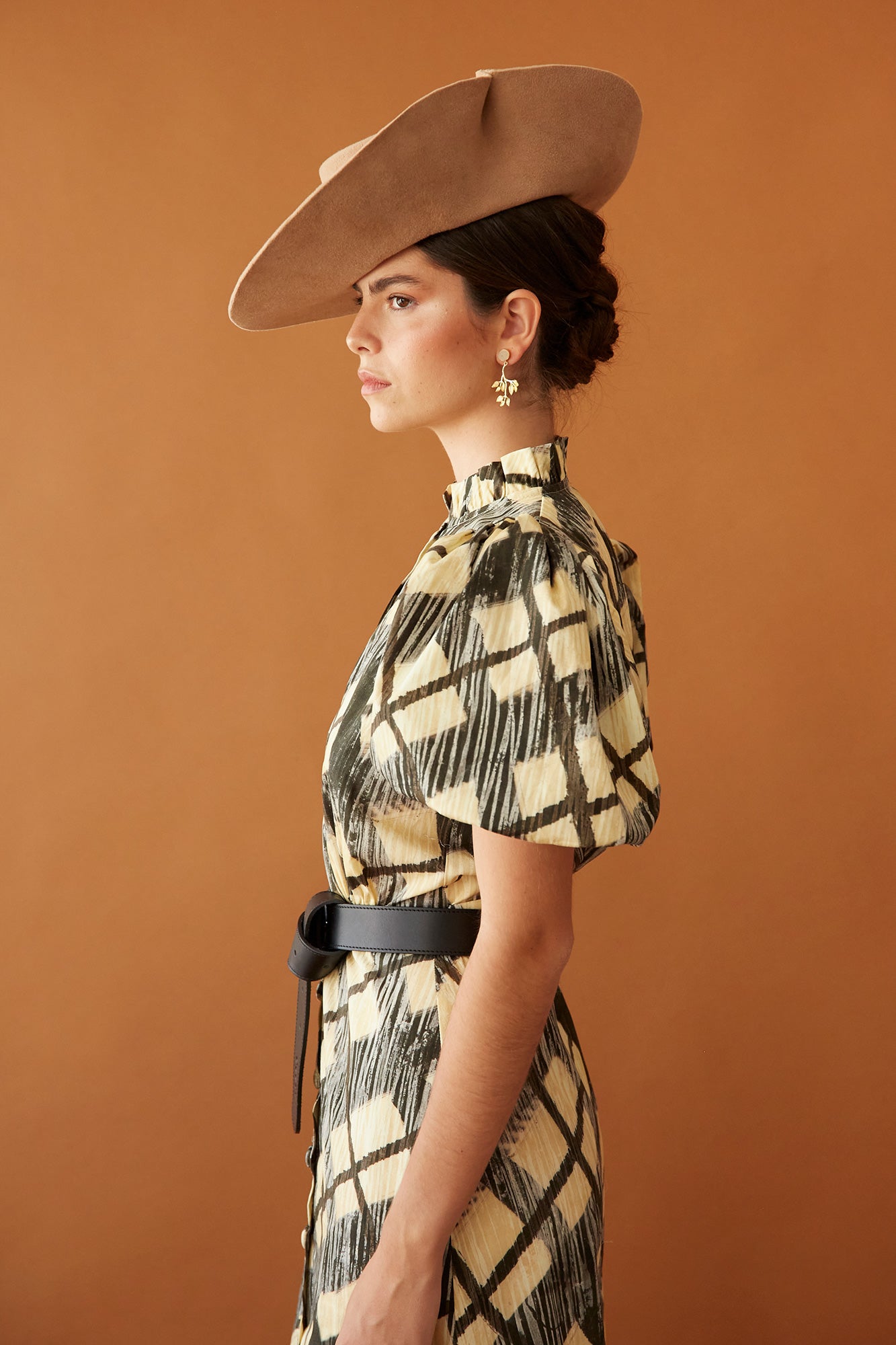 In the photo, we pair it with a wide black belt, high-heeled sandals, and a structured beige hat, creating an editorial look with plenty of character and a sophisticated country touch. Perfect for daytime events, unique guests, or a special weekend look.