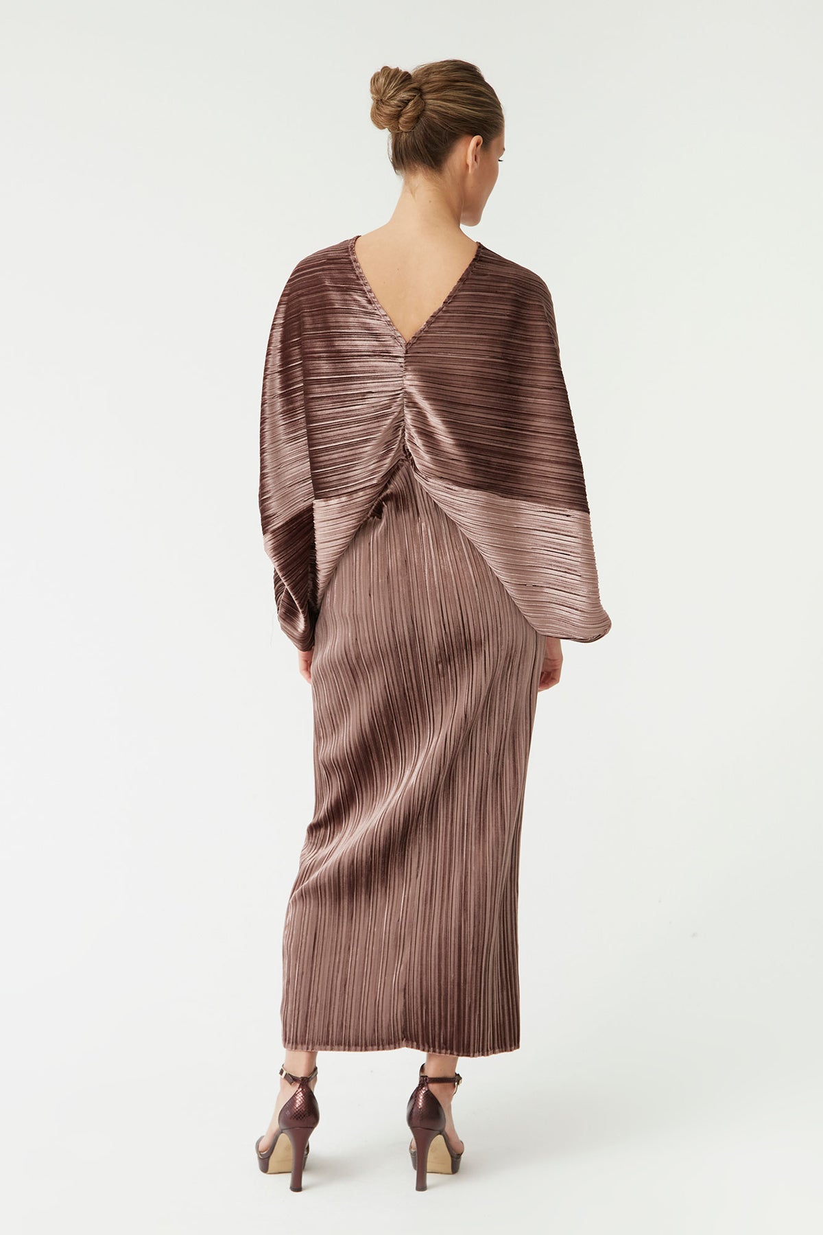 This Coosy maxi dress is the perfect garment for those seeking a blend of elegance and comfort. Crafted from a soft velvet fabric, it features vertical pleats that add dynamism and sophistication. Its flowing design, with a V-neck and draped details at the front, creates a flattering silhouette, ideal for formal events or a night out.