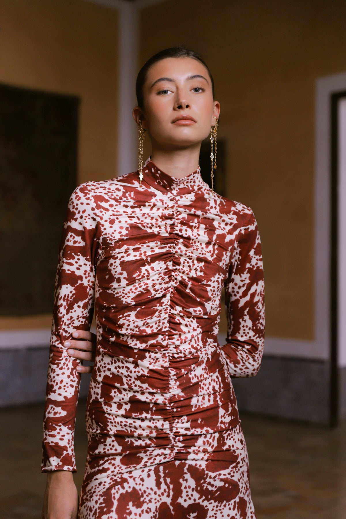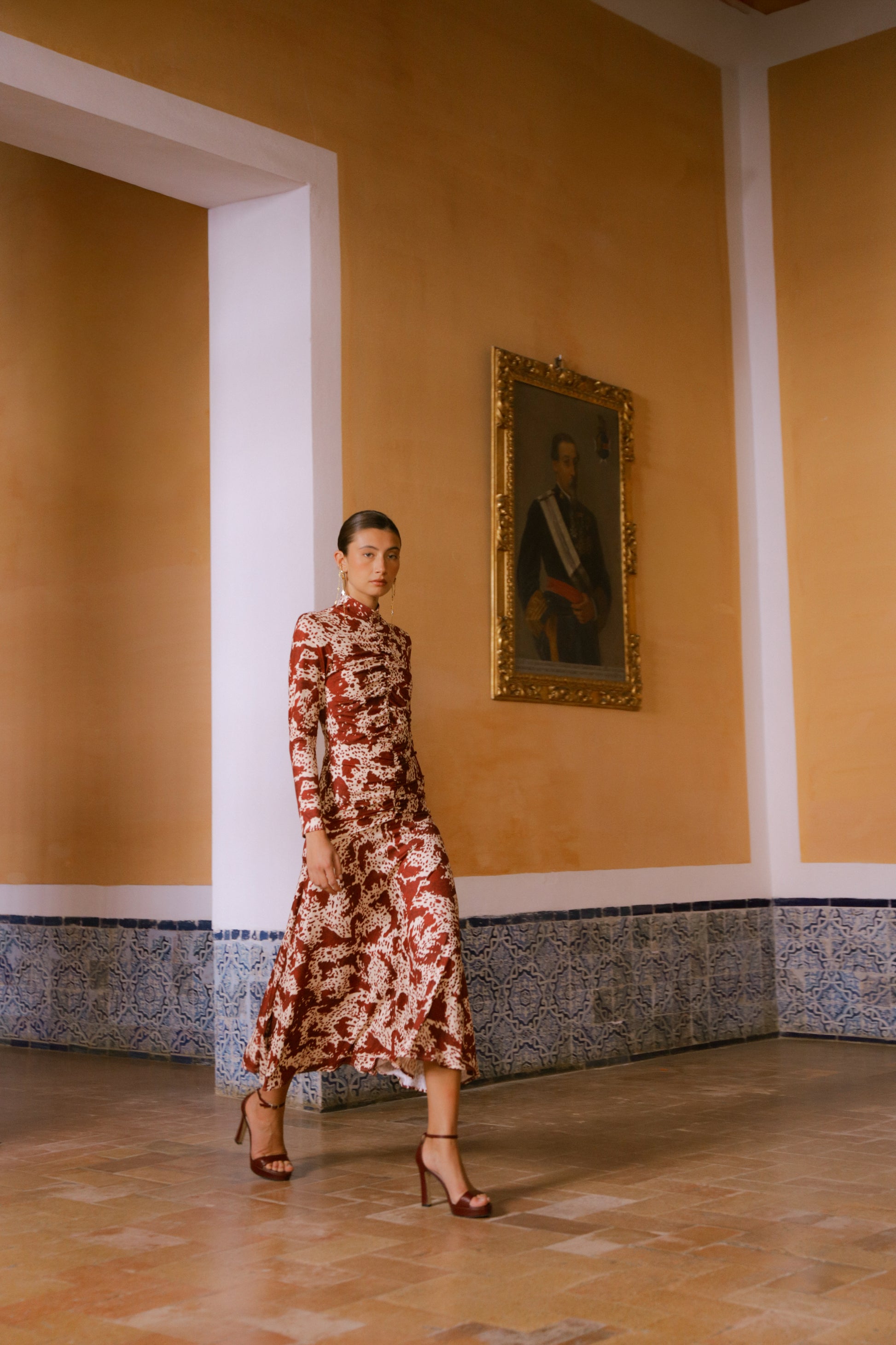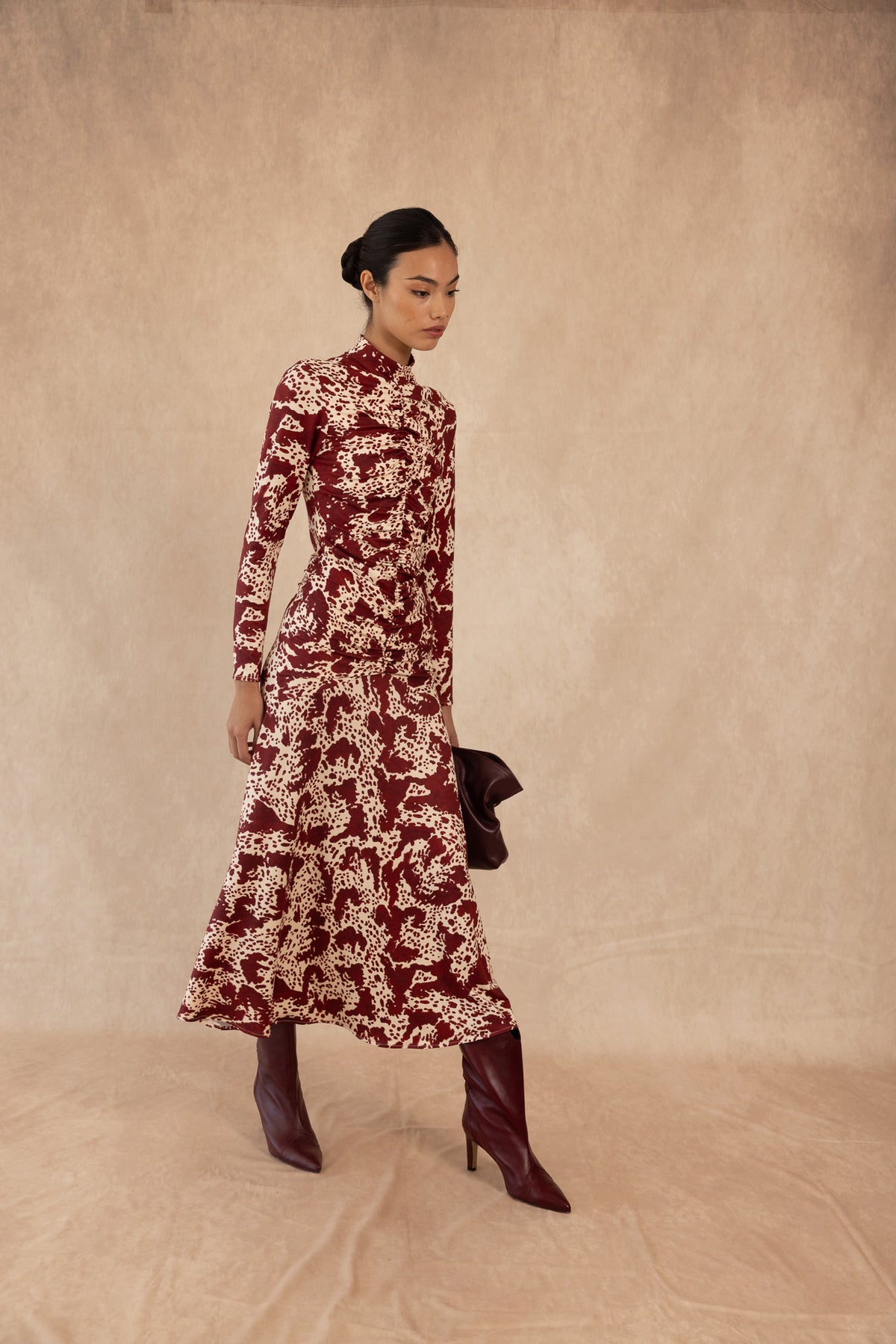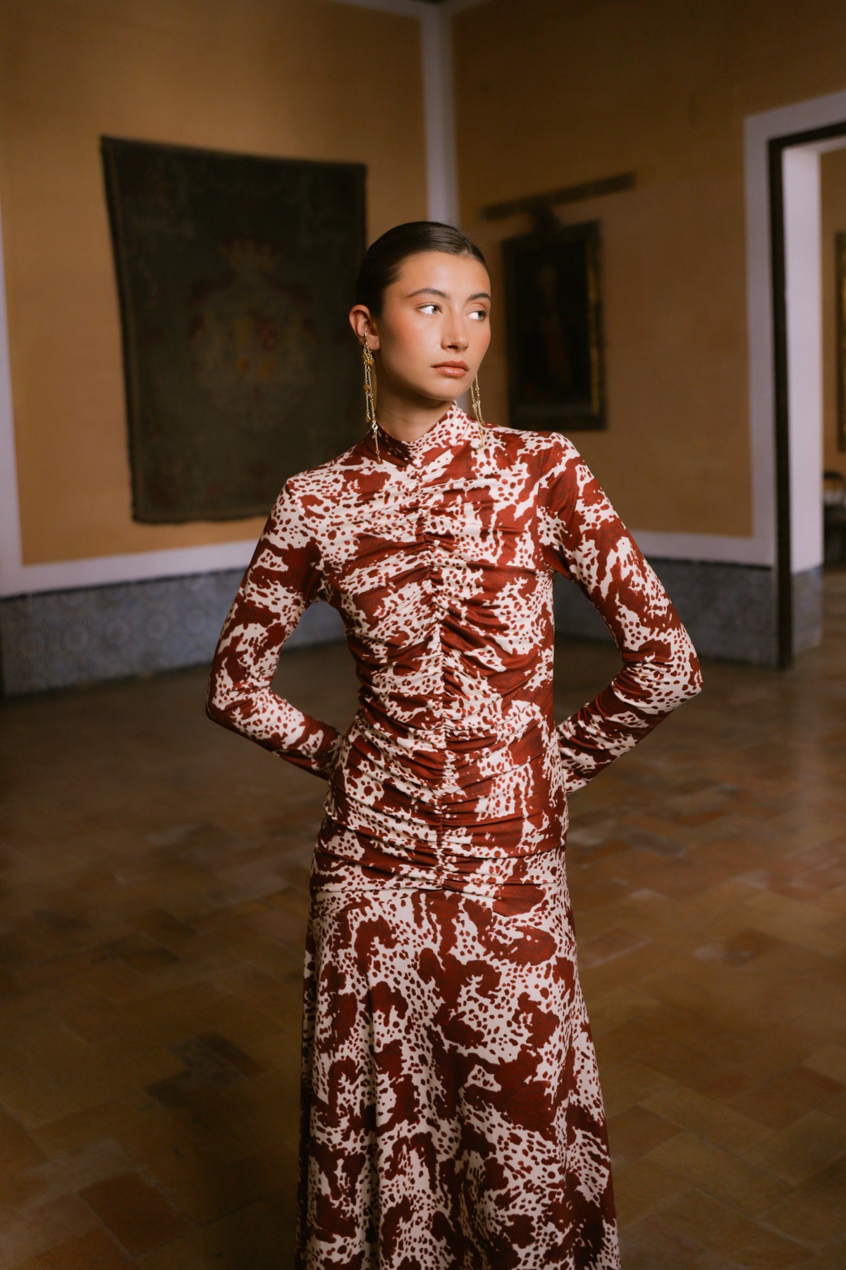 The Sora dress by Coosy is a style statement that combines sophistication, femininity, and character. Crafted from a flowing fabric with an exquisite ivory contrast print, this piece stands out for its high neckline, fitted cut, and subtly flared skirt, which add movement and harmony to the silhouette.