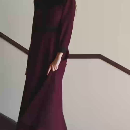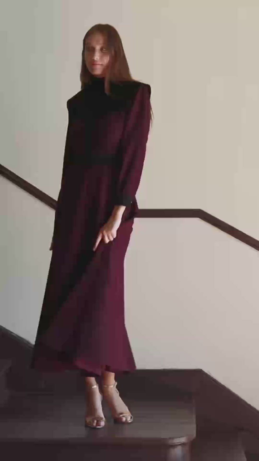 Its high neckline, slightly puffed sleeves, and flowing midi skirt make it a versatile garment, ideal for both autumn and winter events, as well as dinners or special gatherings. An exclusive design from the Coosy Studio Vol. III collection, it fuses the brand's classic spirit with a modern, minimalist touch.