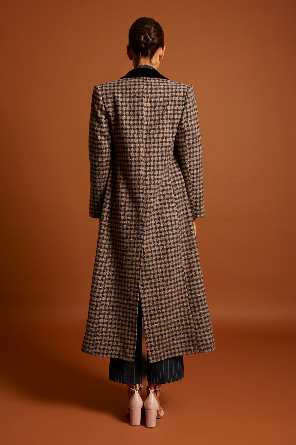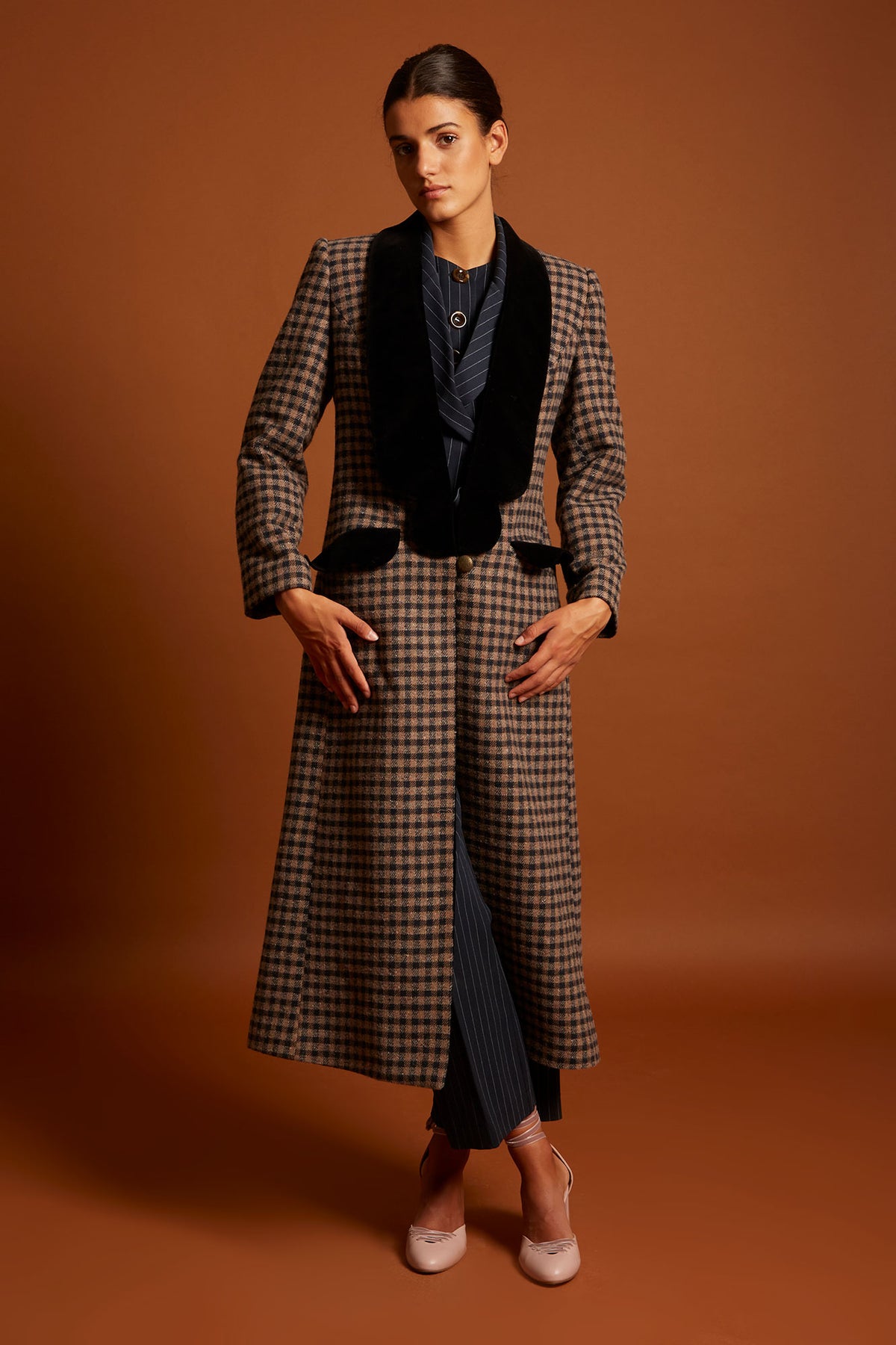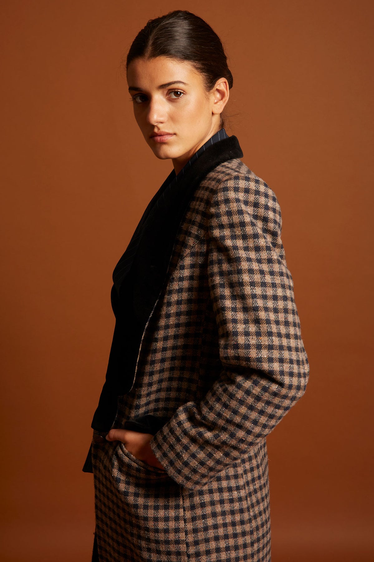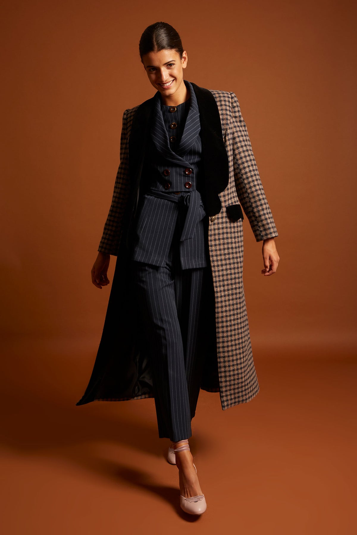 Renueva tu fondo de armario con el Abrigo Gaspari en azul marino, una pieza única confeccionada en España que aúna sofisticación y diseño atemporal. Este abrigo largo de corte sastre presenta un elegante estampado de cuadros en tonos marrones y marino, con solapas anchas en terciopelo negro que aportan un contraste de lo más chic.