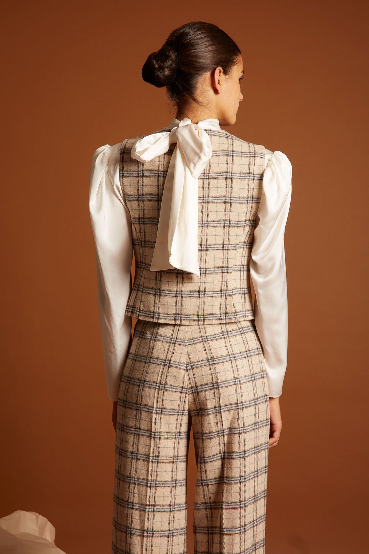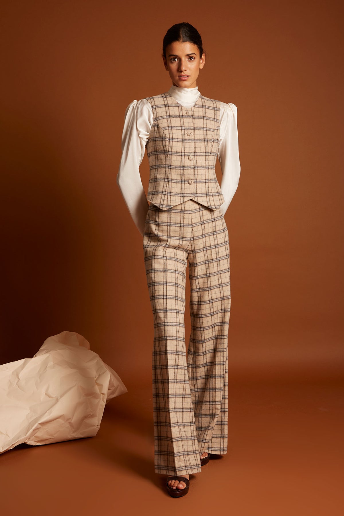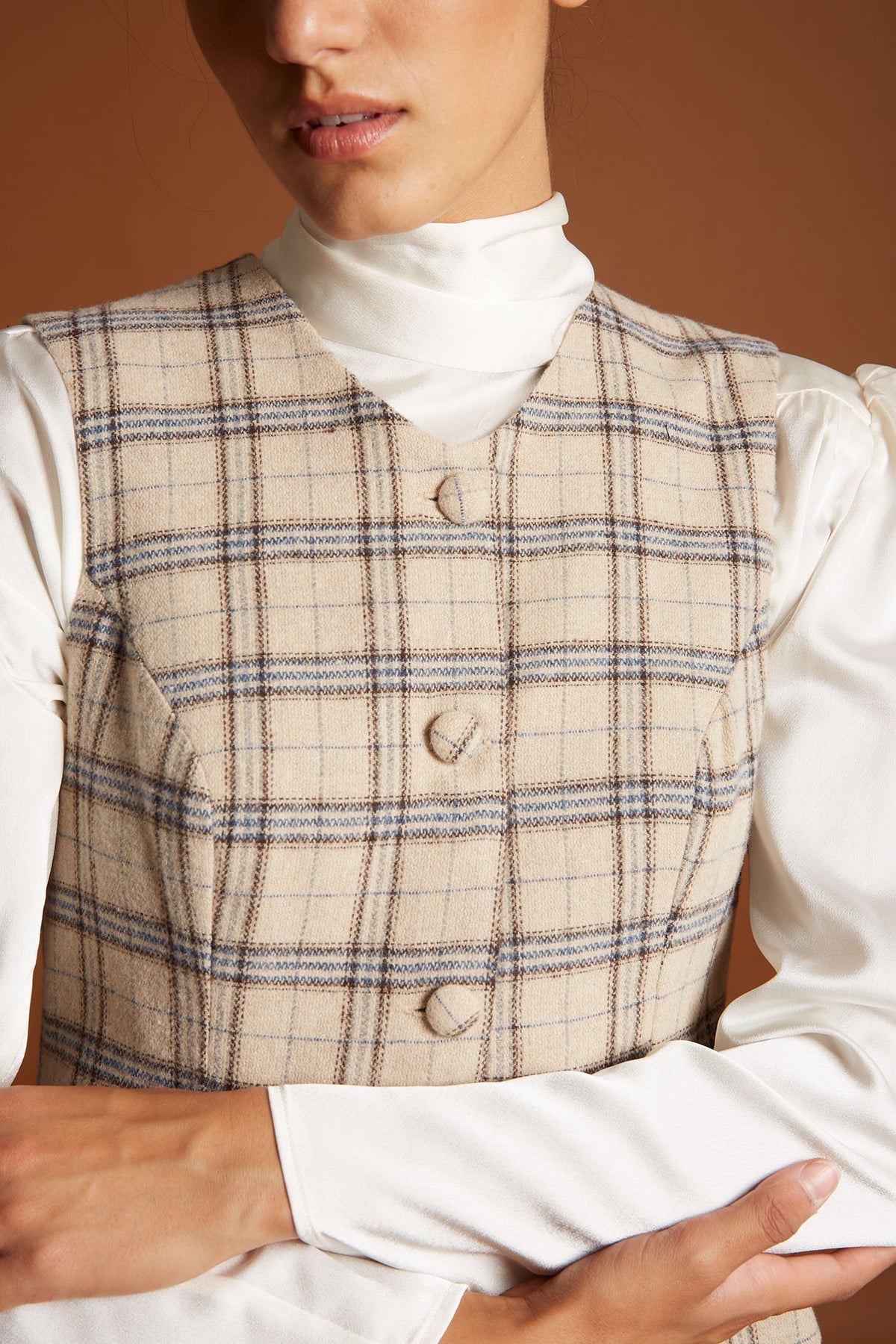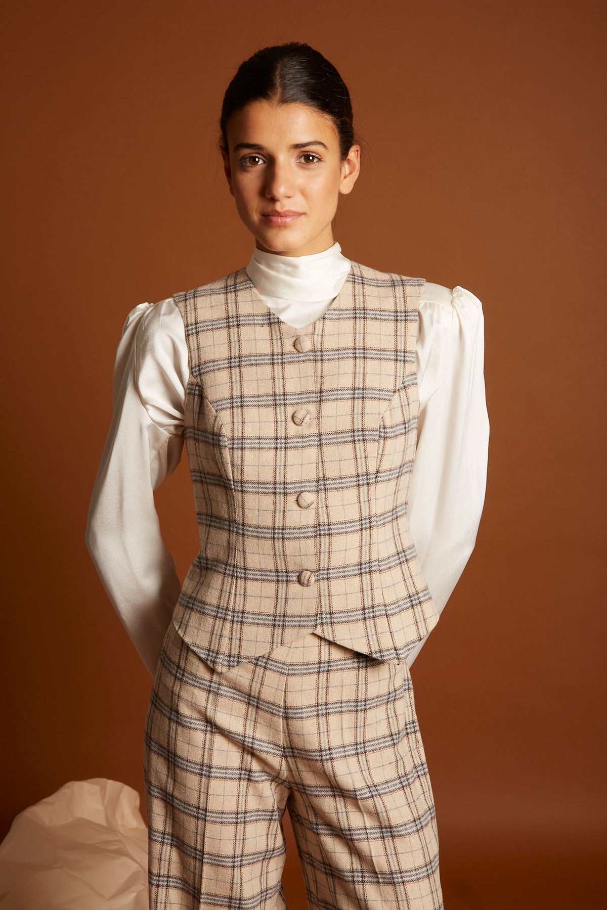 El Chaleco Paint reinterpreta un básico de sastrería con una silueta femenina y elegante. Confeccionado en un tejido de cuadros beige y azul, aporta ese equilibrio perfecto entre lo clásico y lo contemporáneo.