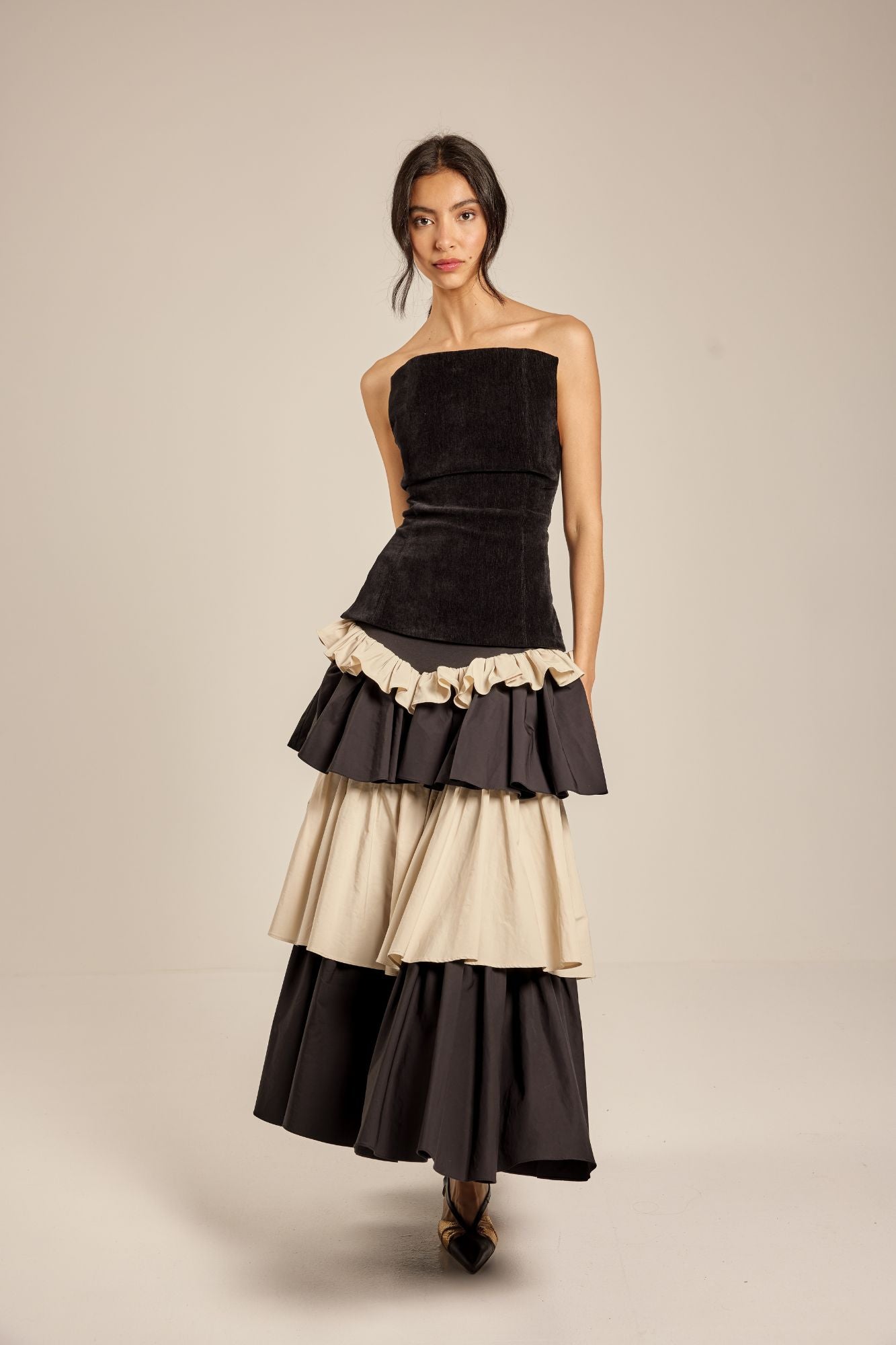 La Falda Pinto es una prenda única y sofisticada que destaca por su diseño de volantes en capas y su combinación bicolor en tonos neutros. Con un estilo elegante y moderno, esta falda larga aporta movimiento, volumen y personalidad a cualquier look.