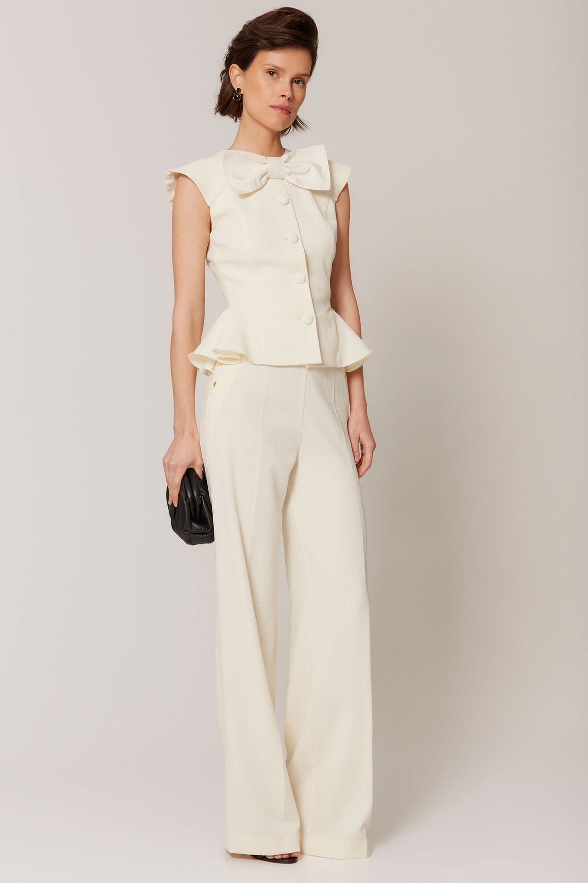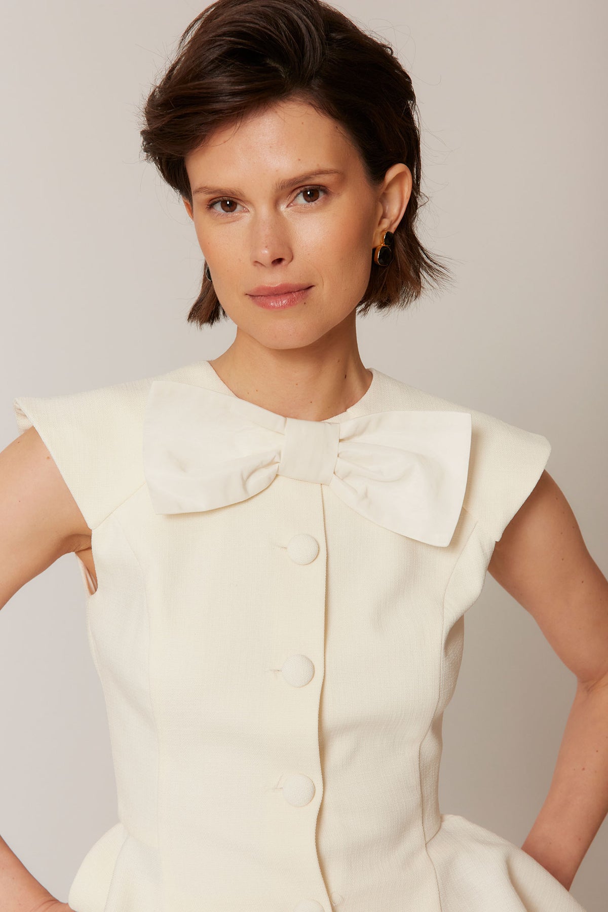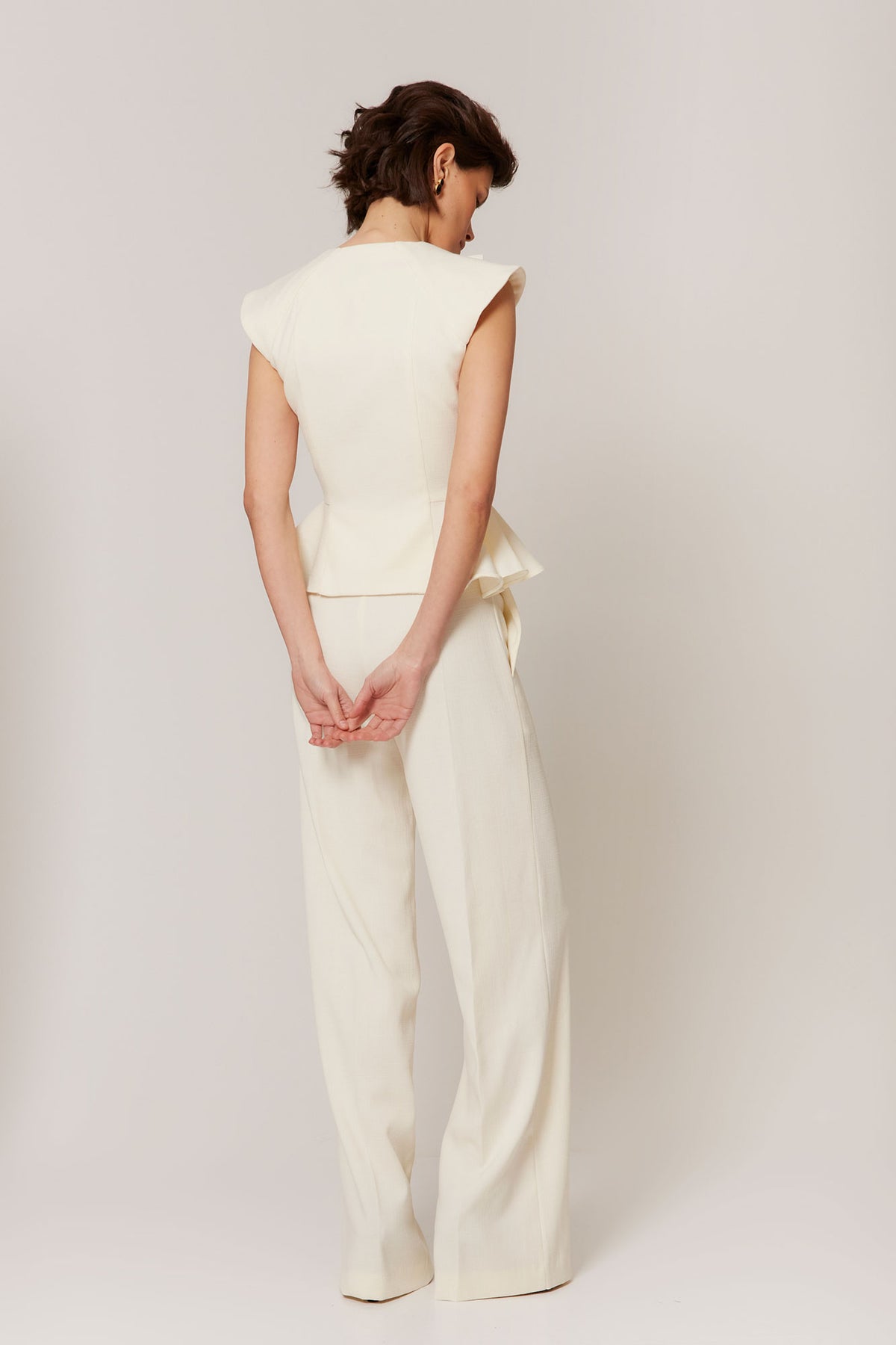 Su corte entallado con ligero peplum en la cintura realza la silueta y crea una figura estilizada, mientras que los hombros estructurados y el cierre frontal con botones forrados añaden un acabado pulido y refinado. El tono crudo o marfil lo convierte en una opción muy versátil, ideal para combinar con pantalones de vestir, faldas o conjuntos de invitada.