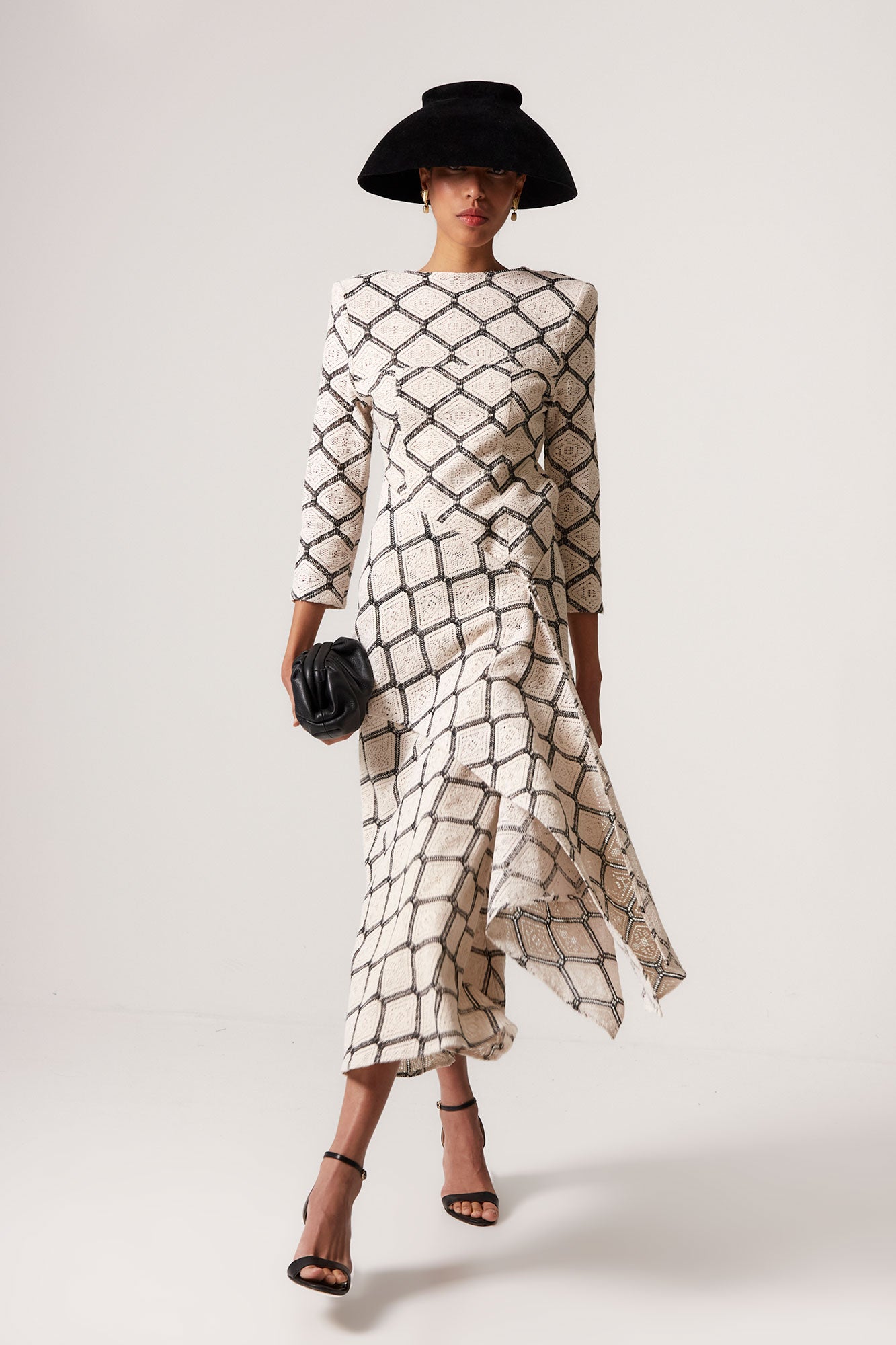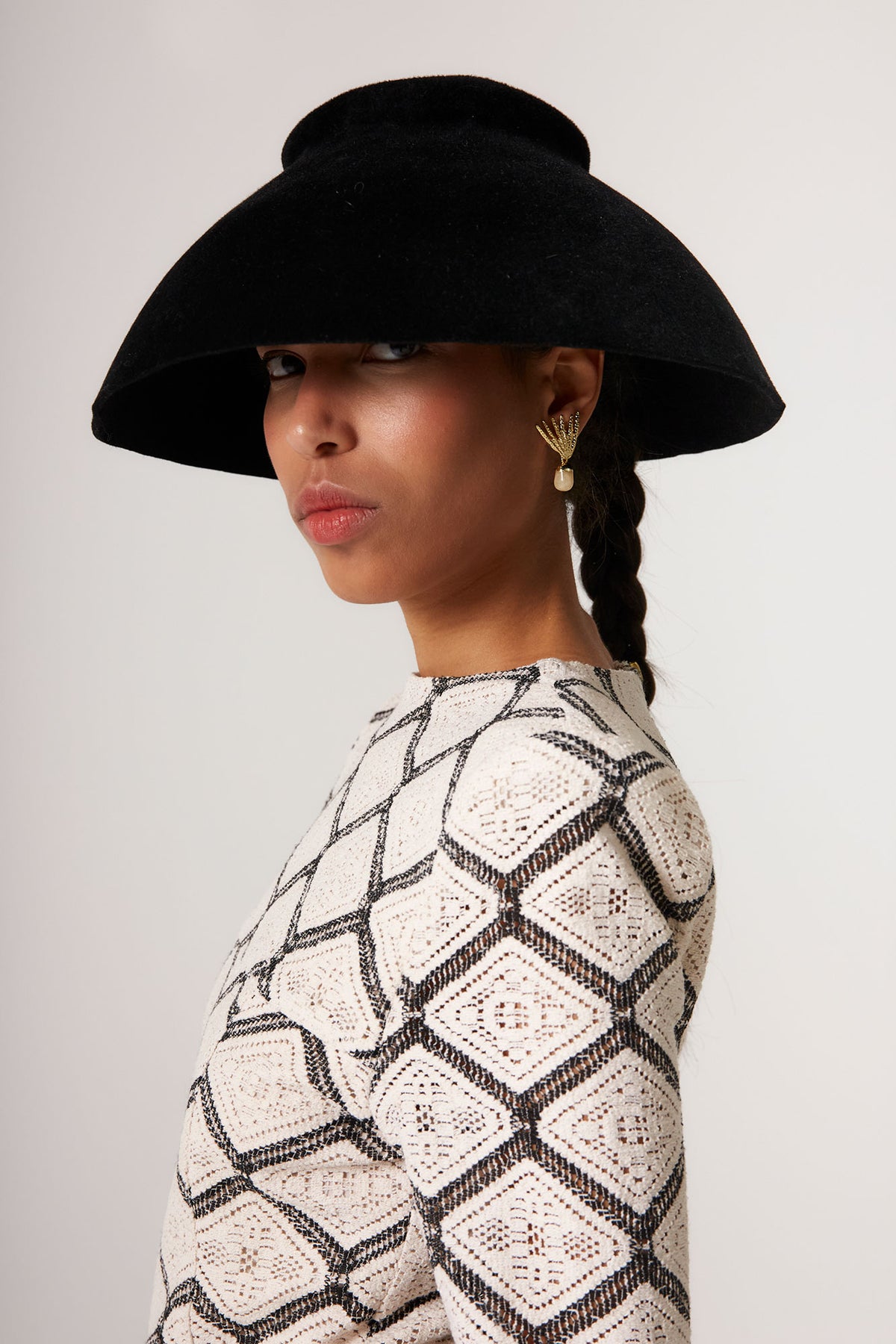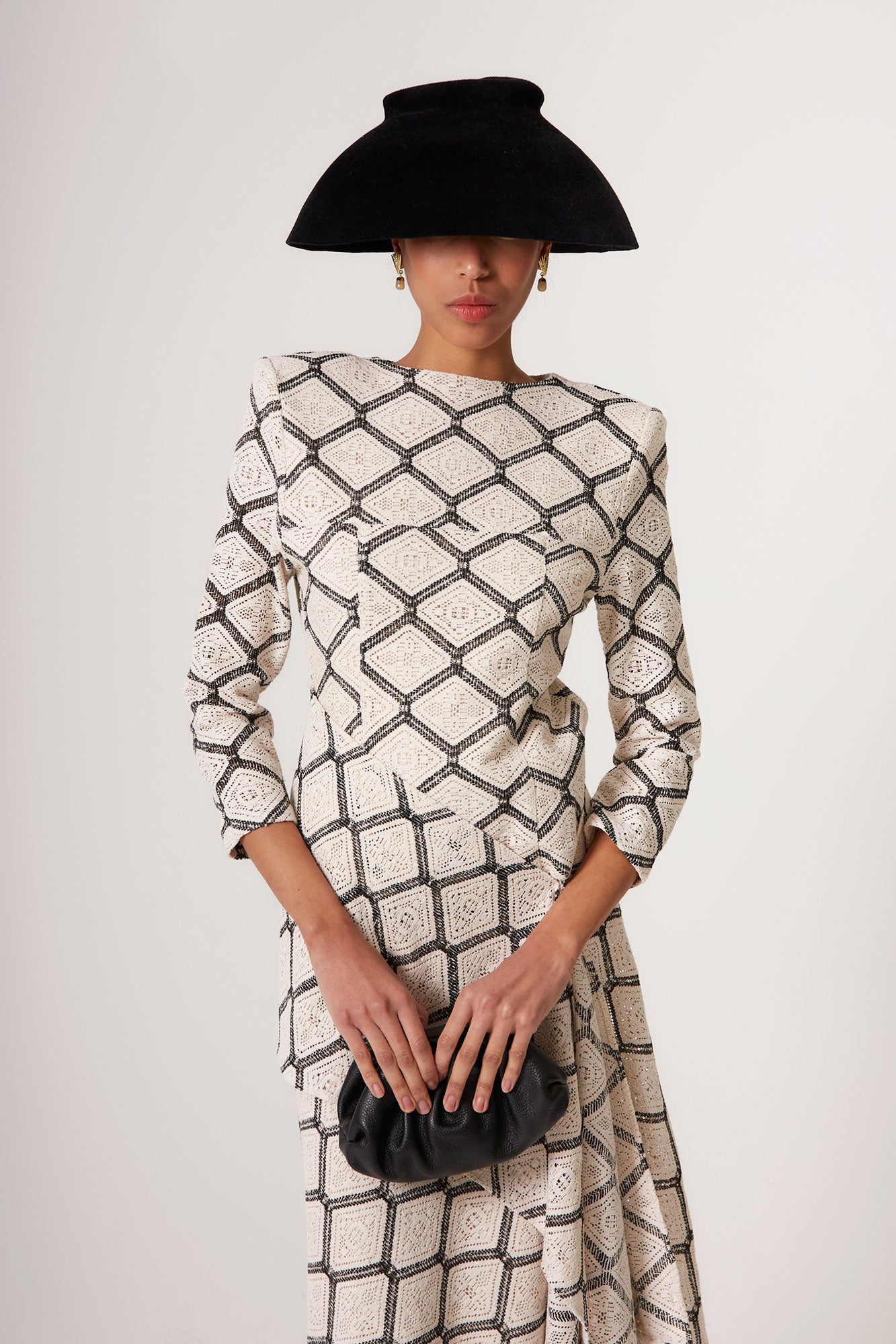 Con escote cerrado y mangas tres cuartos, este top aporta un equilibrio perfecto entre elegancia clásica y modernidad. El patrón entallado estiliza la figura y crea una silueta limpia y sofisticada, mientras que el tejido con textura geométrica añade profundidad y carácter al conjunto.