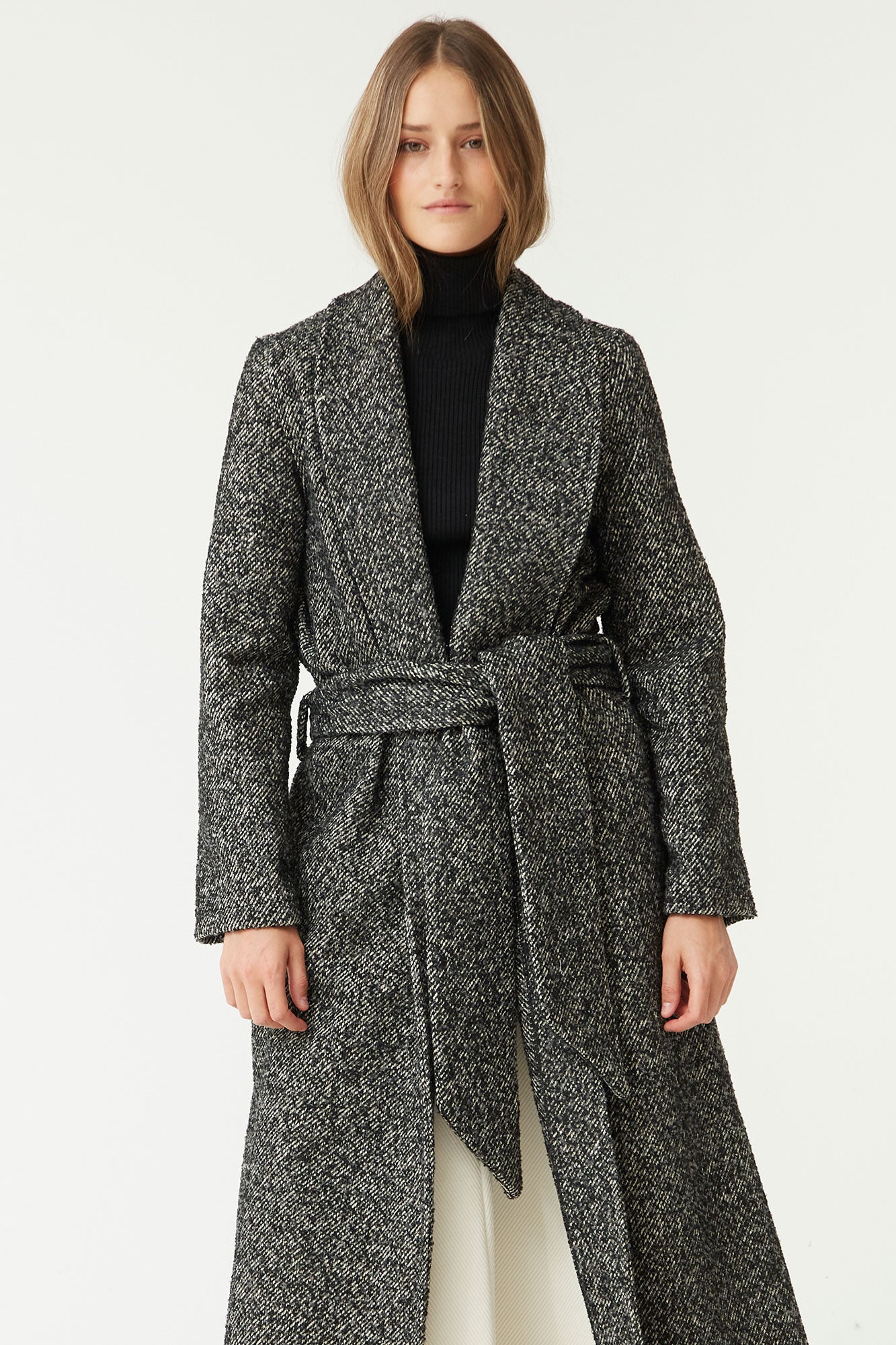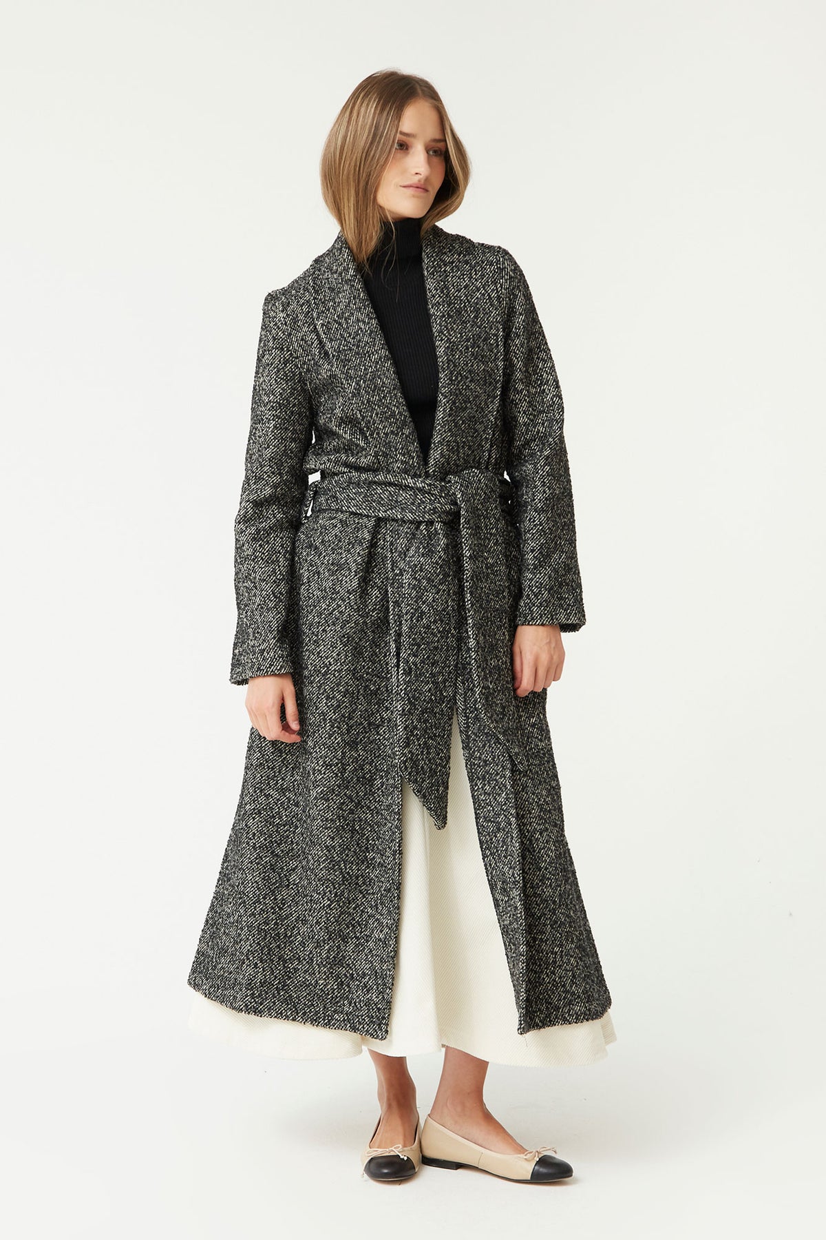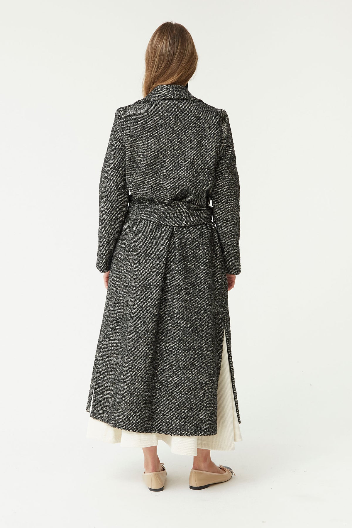 Confeccionado en un tejido cálido con textura de espiga, este abrigo destaca por su cuello con solapa estructurada y su corte largo con caída fluida, aportando un aire sofisticado y atemporal. Perfecto para looks de día o de noche, se convierte en un imprescindible del armario invernal gracias a su versatilidad y estilo clásico.