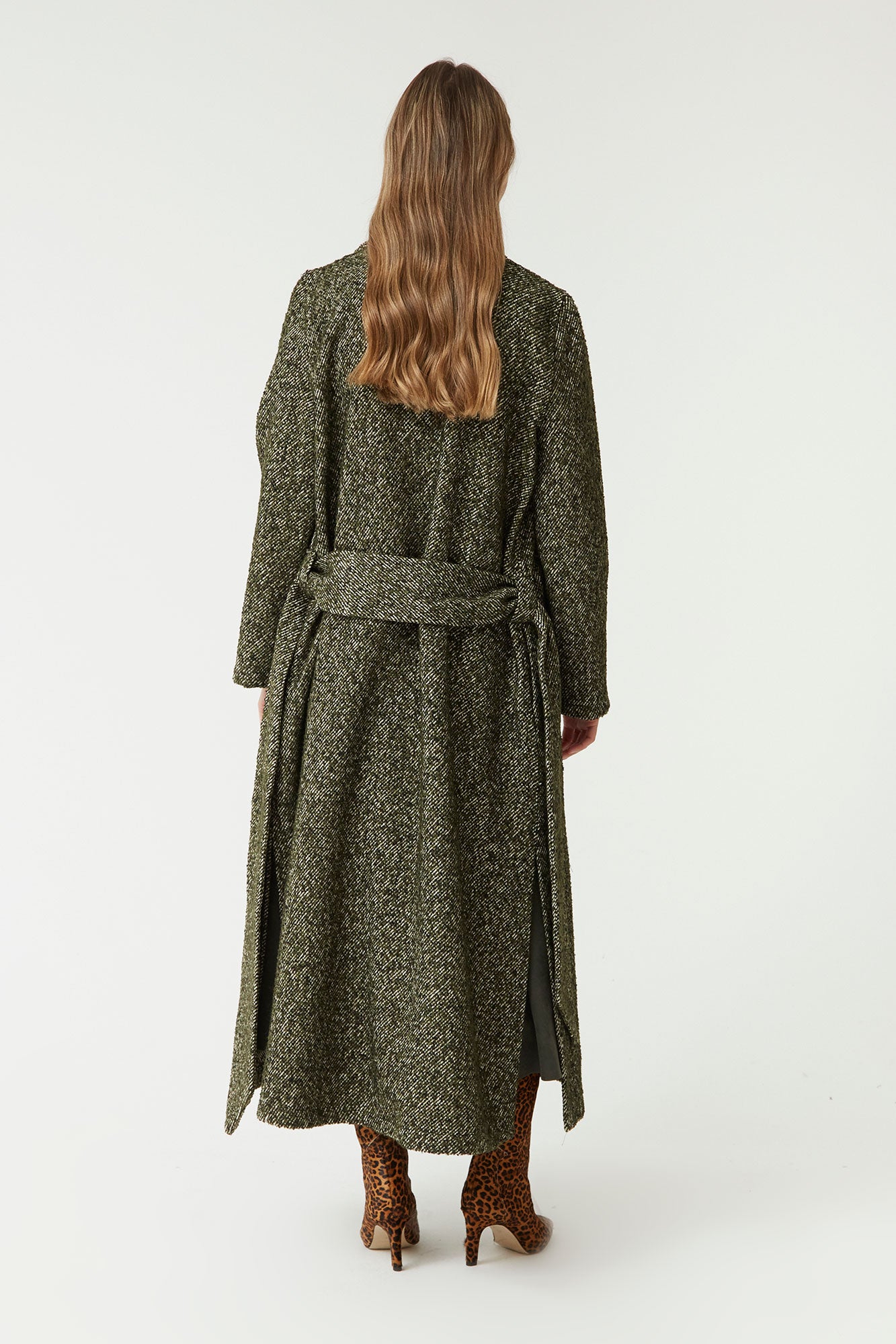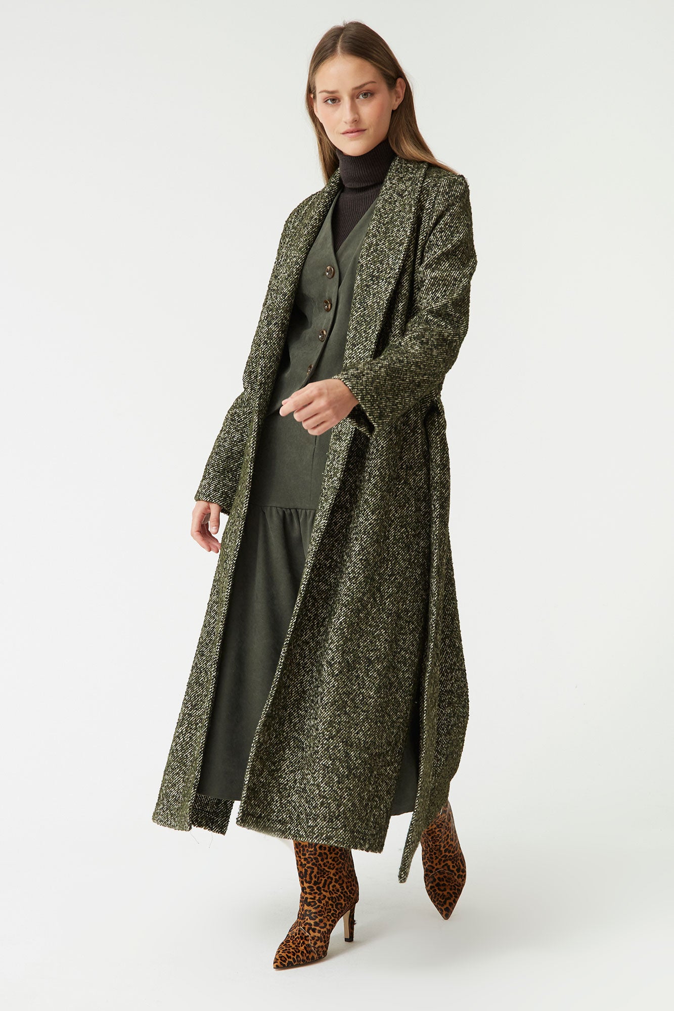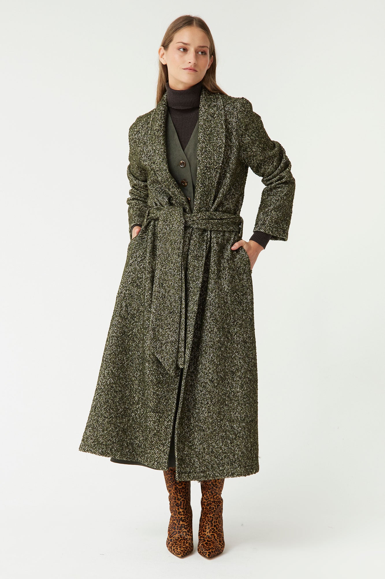 El abrigo largo verde con cinturón de Coosy es una prenda icónica que combina elegancia atemporal con un toque de color sofisticado. Su diseño tipo batín con cinturón del mismo tejido permite ajustar la cintura, realzando la silueta y aportando un aire femenino y moderno.