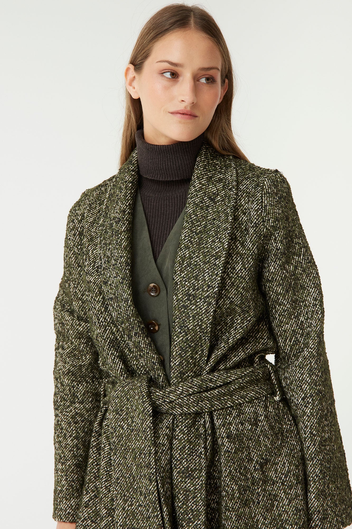 Confeccionado en un tejido cálido con textura suave y estructura, este abrigo destaca por su cuello con solapa amplia y su corte largo con caída fluida, perfecto para elevar cualquier look de otoño e invierno. Su tono verde profundo añade un punto de originalidad sin perder la elegancia clásica de Coosy.