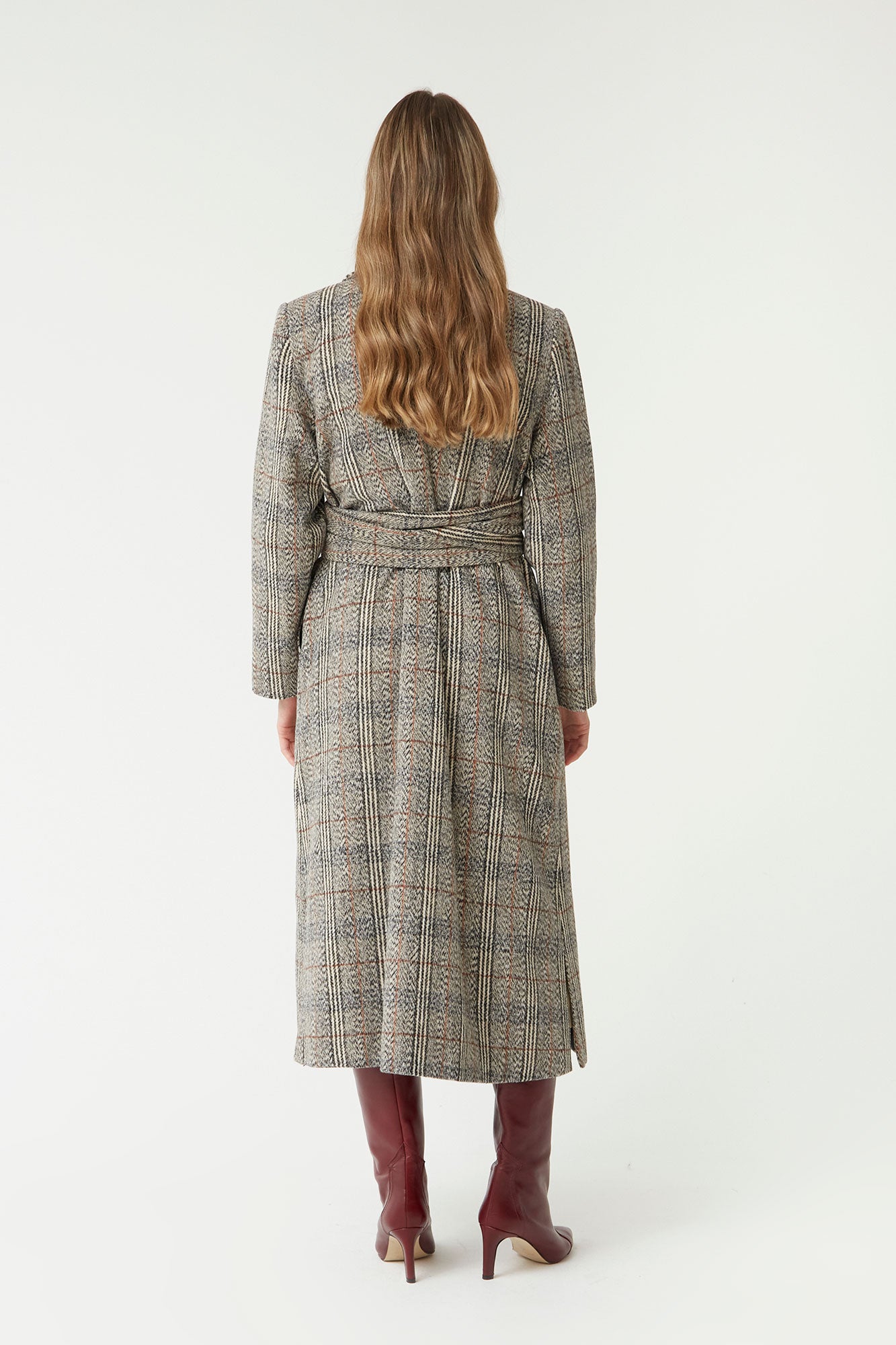 Confeccionado en un tejido cálido y estructurado, combina tonos neutros con un estampado de cuadros atemporal, ideal para elevar cualquier look de otoño e invierno. Su cuello con solapa amplia y su corte largo lo convierten en un imprescindible para tus outfits más elegantes o de diario con un toque chic.