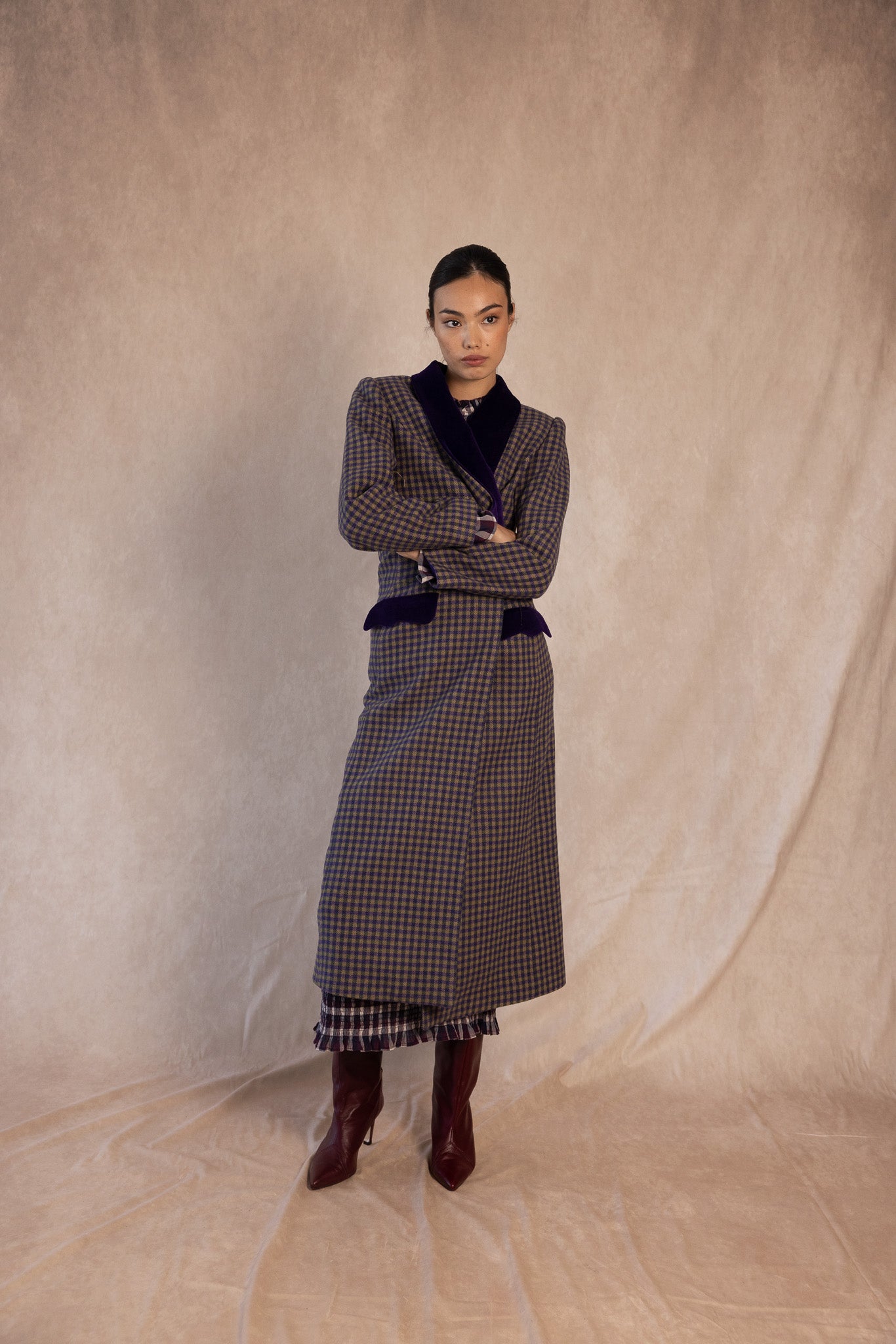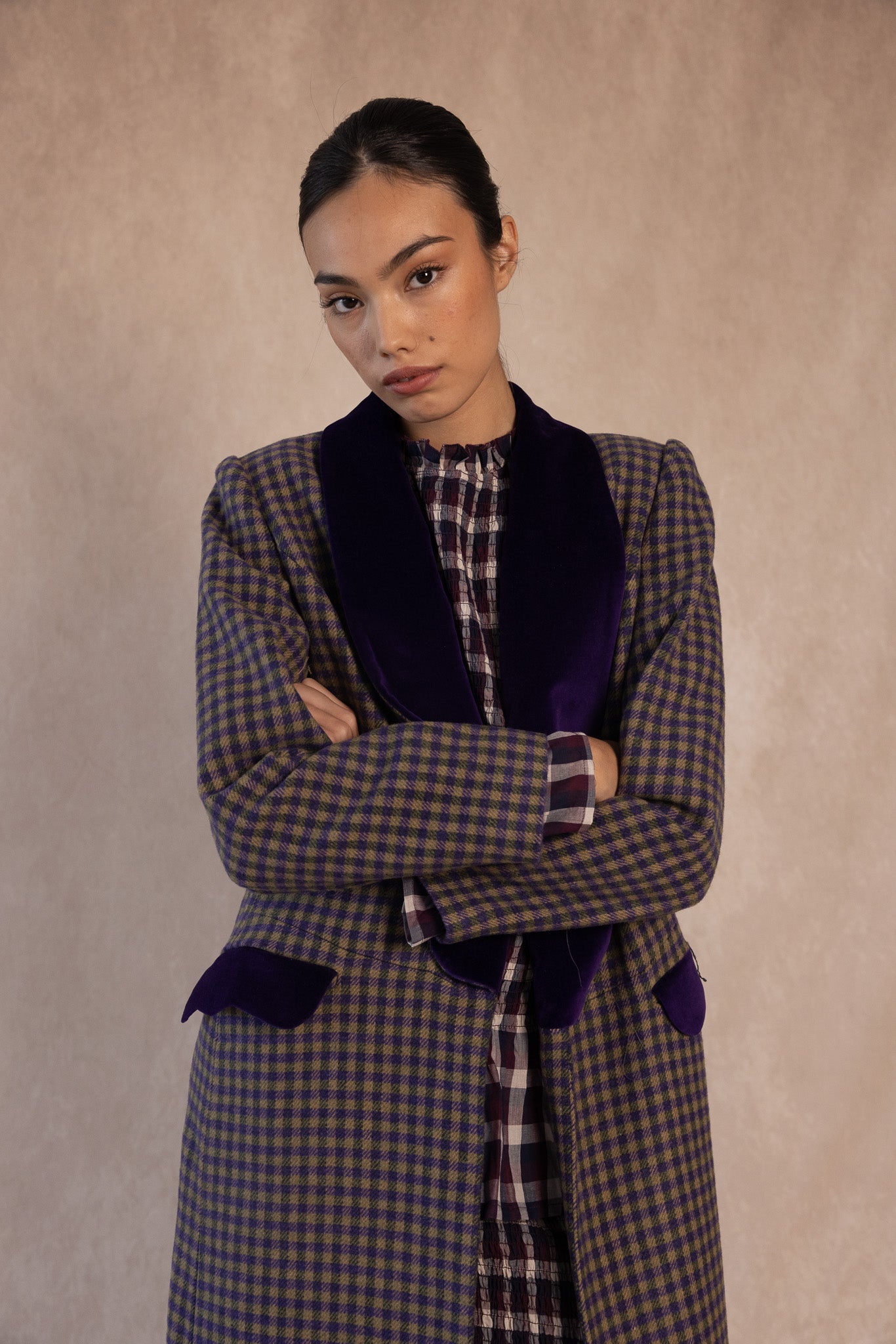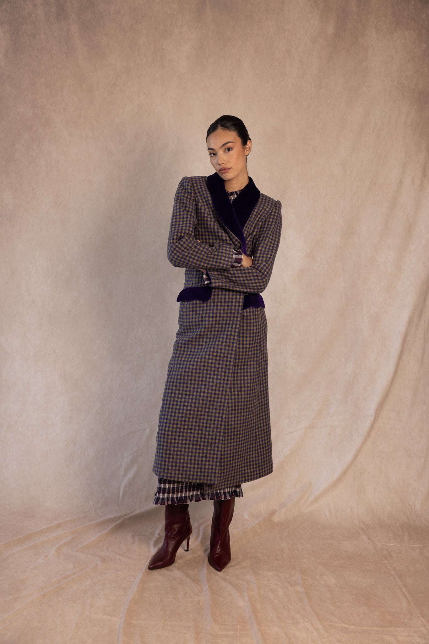 El Abrigo Gaspari Morado es sinónimo de elegancia, estilo y personalidad. Su estampado clásico de cuadros en tonos morados y beige se combina con una espectacular solapa de terciopelo morado, que aporta un toque sofisticado y muy favorecedor.
