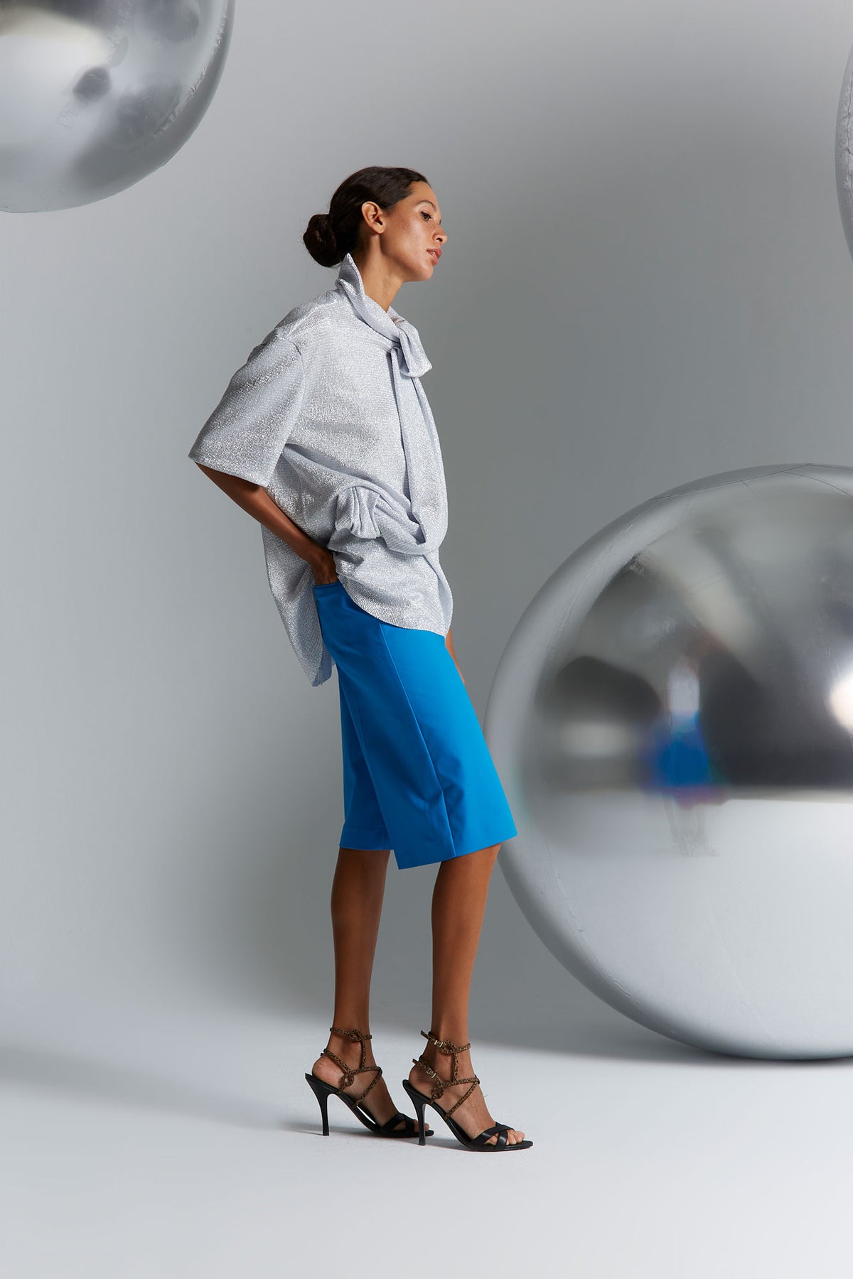 Esta blusa plateada con drapeado y lazada forma parte de la colección Coosy x Miguel Palacio, una propuesta donde el diseño, la experimentación textil y la elegancia de los detalles se unen para crear prendas con identidad propia dentro de la moda española contemporánea.