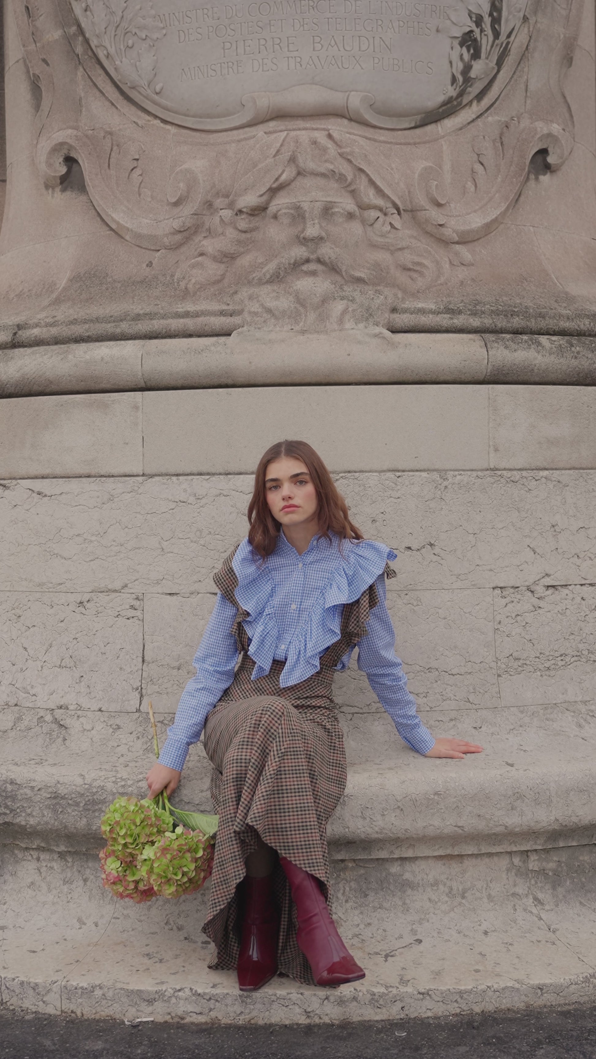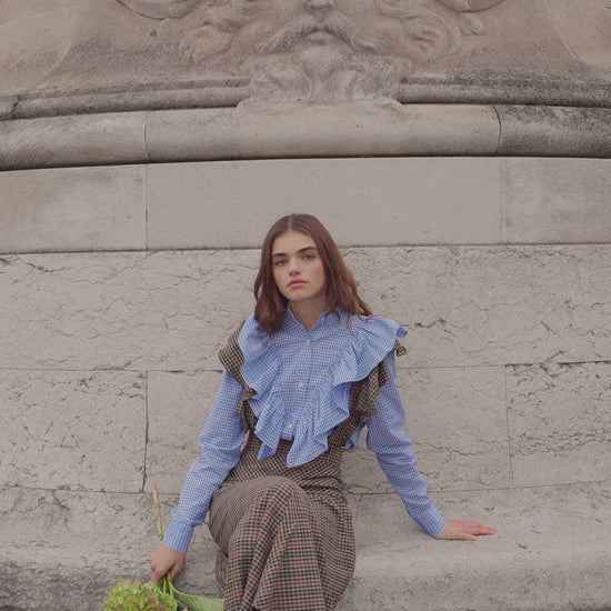 La Camisa Ares Cuadros es una oda a la feminidad clásica reinterpretada con un toque contemporáneo. Confeccionada en un tejido de cuadros vichy en tono azul, esta prenda destaca por sus volantes estructurados y su corte impecable, que aportan volumen, movimiento y elegancia.