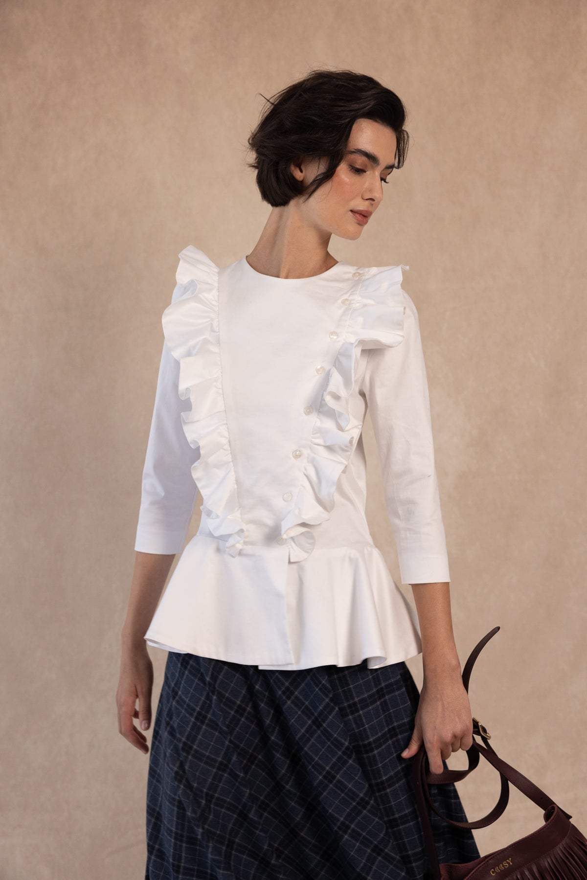 Confeccionada en un tejido de algodón de alta calidad, esta prenda ofrece un tacto suave y una caída impecable. Los botones decorativos frontales aportan un toque chic, mientras que el peplum sutil en el bajo realza la figura femenina. Ideal para llevar con falda midi, pantalón de pinzas o jeans, adaptándose a looks de oficina o eventos especiales. La parte trasera de la camisa es lisa.