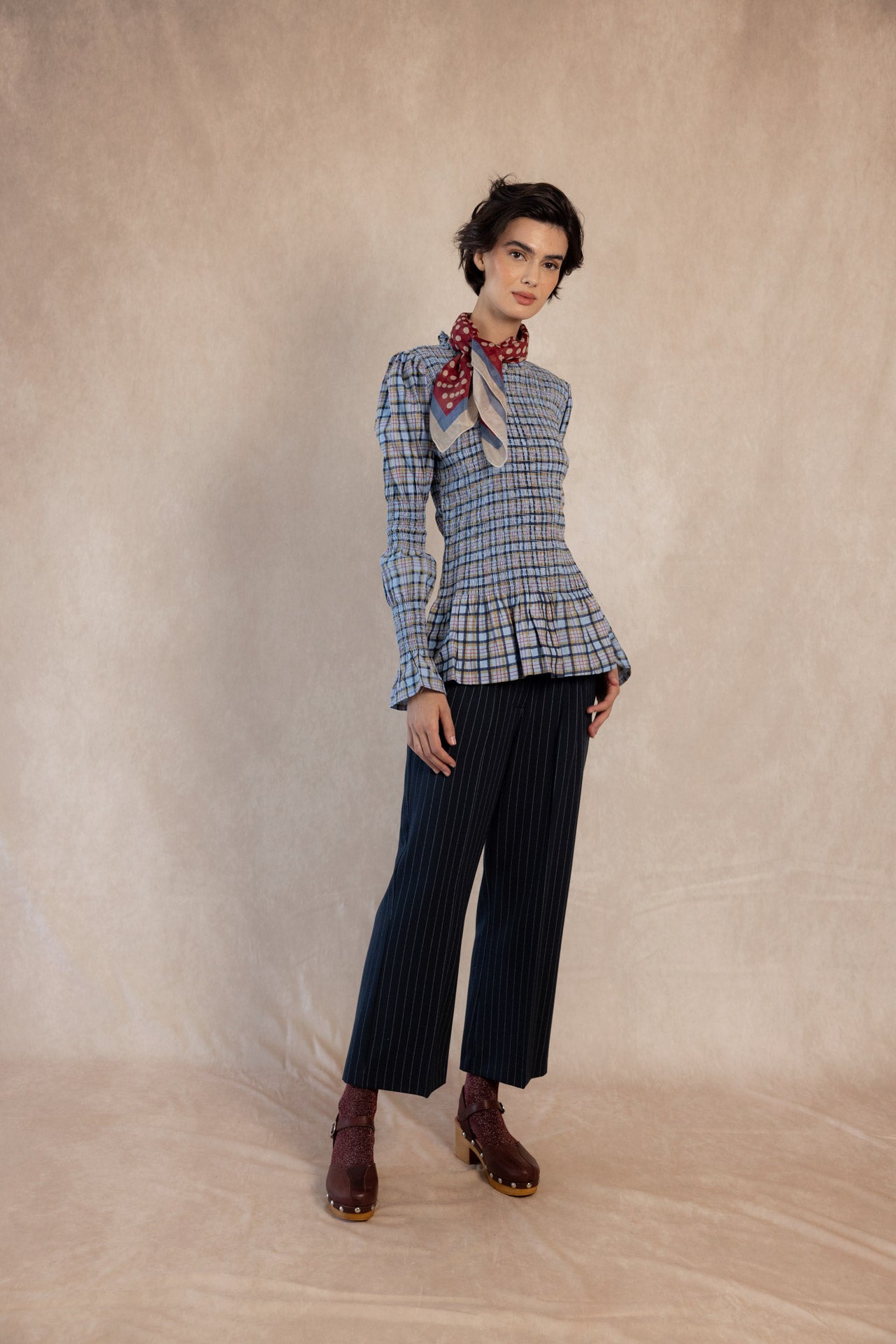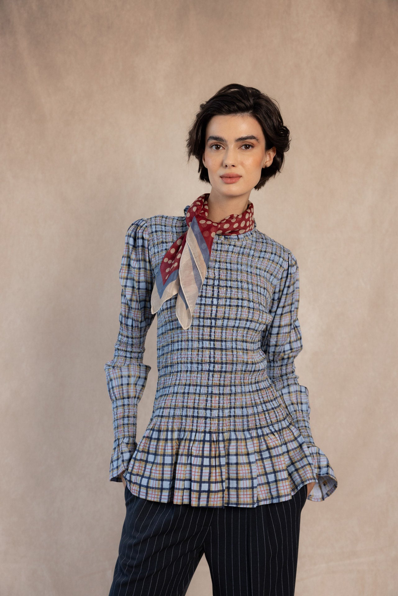 La camisa Elio azul destaca por su original diseño con fruncido elástico en el cuerpo, que se adapta a la silueta aportando comodidad y un aire muy femenino. Confeccionada en un tejido de cuadros en tonos azules, lilas y mostaza, combina frescura y estilo atemporal.