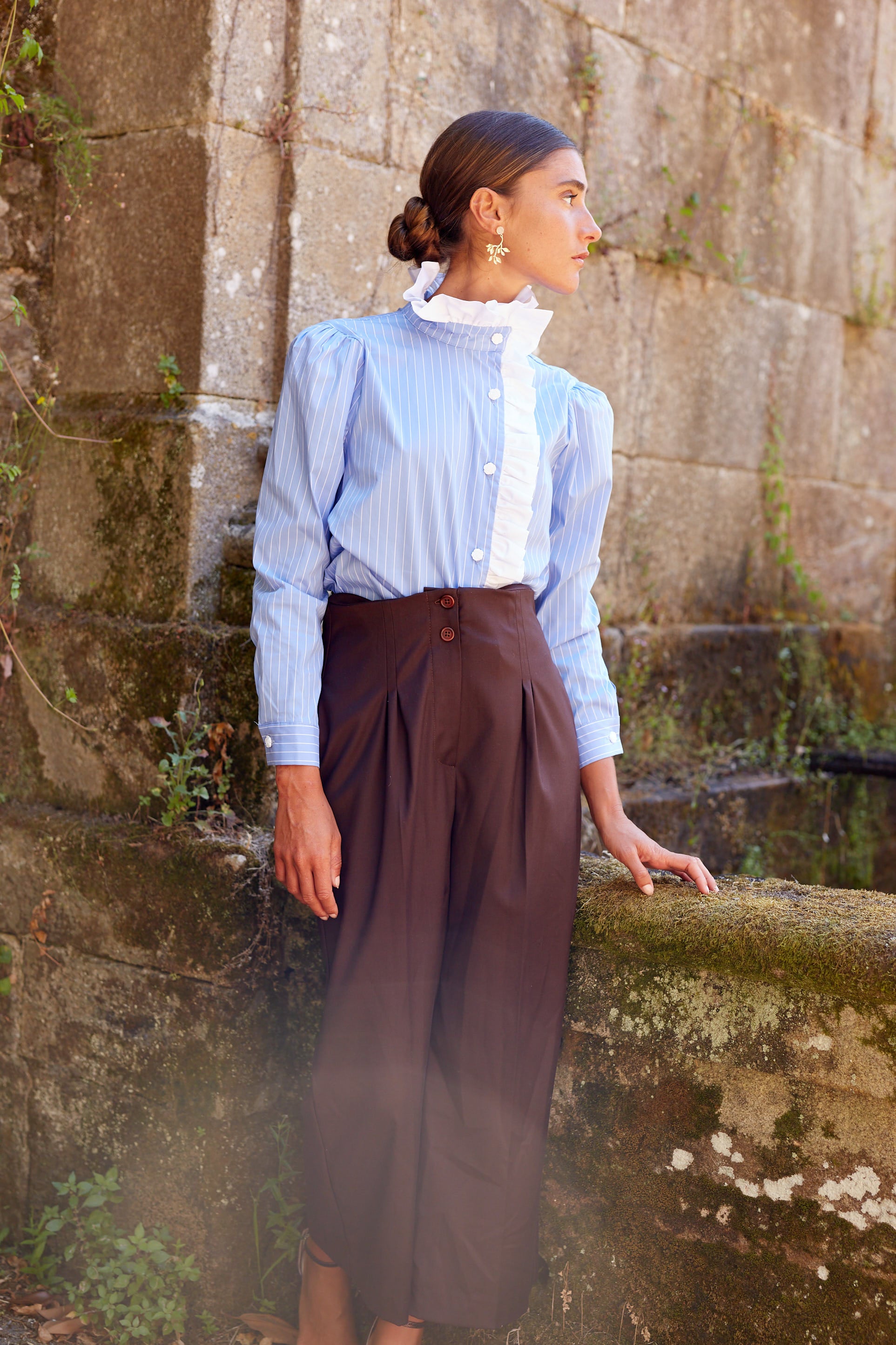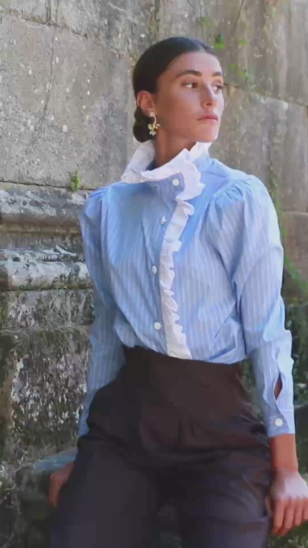 Un clásico renovado que combina elegancia victoriana con estilo contemporáneo. La camisa Emily Azul está confeccionada en un suave tejido de algodón con estampado de rayas celestes y blancas, aportando frescura y sofisticación a partes iguales.