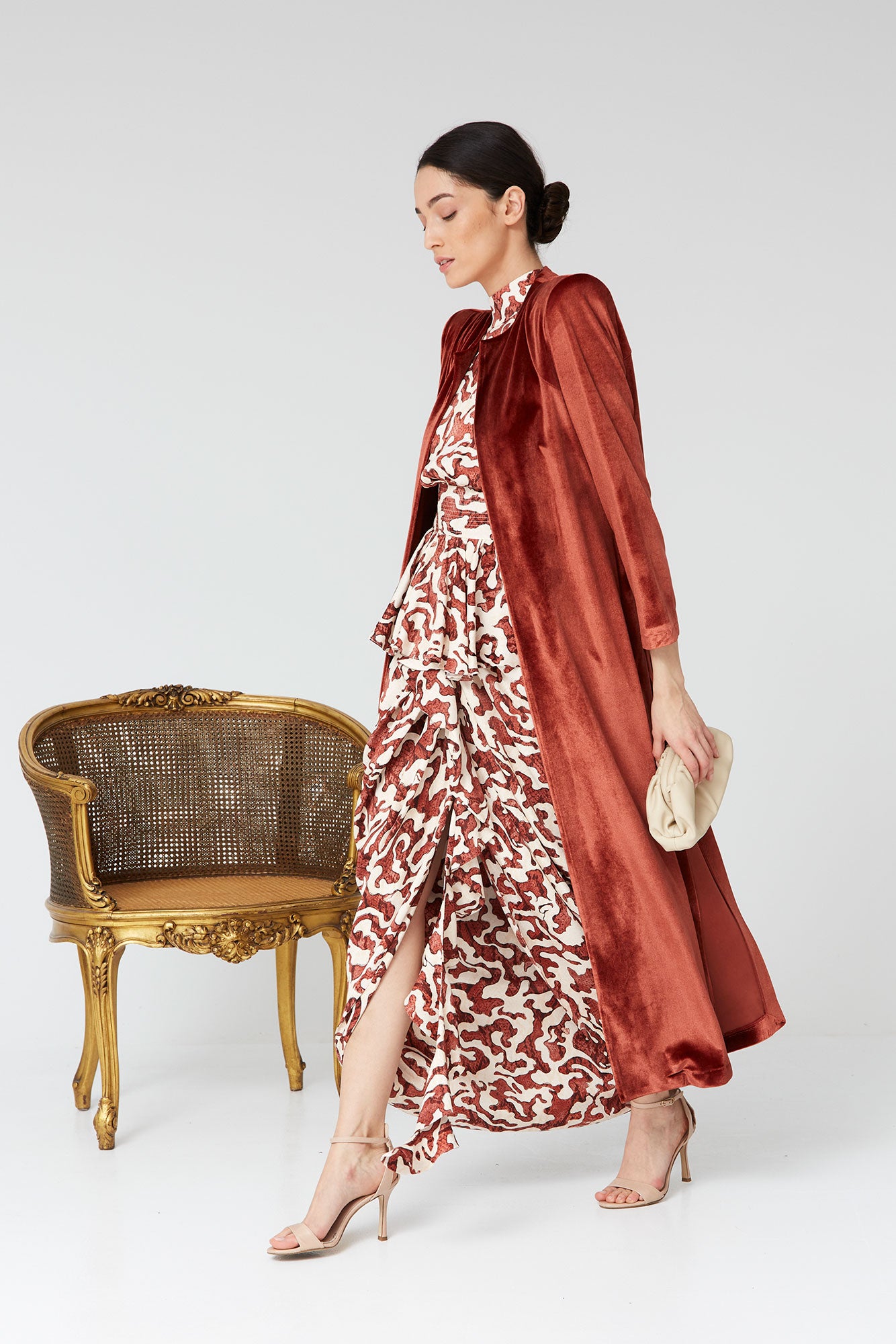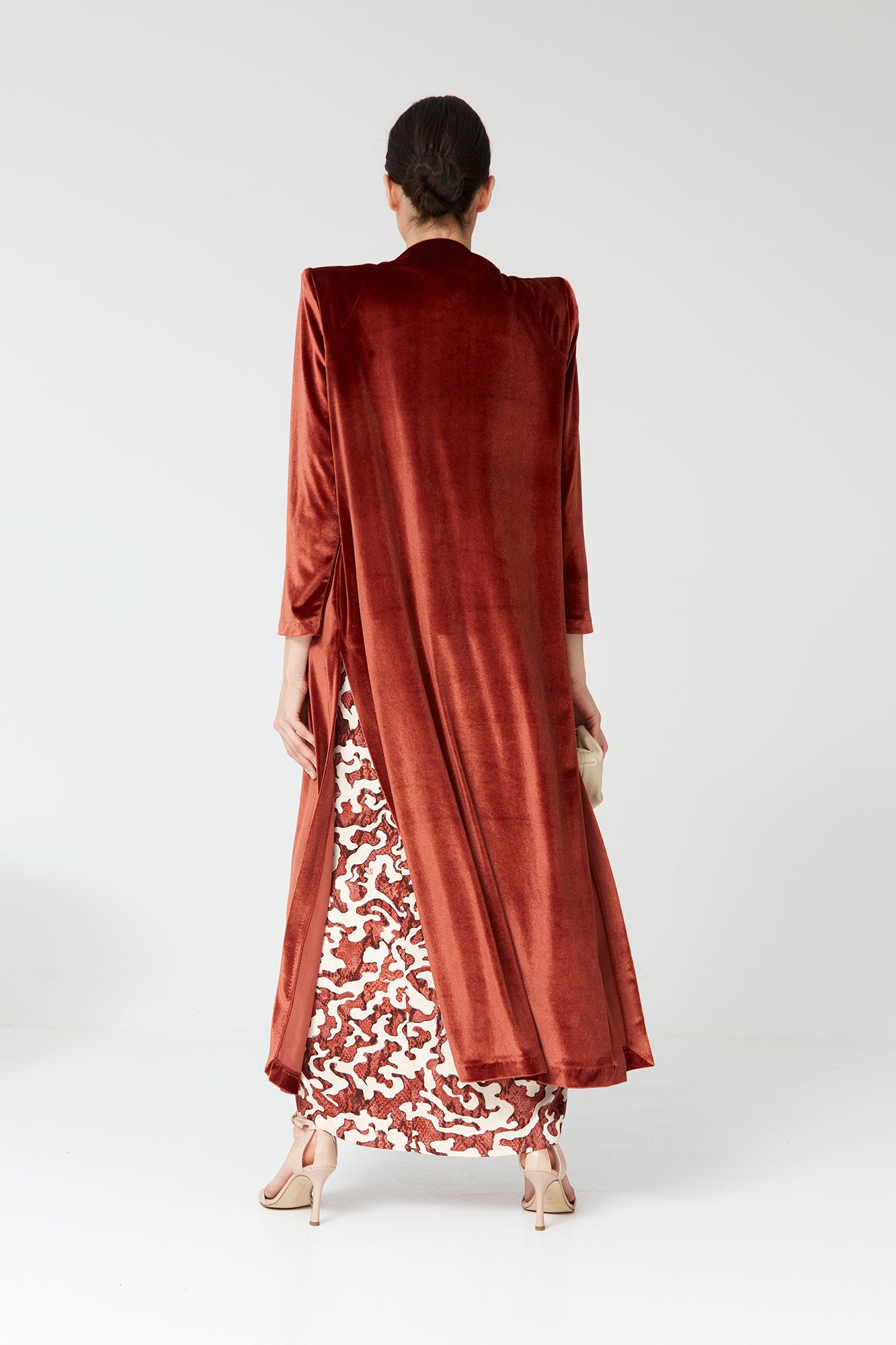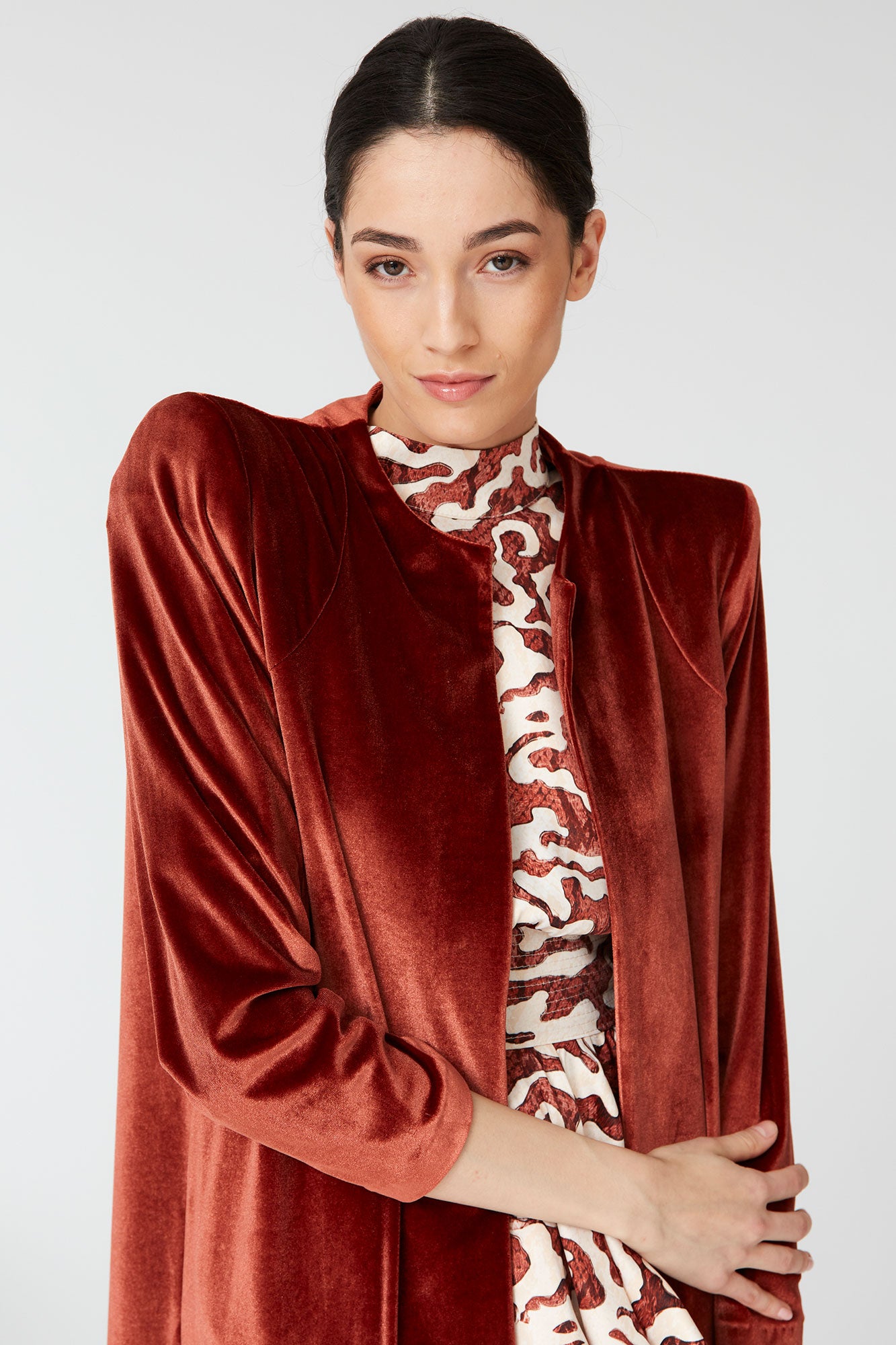 La Casaca Elva de Coosy es la prenda perfecta para elevar cualquier look con un aire refinado y femenino. Confeccionada en un tejido fluido de acabado aterciopelado, esta casaca larga en color teja destaca por su caída elegante, su silueta estilizada y sus hombros ligeramente estructurados, que aportan carácter y sofisticación.