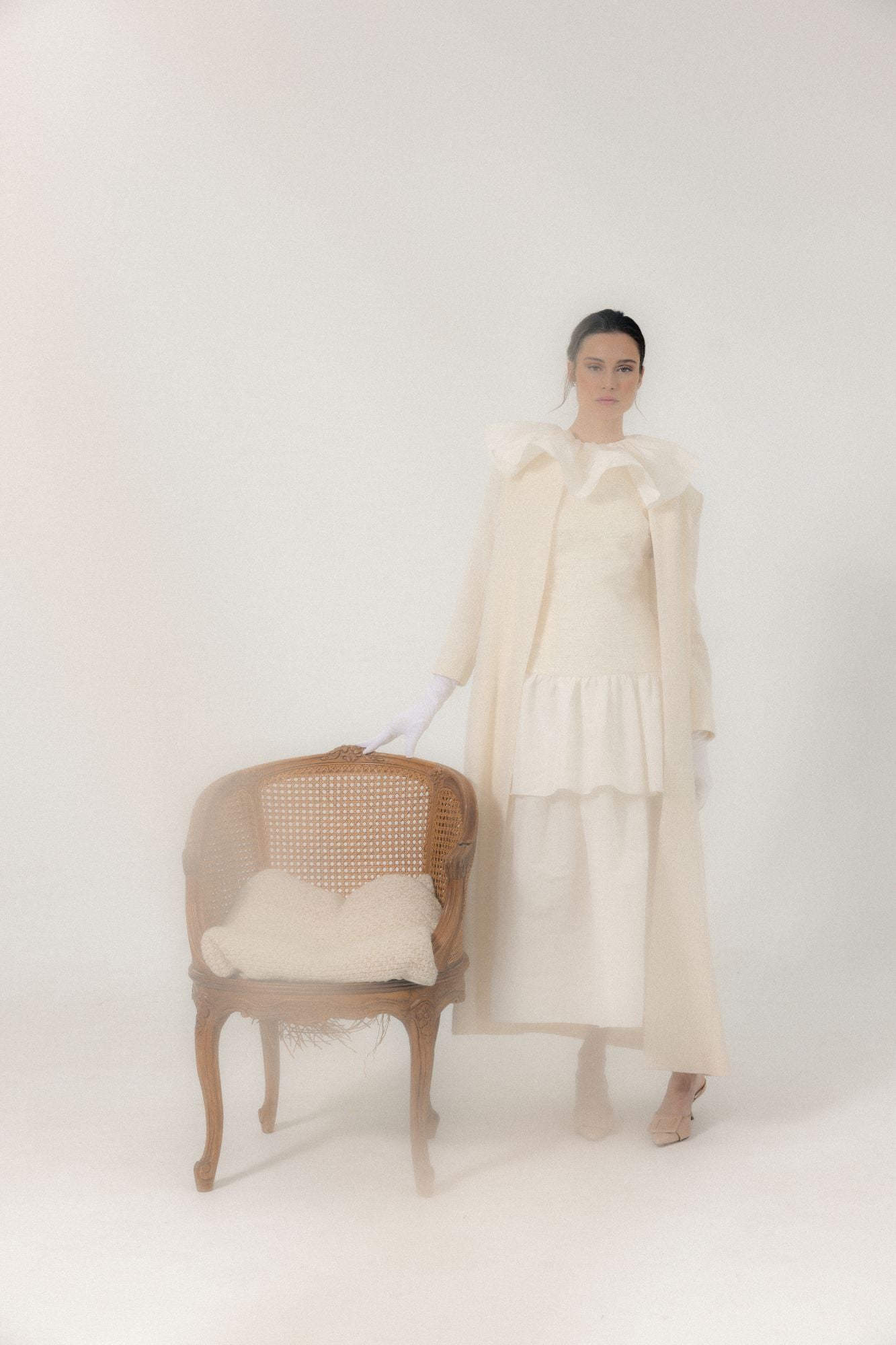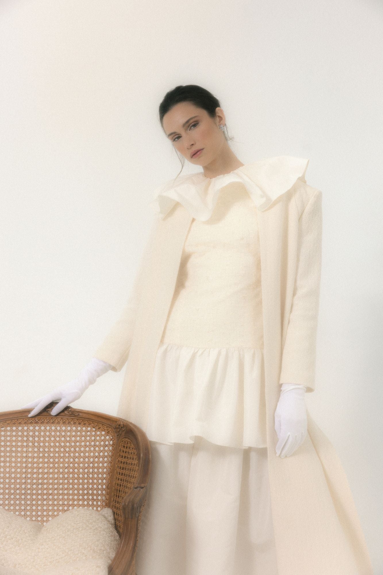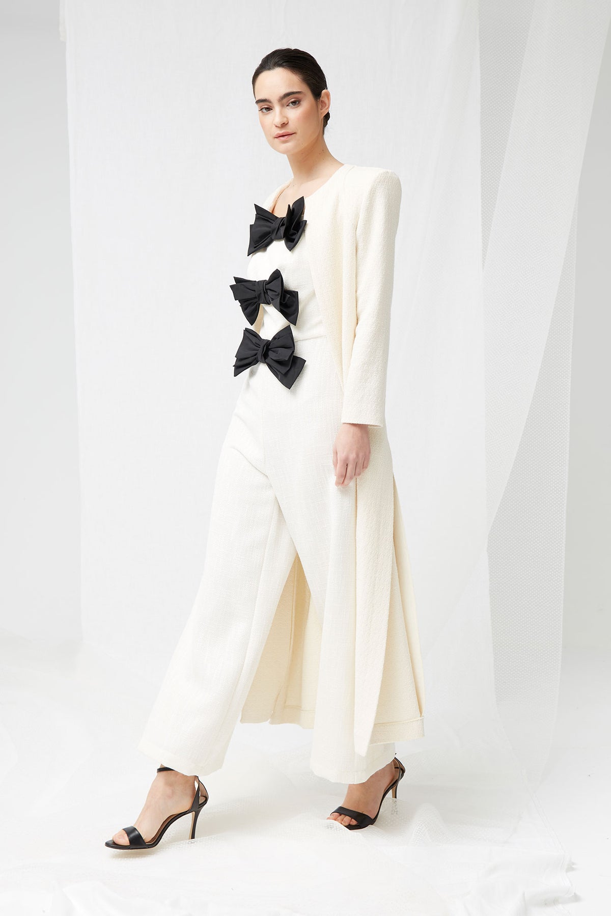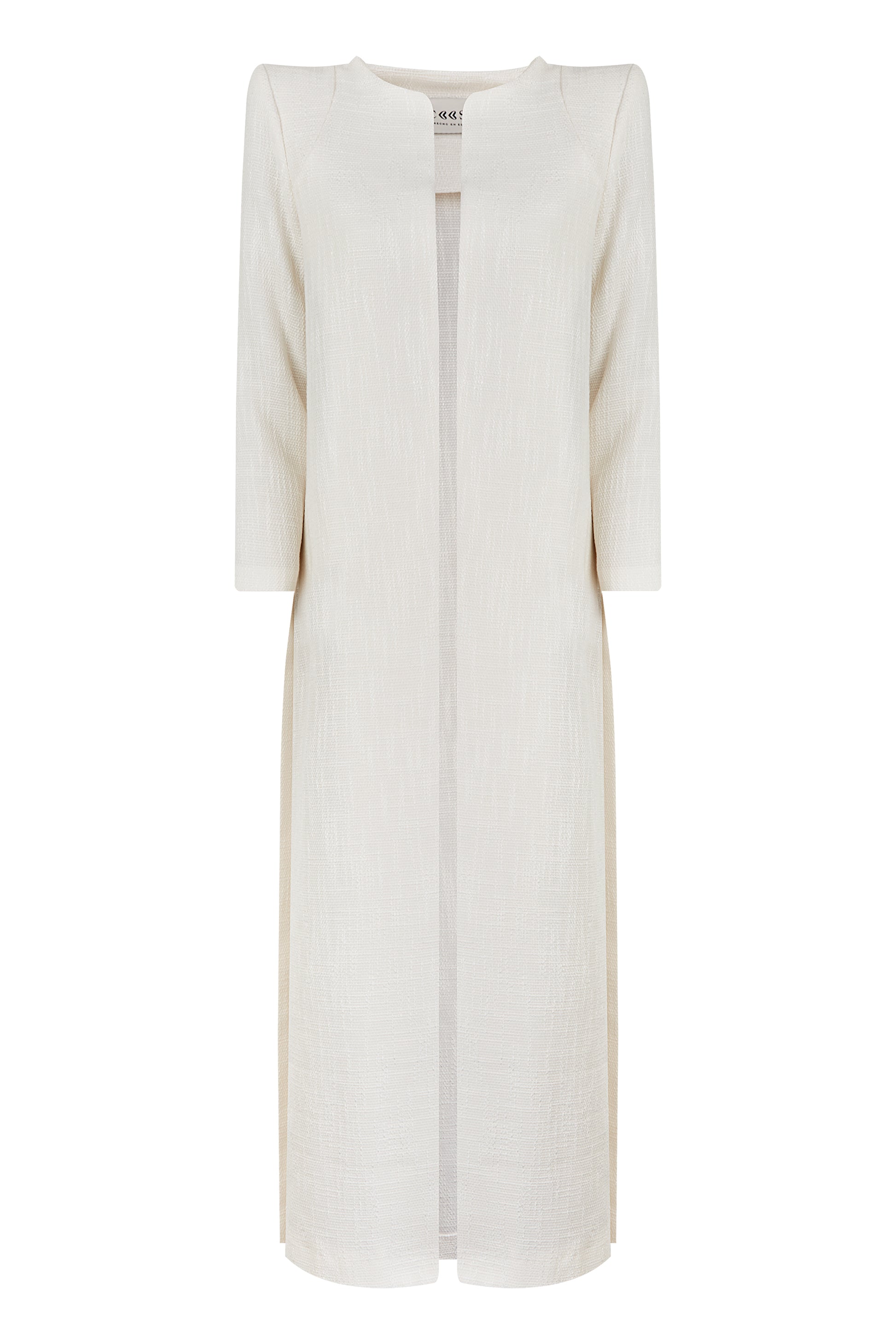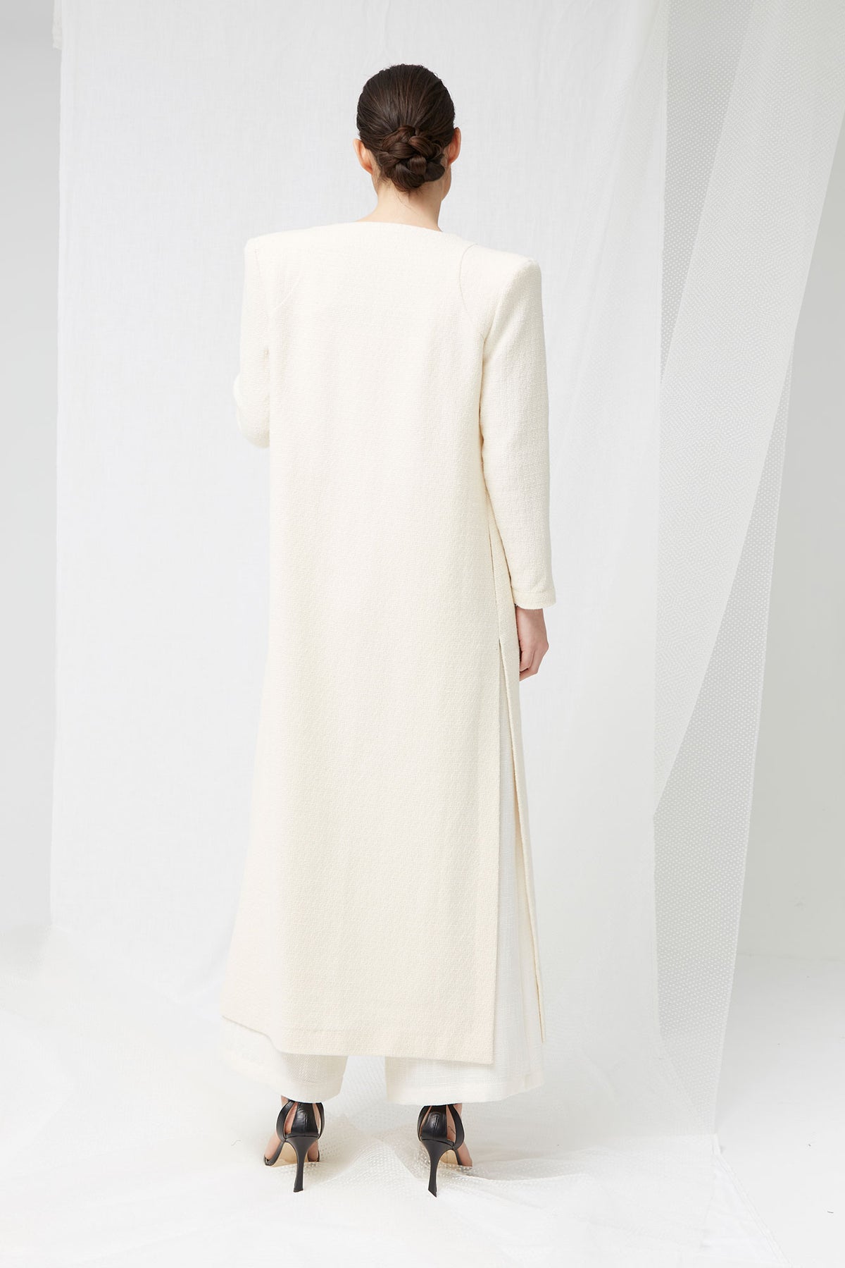 Esta casaca blanca larga de inspiración bridal es la definición de elegancia serena y feminidad atemporal. Diseñada como pieza clave de la colección Yes, I do, envuelve la silueta con sutileza y sofisticación, evocando el romanticismo clásico de los años 30 a los 50 desde una mirada contemporánea.