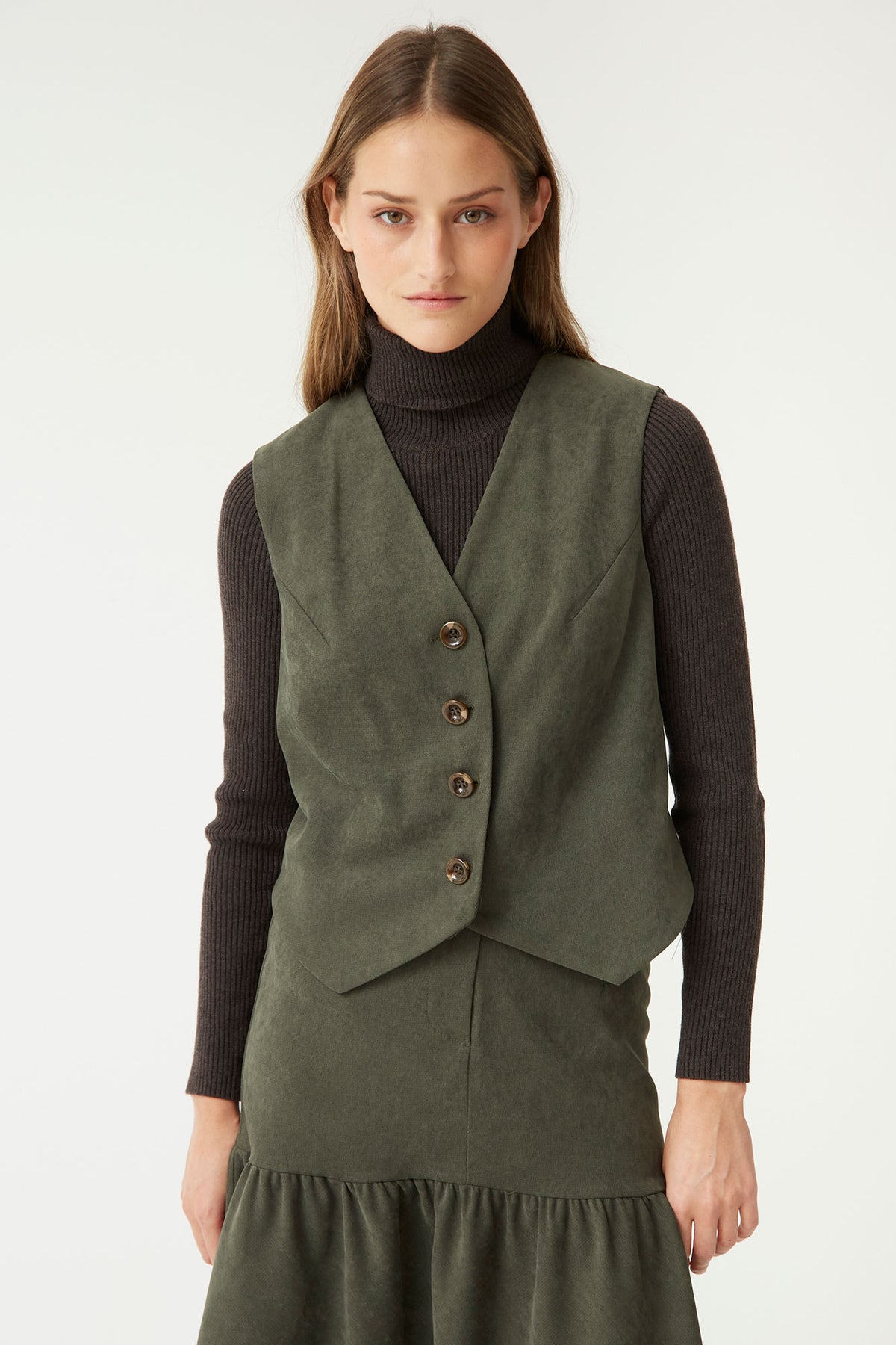El color verde kaki lo convierte en una pieza atemporal, fácil de combinar y perfecta tanto para looks de oficina como para ocasiones especiales. Su diseño es ideal para llevar solo o sobre una blusa o camisa para agregar un toque extra de elegancia.