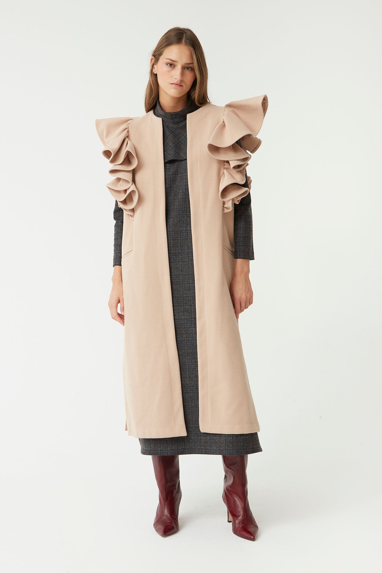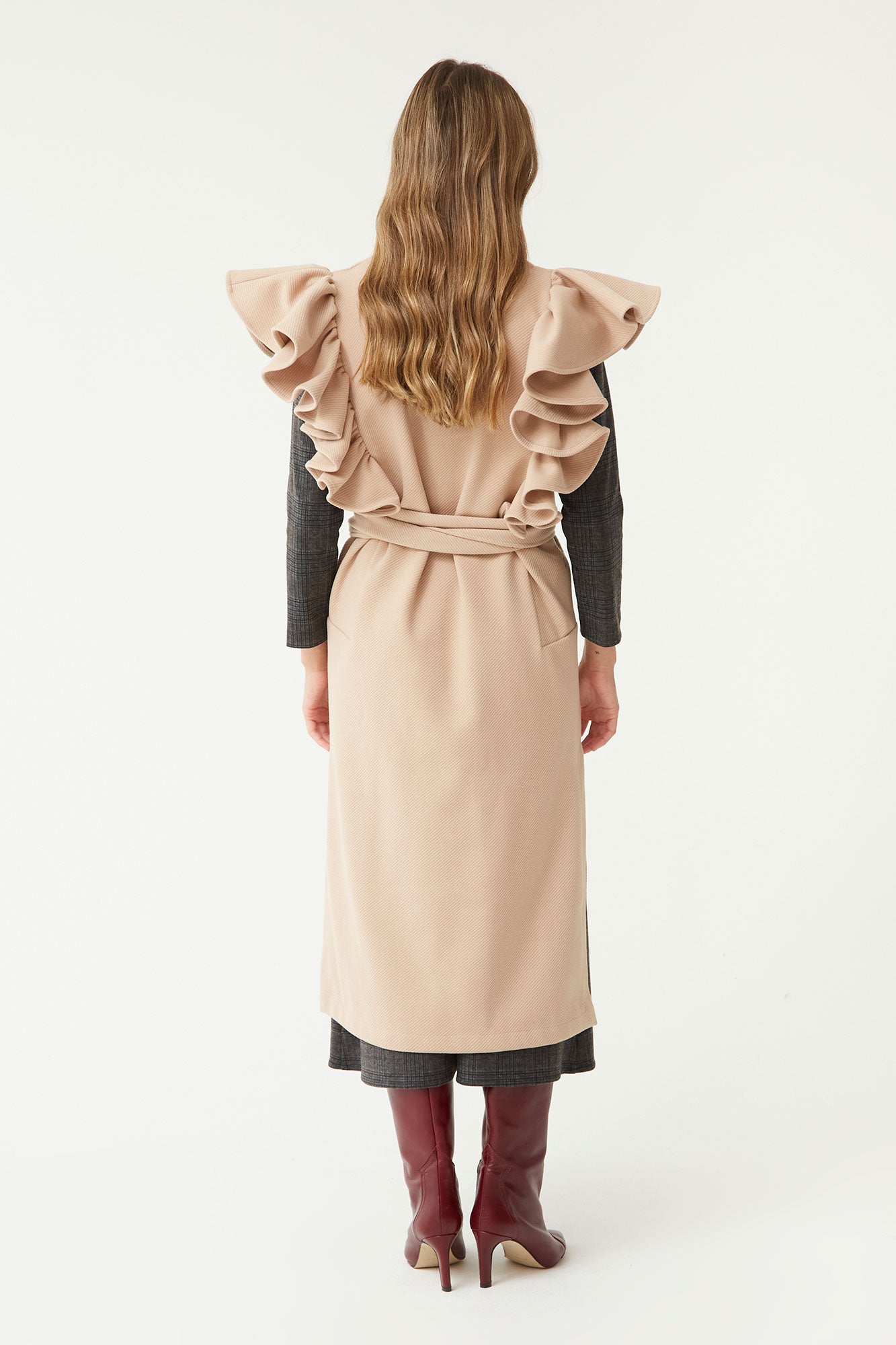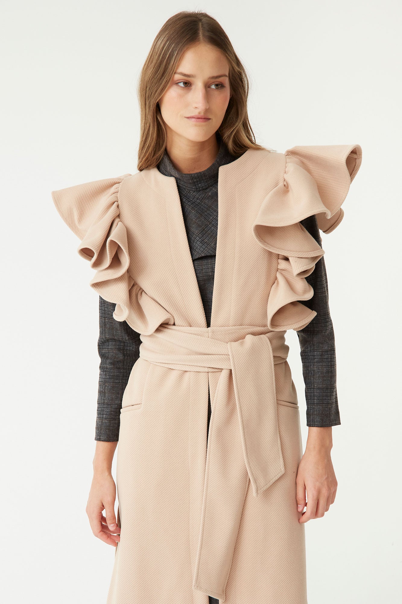 El chaleco largo beige con volantes de Coosy es una prenda sofisticada y versátil que eleva cualquier look con su diseño único y su elegancia natural. Destaca por los volantes estructurados en los hombros, que aportan volumen y movimiento, y por el fajín del mismo tejido, perfecto para ajustar la cintura y resaltar la silueta femenina.