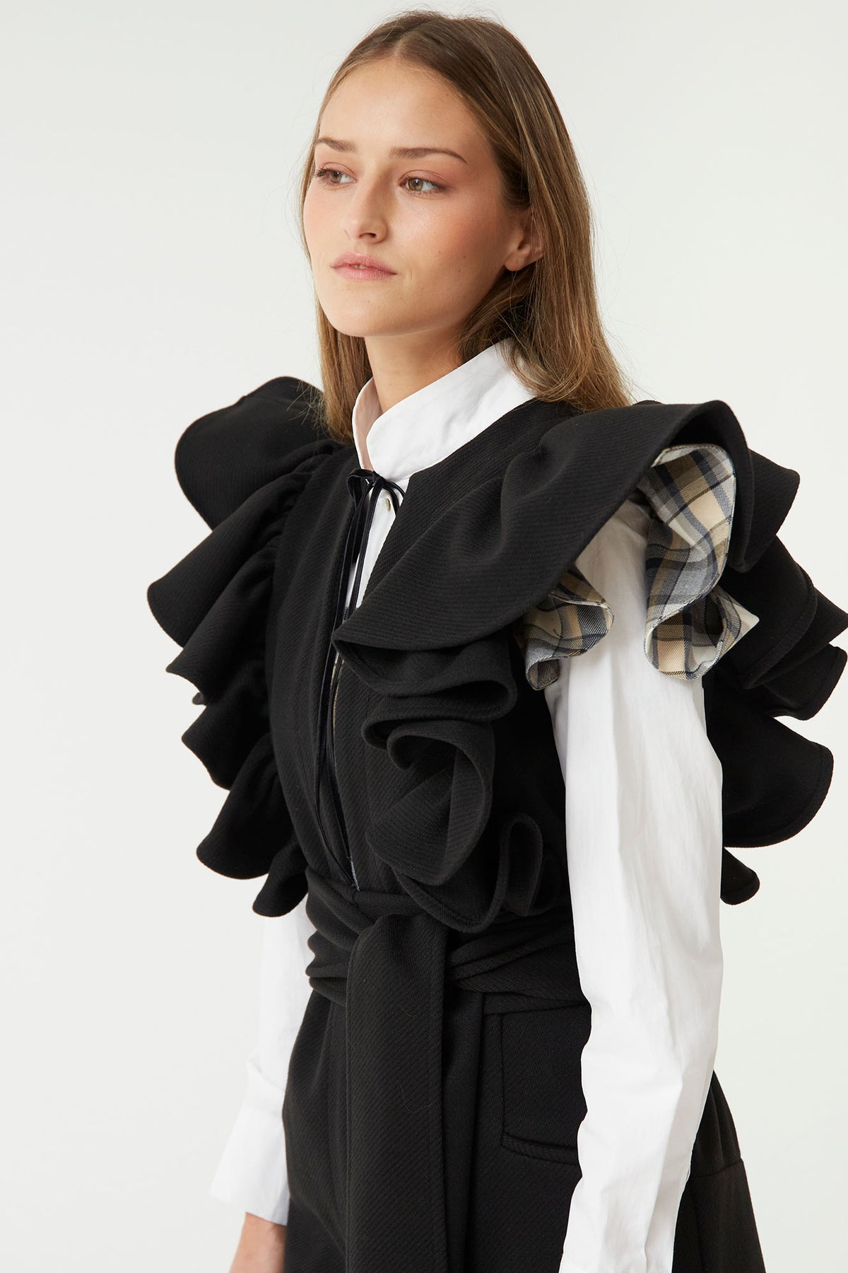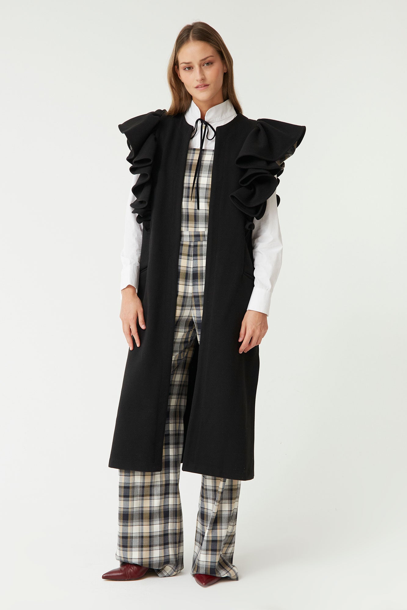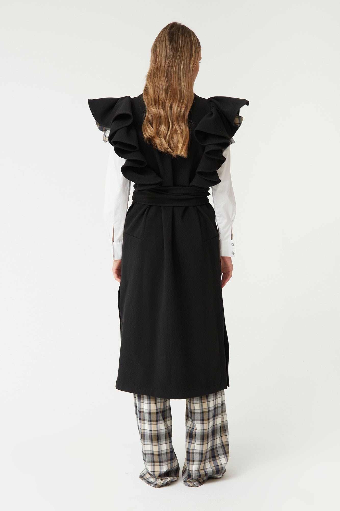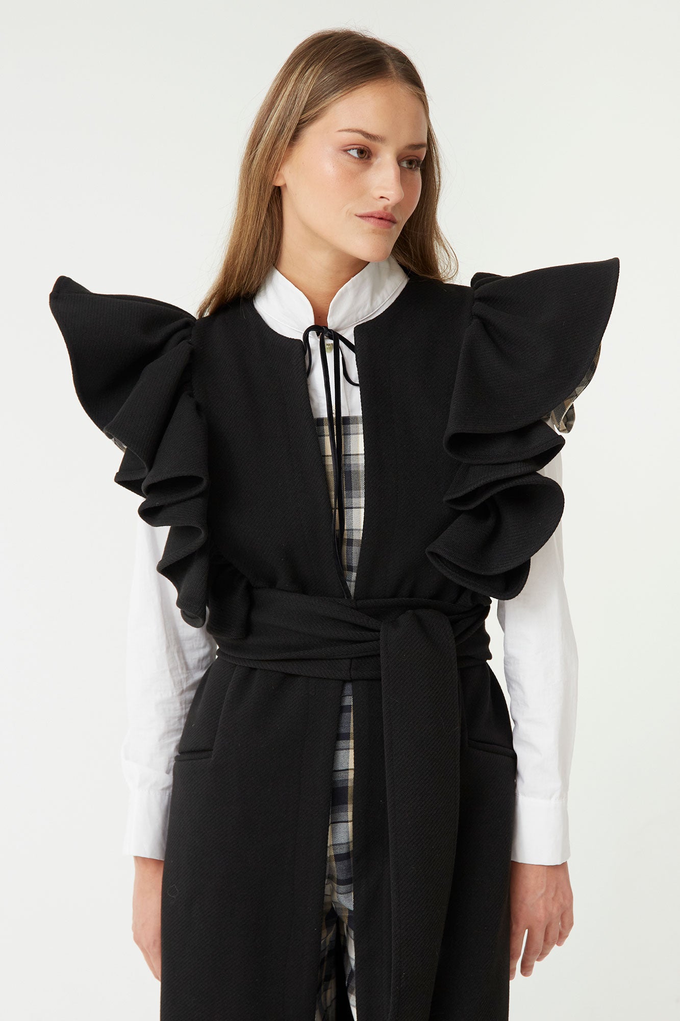 El chaleco largo negro con volantes de Coosy es una prenda sofisticada y versátil que eleva cualquier look con un toque de elegancia y vanguardia. Su diseño destaca por los volantes estructurados en los hombros, que aportan volumen y personalidad, y por su fajín del mismo tejido, ideal para ajustar la cintura y realzar la silueta.