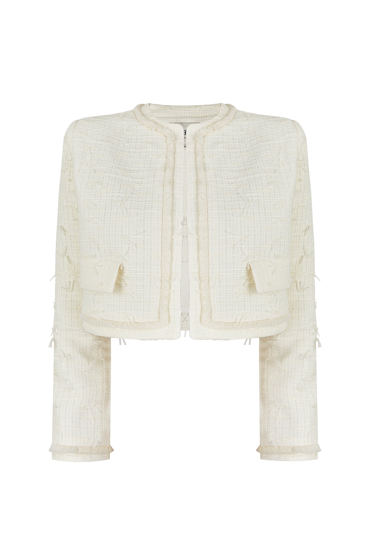 Confeccionada en un tejido texturizado de acabado refinado, su silueta estructurada realza la figura con sutileza, aportando equilibrio y distinción. El diseño limpio, sin excesos, pone en valor la pureza de las líneas y convierte a esta chaqueta en un fondo de armario especial para ocasiones memorables.