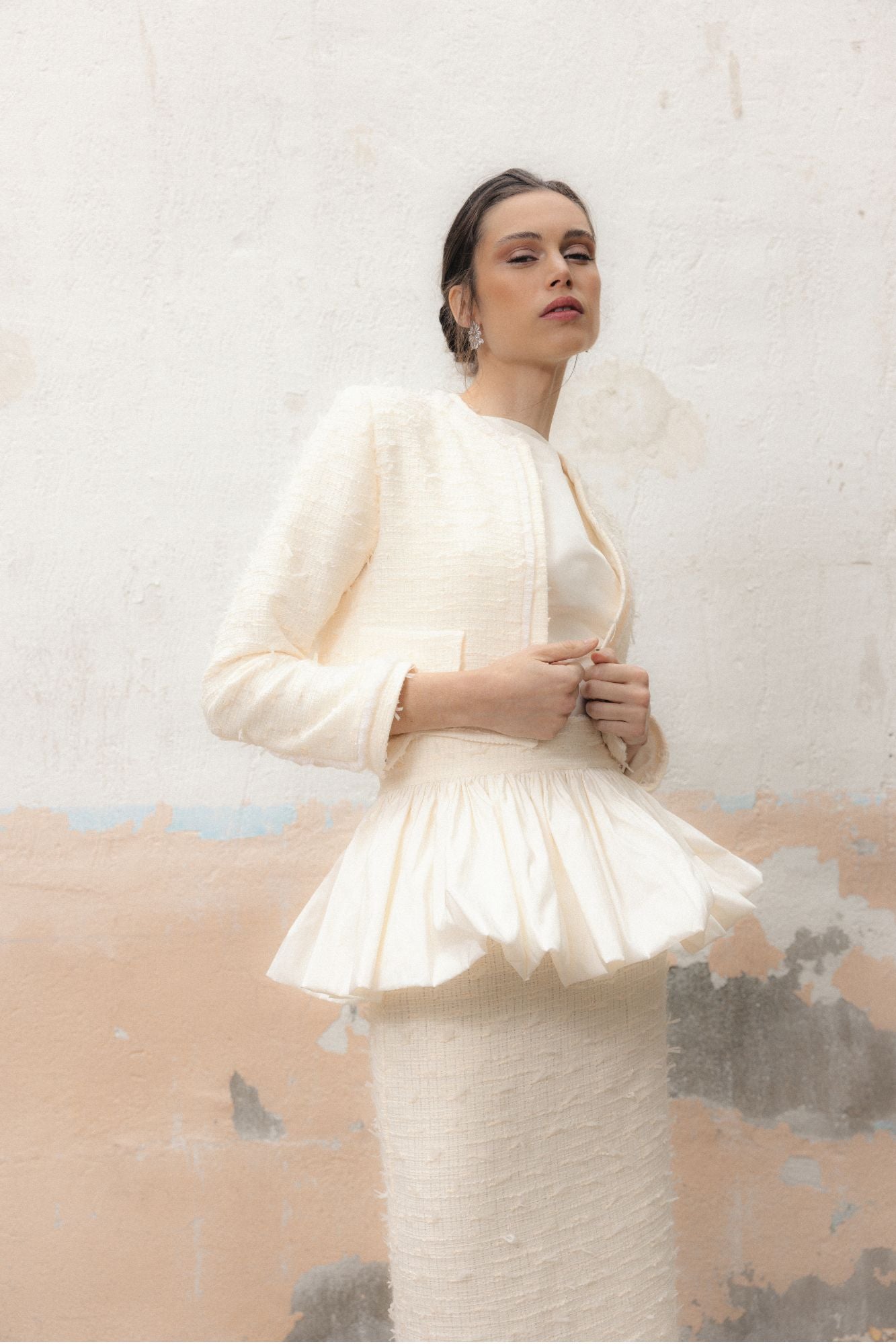Ideal para acompañar vestidos, faldas o conjuntos de la colección, es una prenda versátil que aporta coherencia y sofisticación a looks de novia civil, eventos señalados o celebraciones únicas. Una chaqueta pensada para mujeres que dicen sí a la elegancia atemporal y a los detalles que marcan la diferencia.