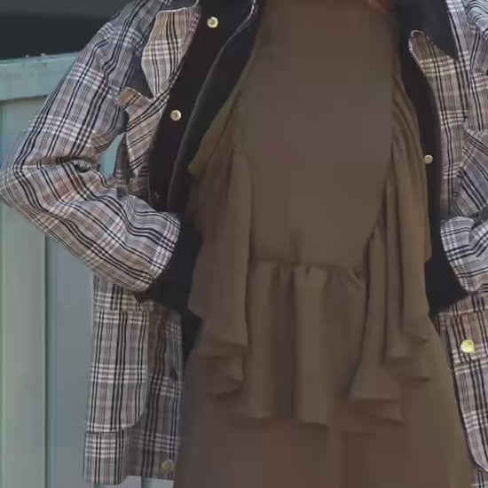 La Gabardina Austen Beige de Coosy es la prenda perfecta para quienes buscan un estilo elegante con un toque romántico. Confeccionada en un tejido de cuadros en tonos beige y marrón, esta gabardina destaca por su diseño estructurado y femenino. Presenta volantes en los hombros, botones dorados en el frontal y una cintura ajustable con cinturón que realza la silueta. Los puños y el cuello en contraste de pana marrón añaden un aire sofisticado y atemporal.