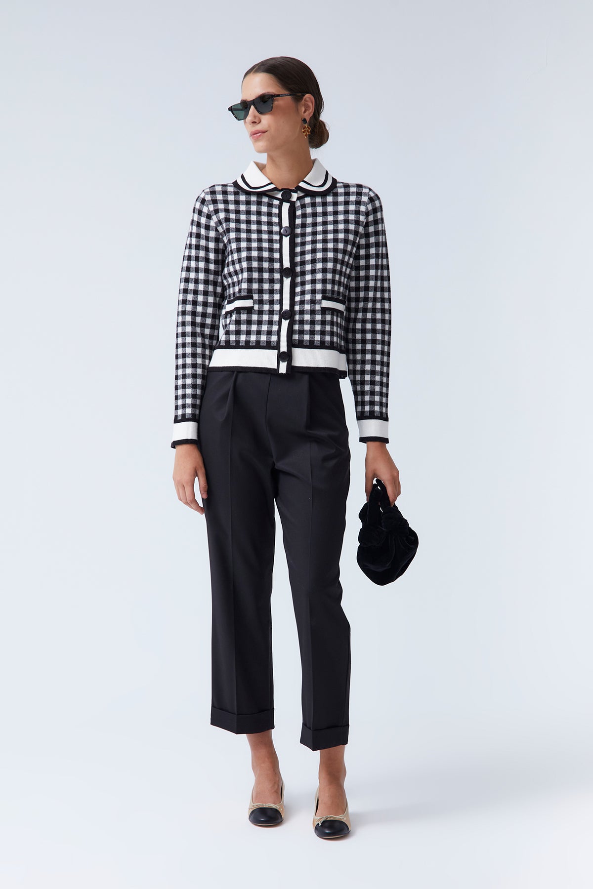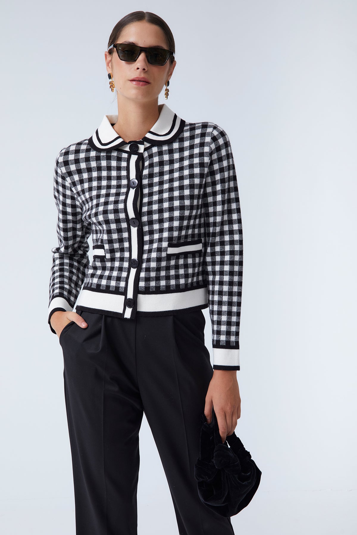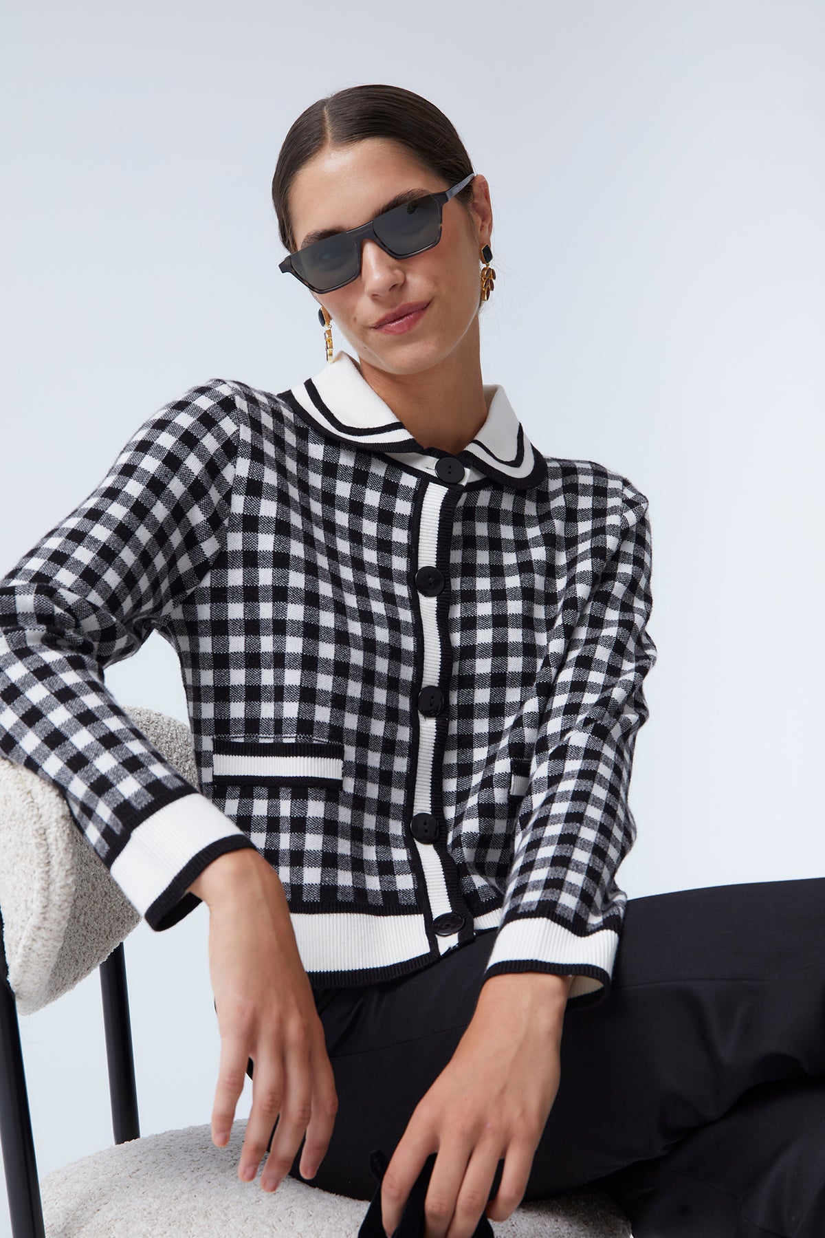 Esta sofisticada chaqueta de punto con estampado de cuadros Vichy en blanco y negro es la elección perfecta para quienes buscan un estilo atemporal y elegante. Con un cuello redondeado y detalles en contraste, su diseño clásico se actualiza con un aire contemporáneo. Los botones frontales añaden un toque refinado, mientras que los detalles de ribete blanco en los puños y el bajo le dan un acabado pulido.