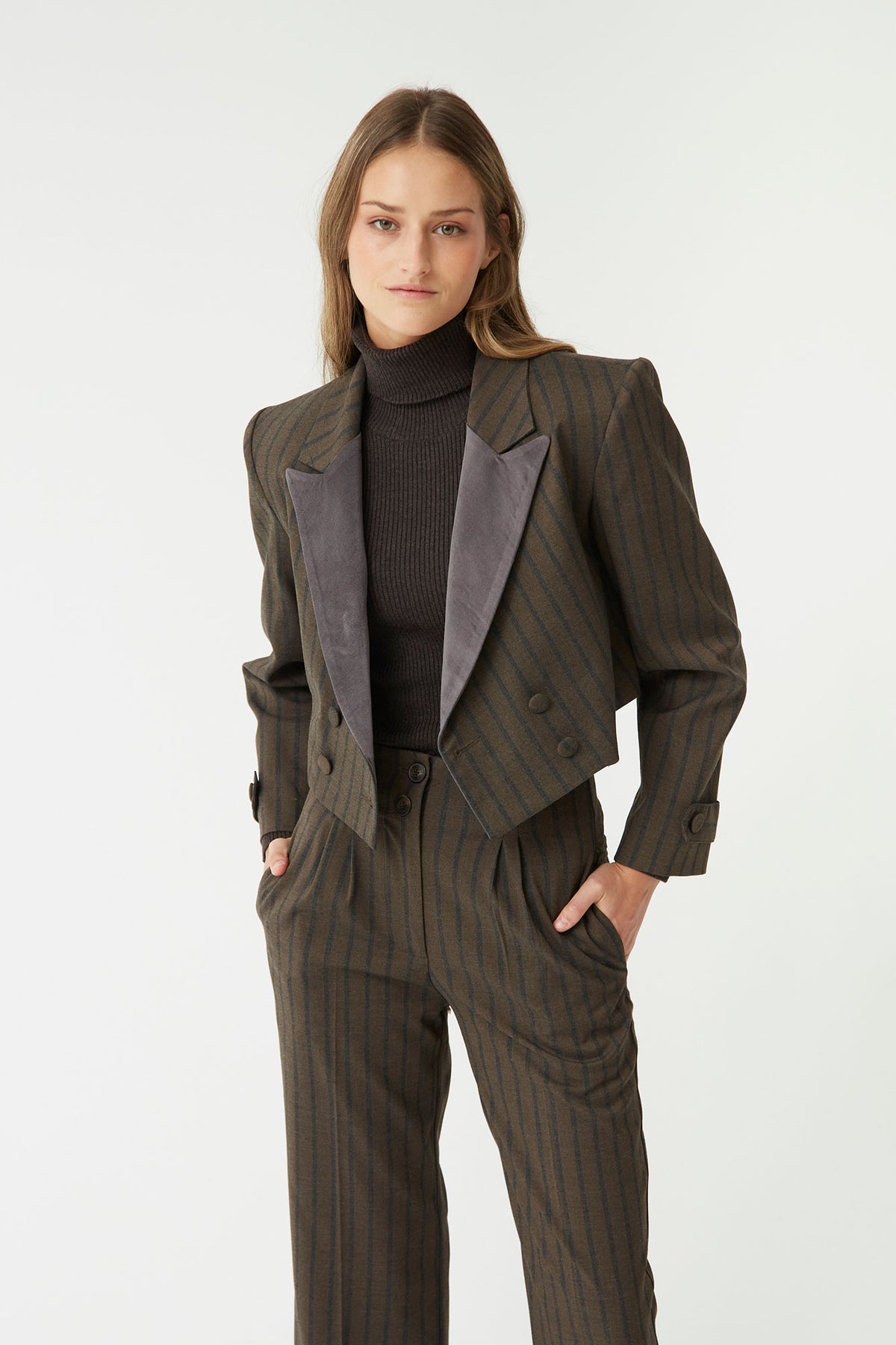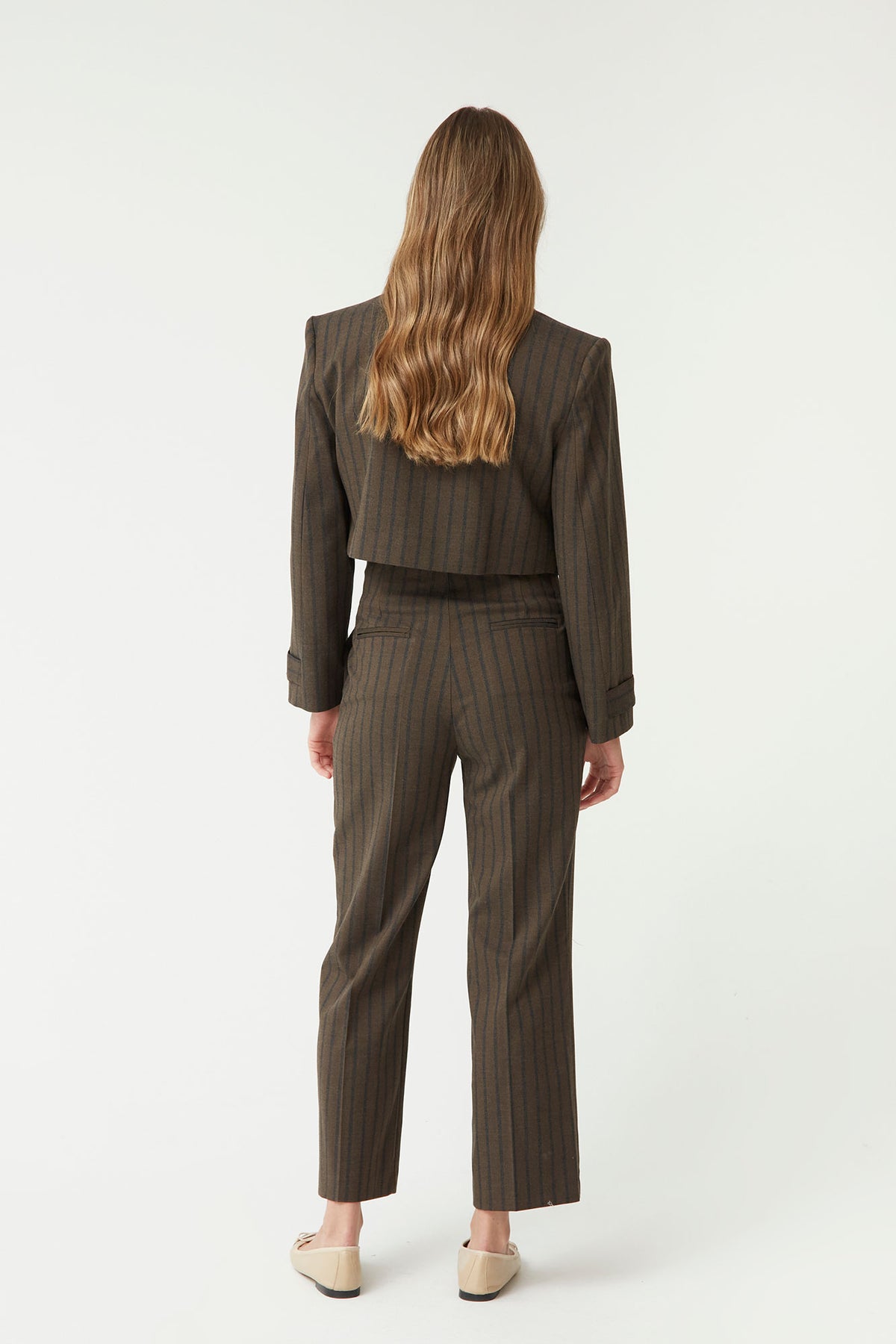 Confeccionada en un tejido de rayas marrón y gris con textura suave, esta chaqueta destaca por su doble botonadura frontal y hombros marcados, que aportan fuerza y presencia al look. Perfecta para combinar con el pantalón a juego y crear un conjunto impecable o para dar un toque de estilo a tus looks de oficina o de día.