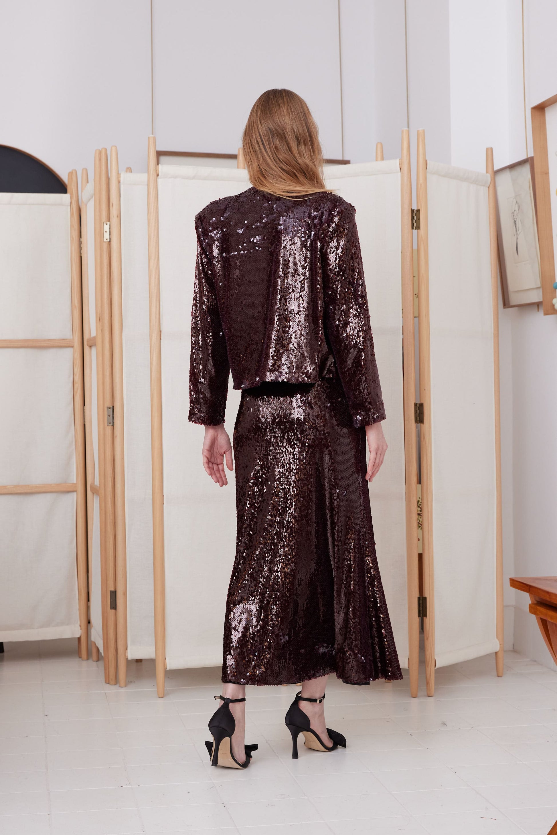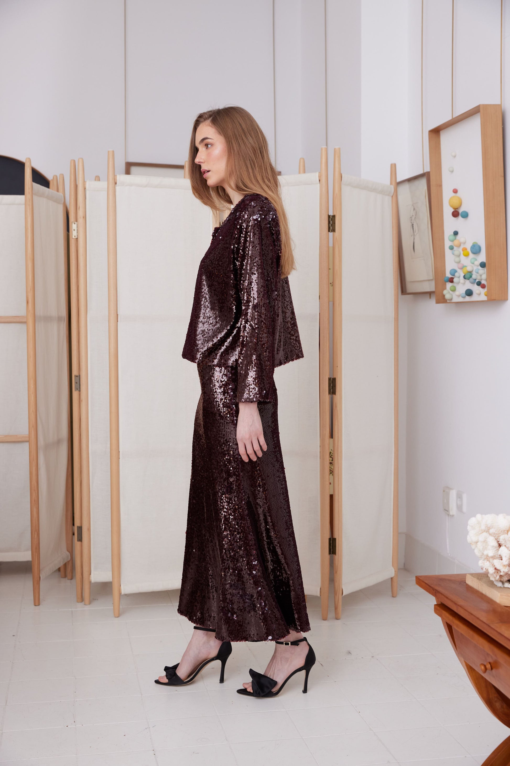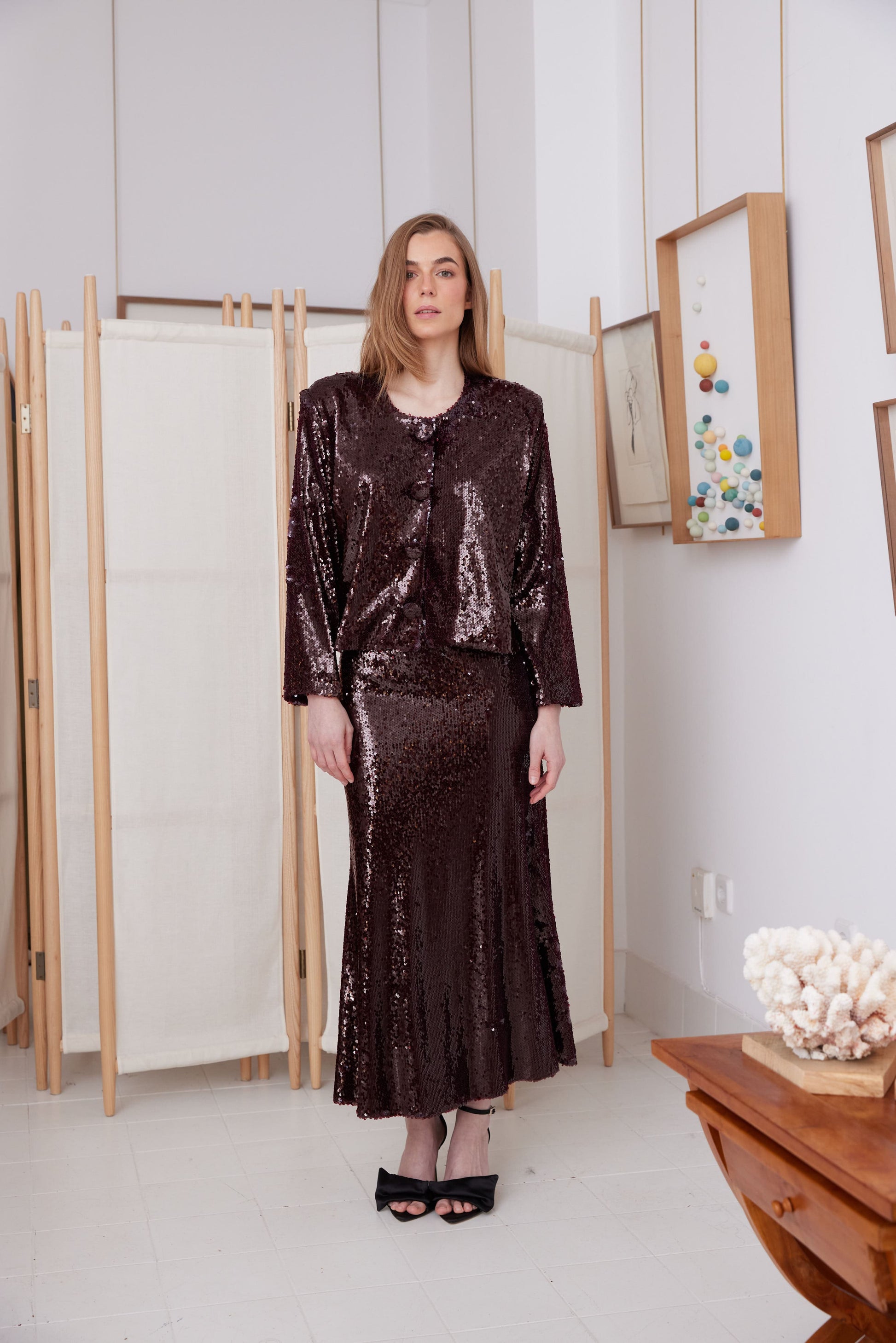 Deslumbra con la chaqueta de paillettes de Coosy Studio, una pieza sofisticada que eleva cualquier look con su acabado brillante y elegante. Confeccionada en un tono coñac, su diseño de corte recto y botones forrados aporta un equilibrio perfecto entre glamour y sofisticación.