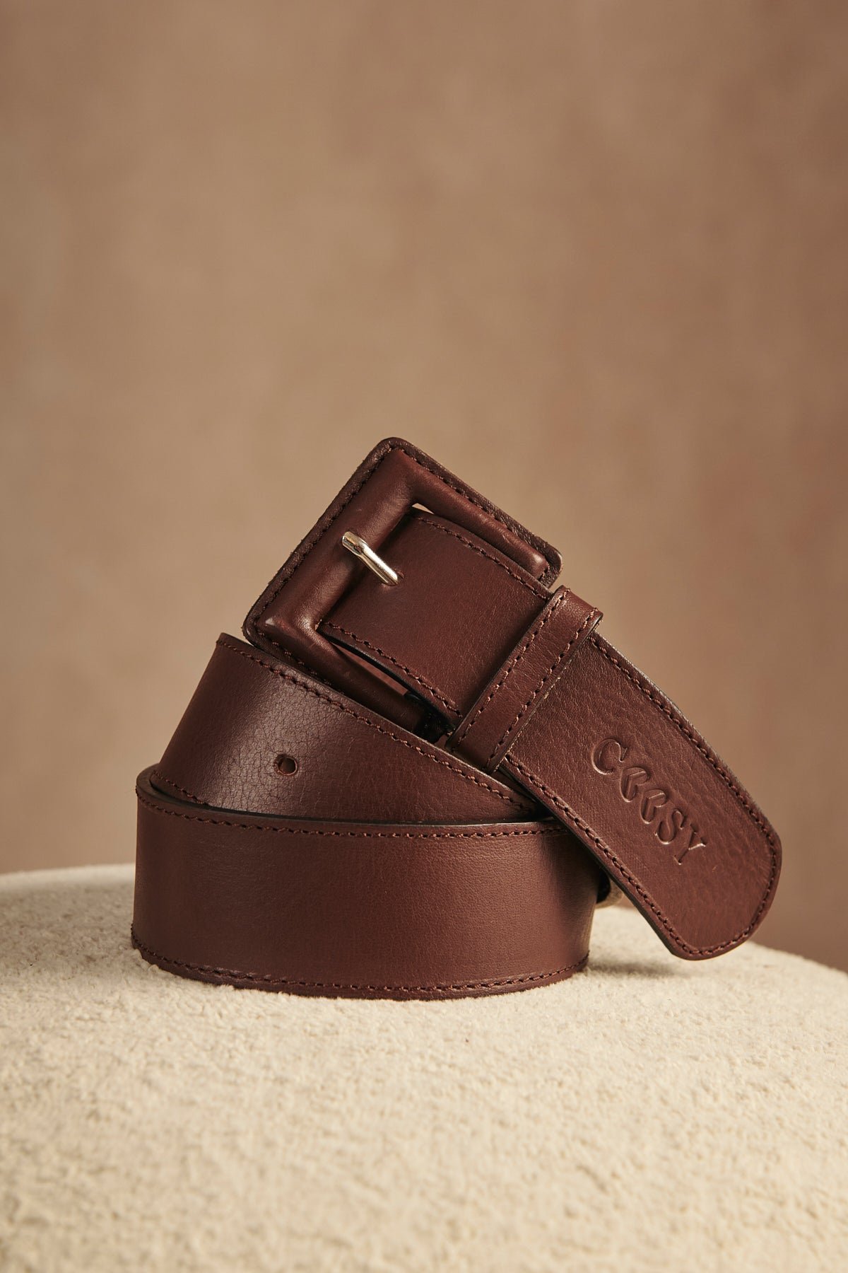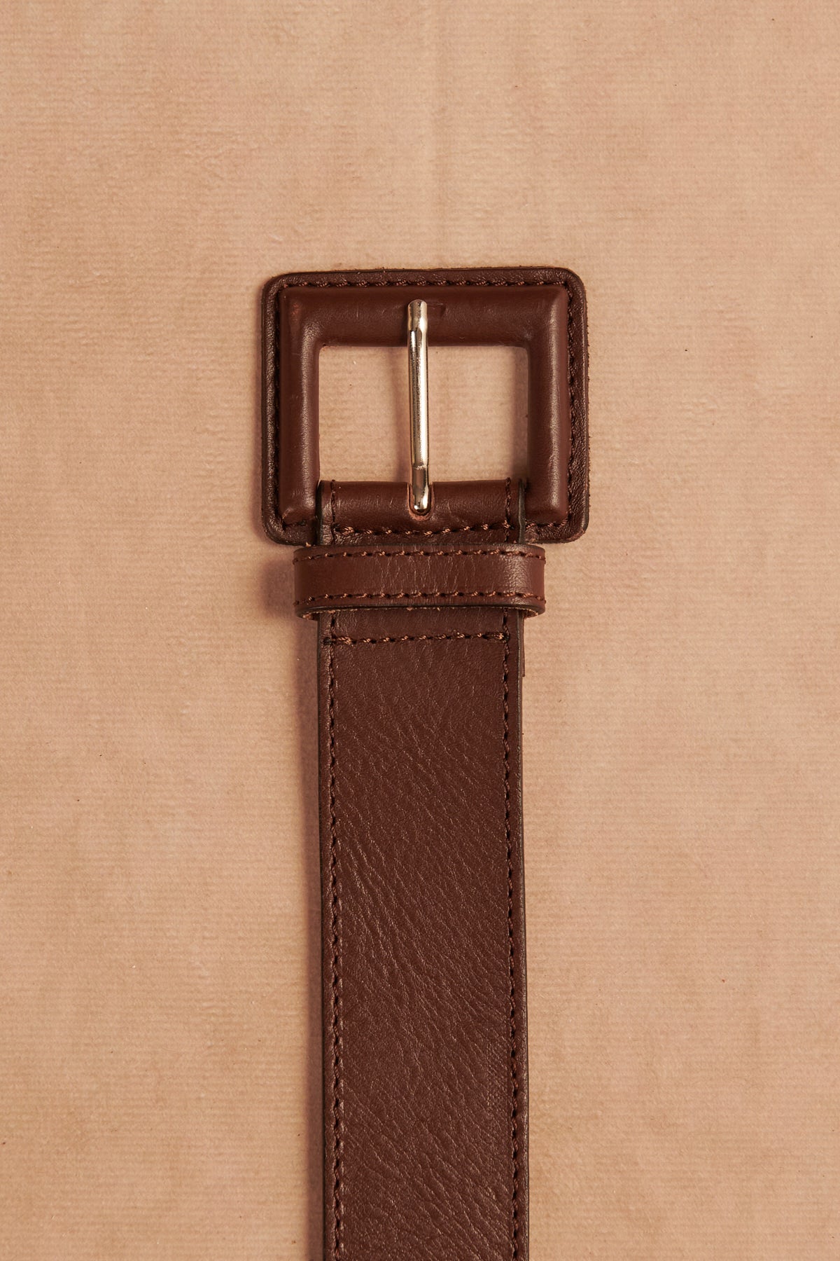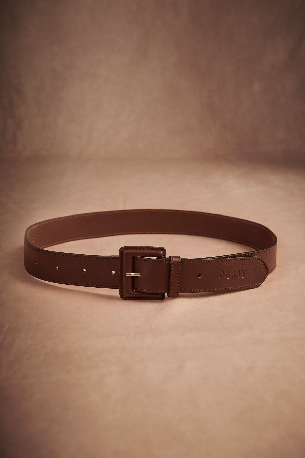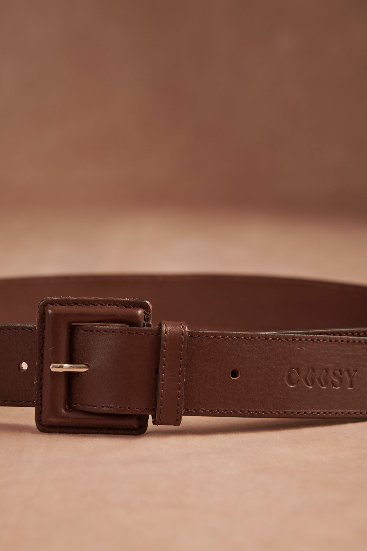 Cinturón confeccionado en piel color chocolate. Cierre delantero con hebilla forrada en piel.