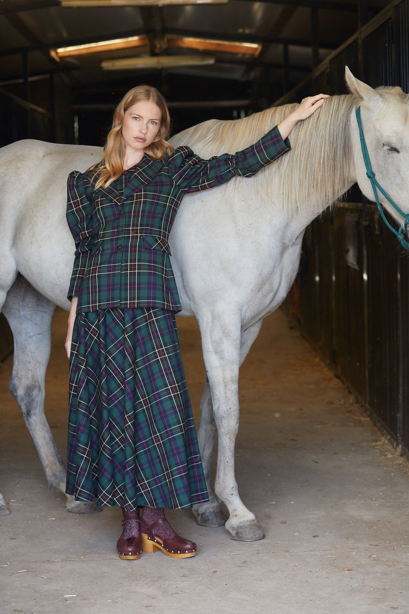 Esta falda midi de cuadros verdes y azul marino combina estilo clásico y elegancia contemporánea. Con un corte evasé fluido y tejido de inspiración tartán, es perfecta para looks de entretiempo o de otoño. Su diseño de talle alto estiliza la figura y aporta movimiento con cada paso.