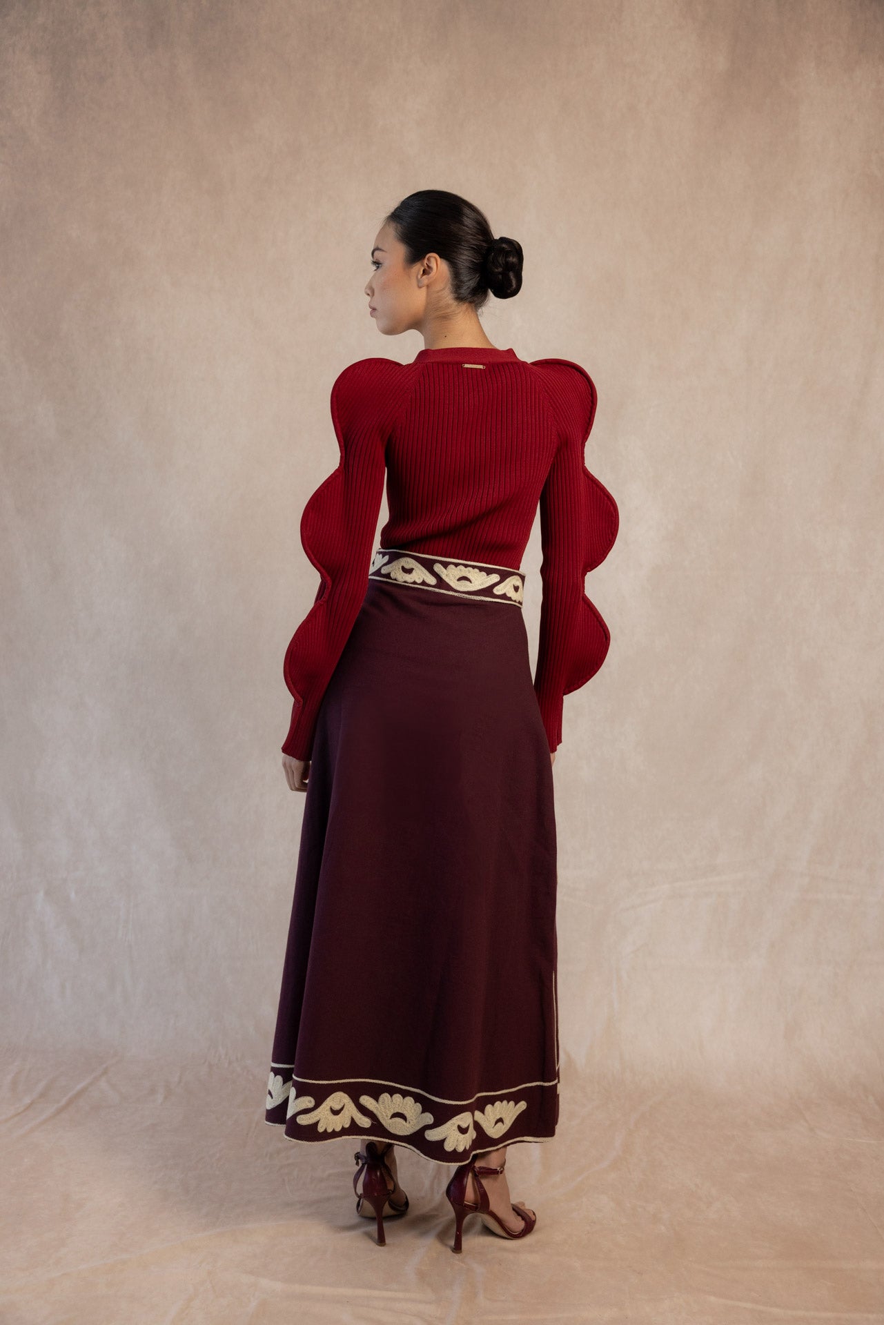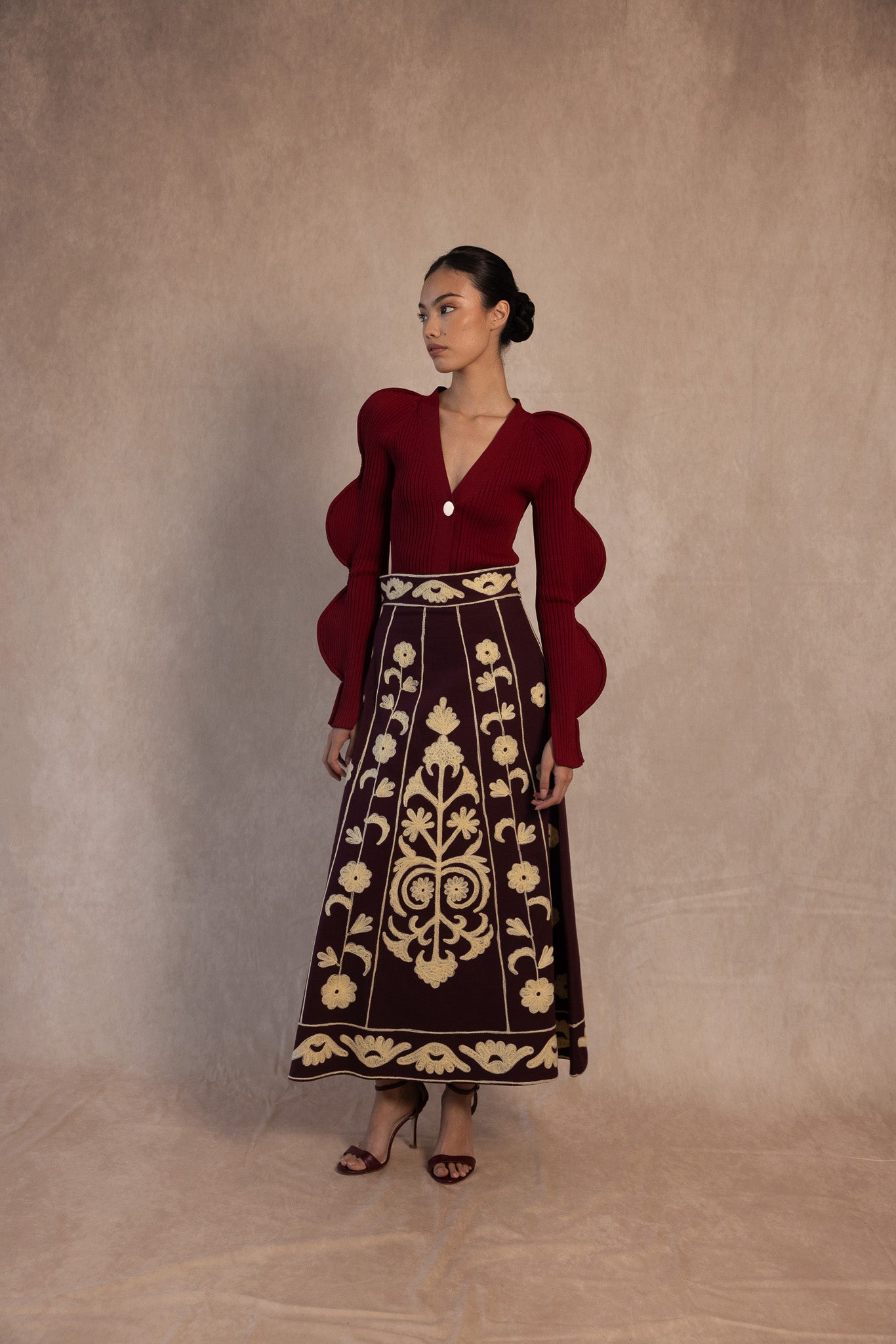 Atrévete a destacar con esta falda midi burdeos de inspiración artesanal, una pieza exclusiva de Coosy que combina elegancia, originalidad y tendencia. Confeccionada en tejido estructurado de alta calidad, presenta un bordado floral en tonos beige que aporta un aire sofisticado y bohemio. Su corte en línea A estiliza la figura y realza la cintura, creando un look femenino y favorecedor.