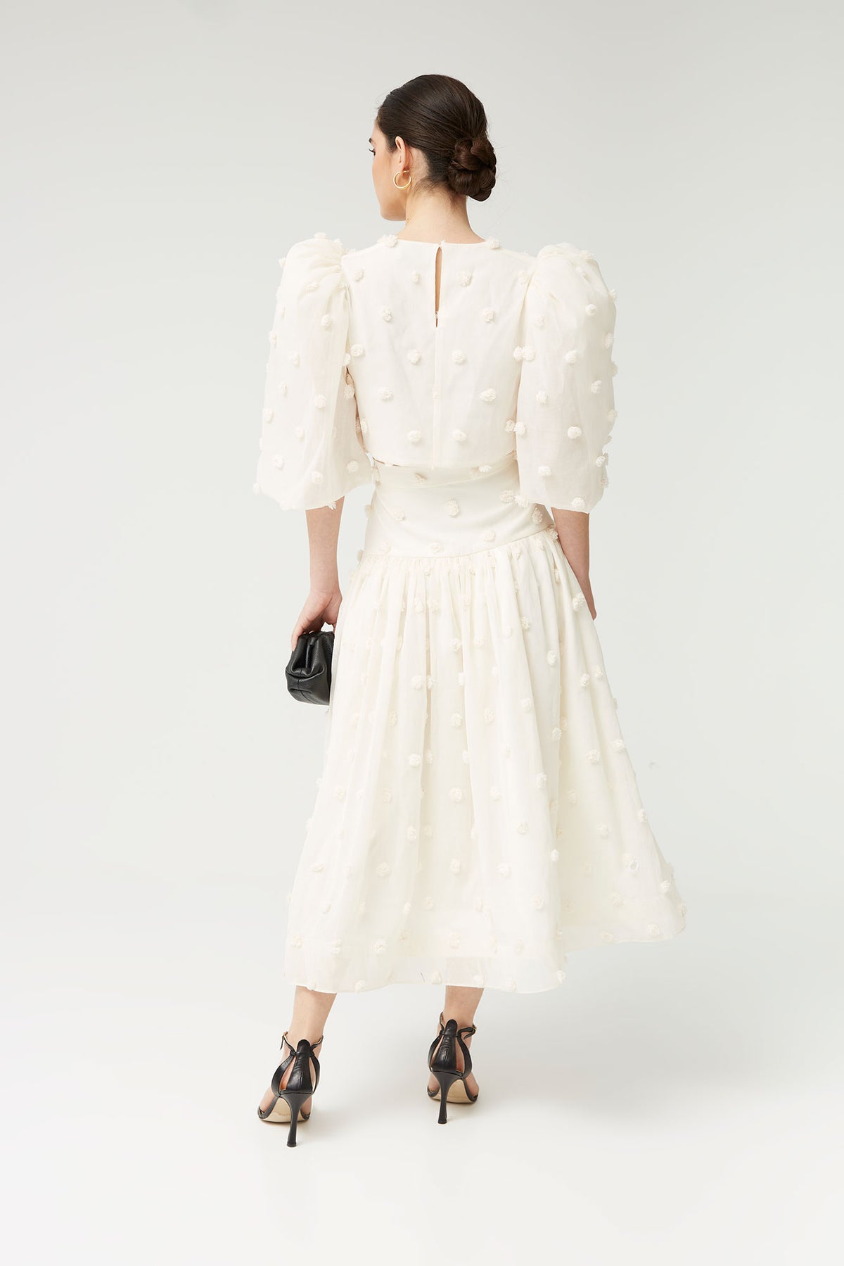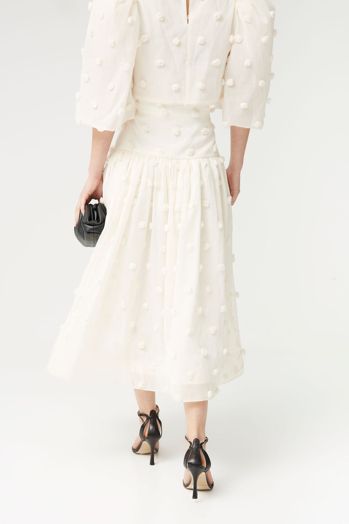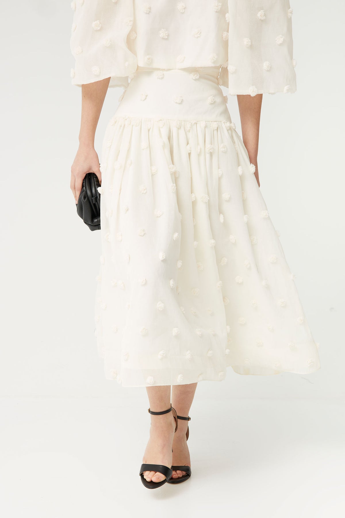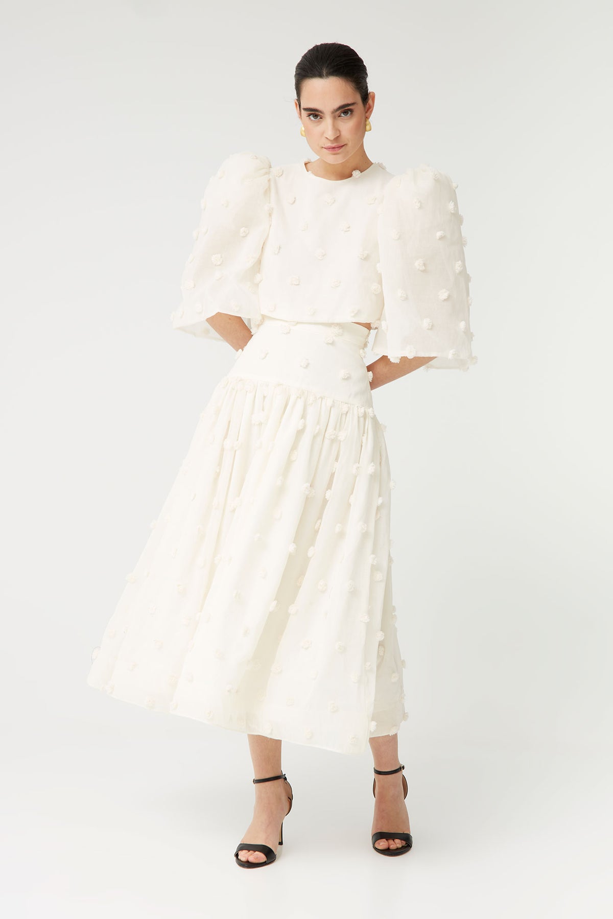 Esta falda midi blanca con relieve es una pieza delicada y sofisticada que aporta movimiento y feminidad a cualquier look. Confeccionada en un tejido ligero con detalle de plumeti en relieve, su diseño añade textura y un acabado elegante, perfecto para estilismos especiales.